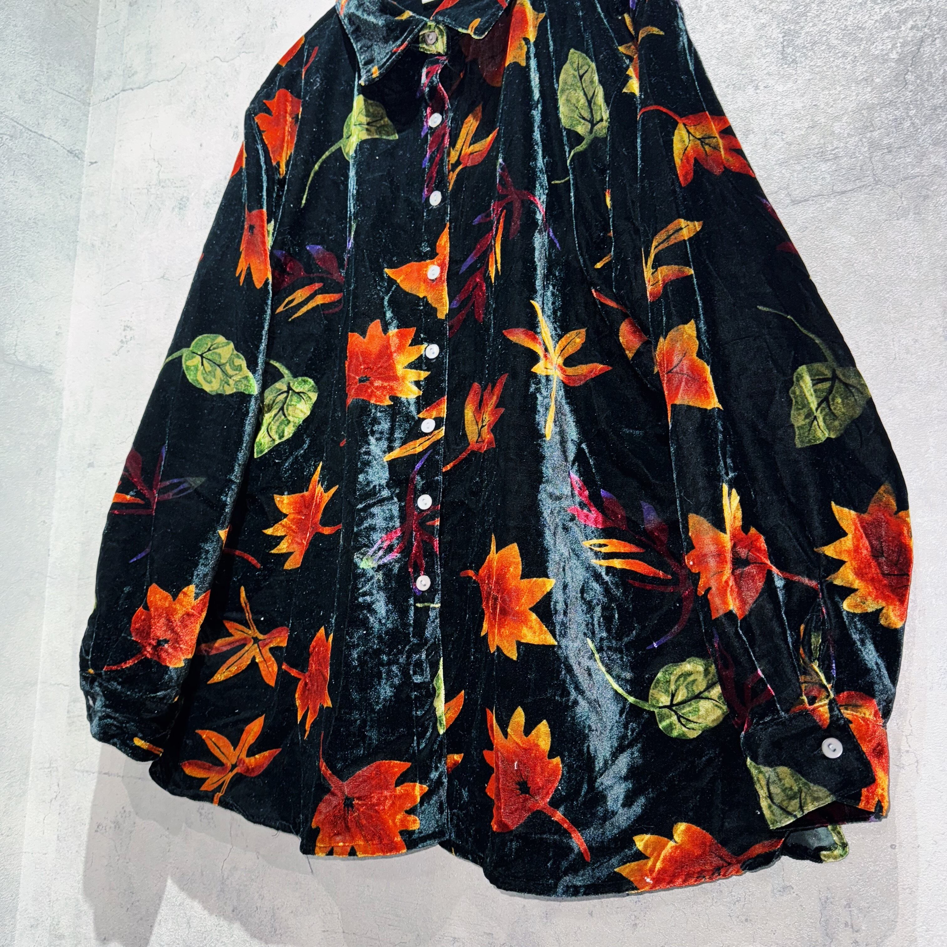 ”デッドストック”ベルベットマテリアルリーフパターンデザインシャツ