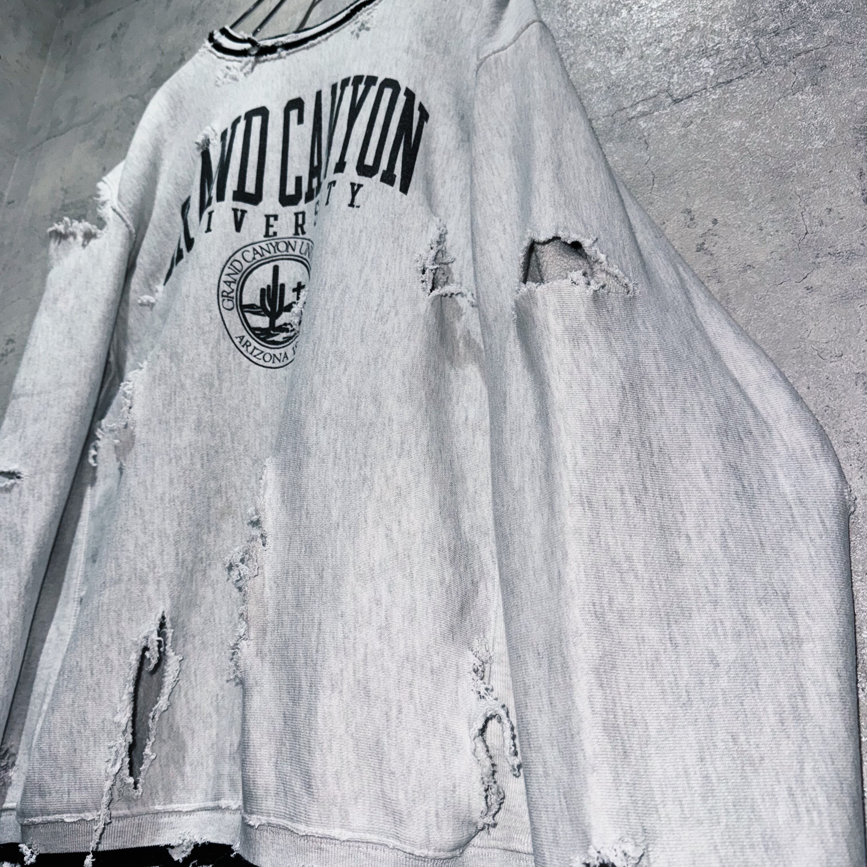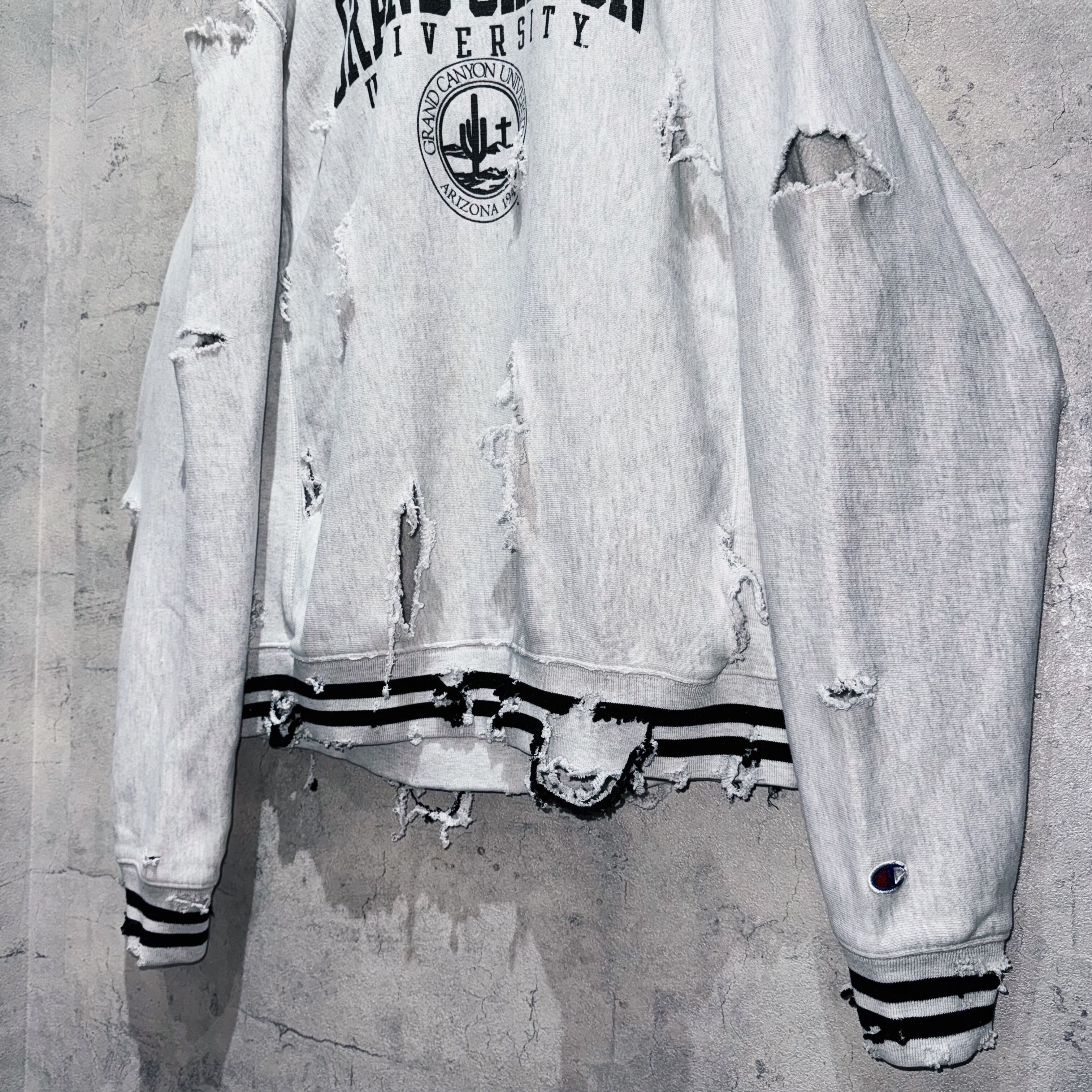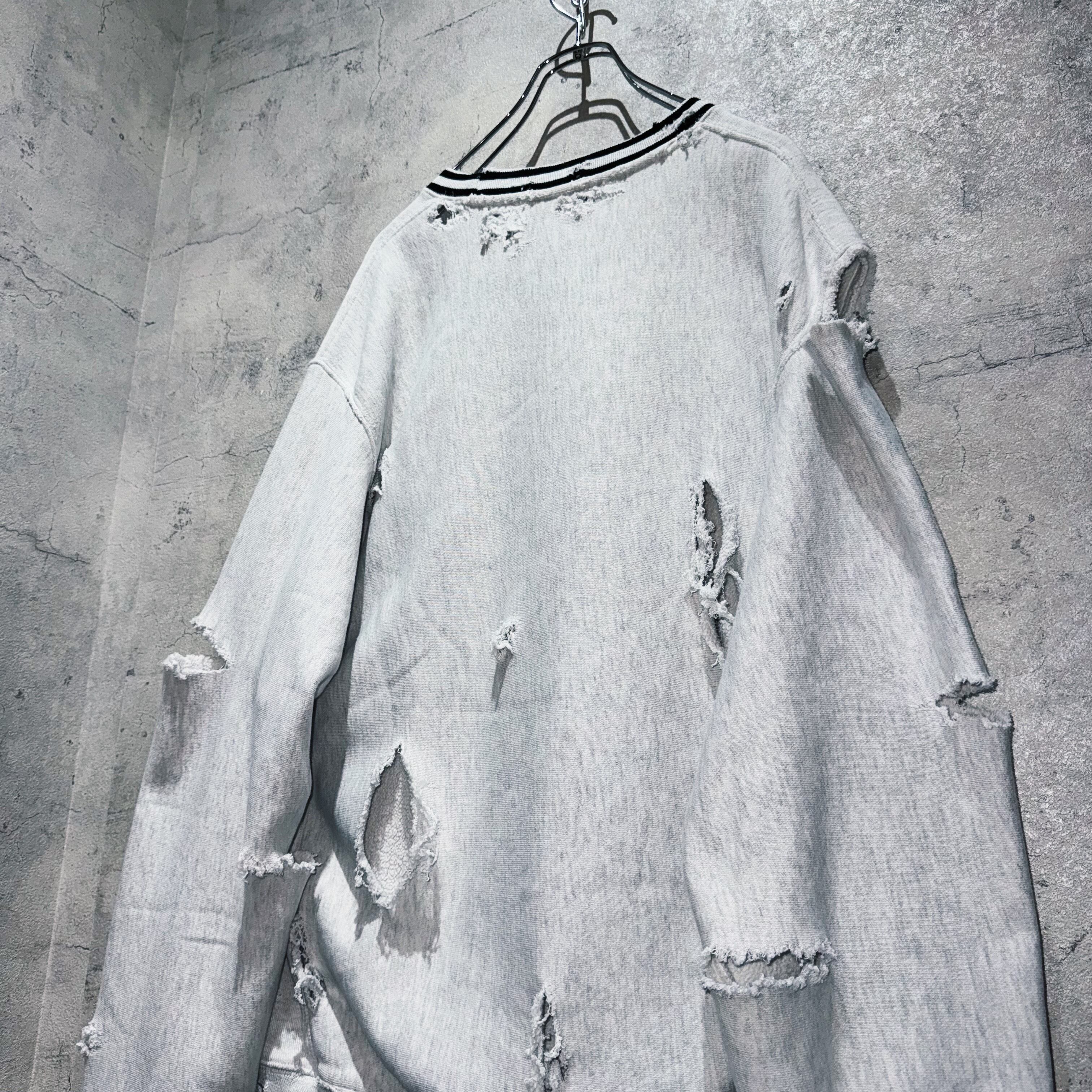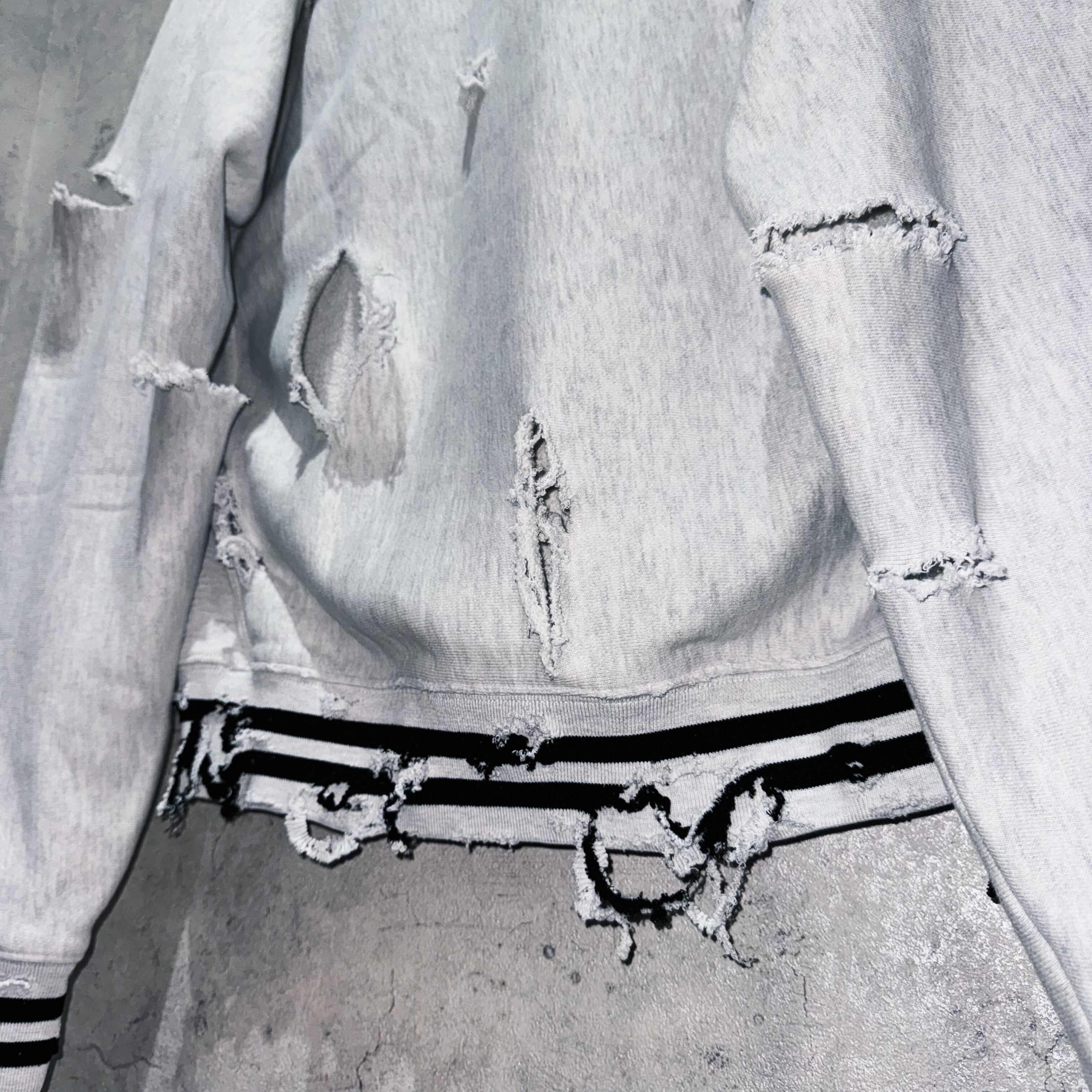 そんなスウェットを贅沢にボロカスタム。”Champion”らしいカレッジプリントでグレーのボディにブラックのグラフィックがアクセントになっており、裾にラインが入っているなどボディのデザインも素晴らしいですね。