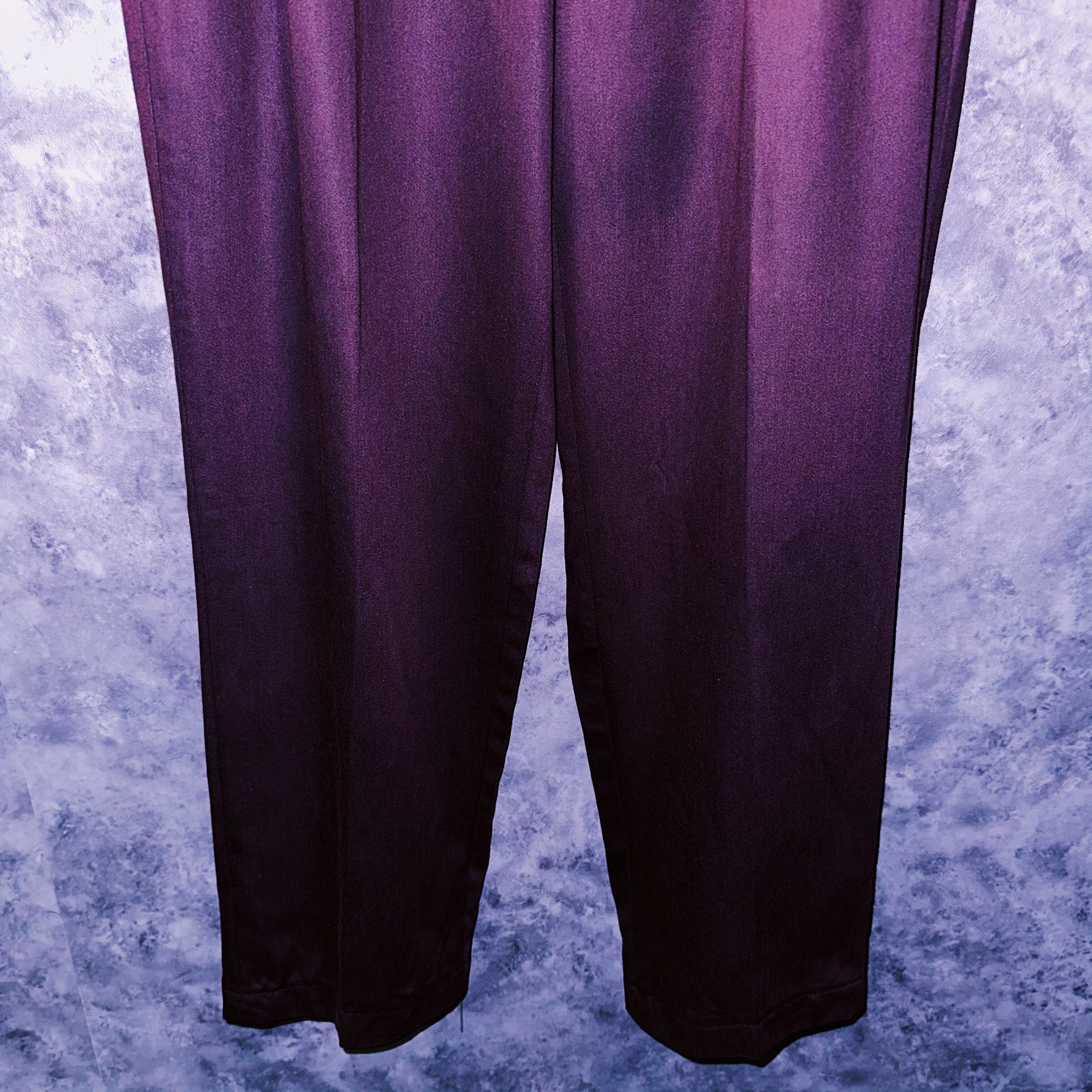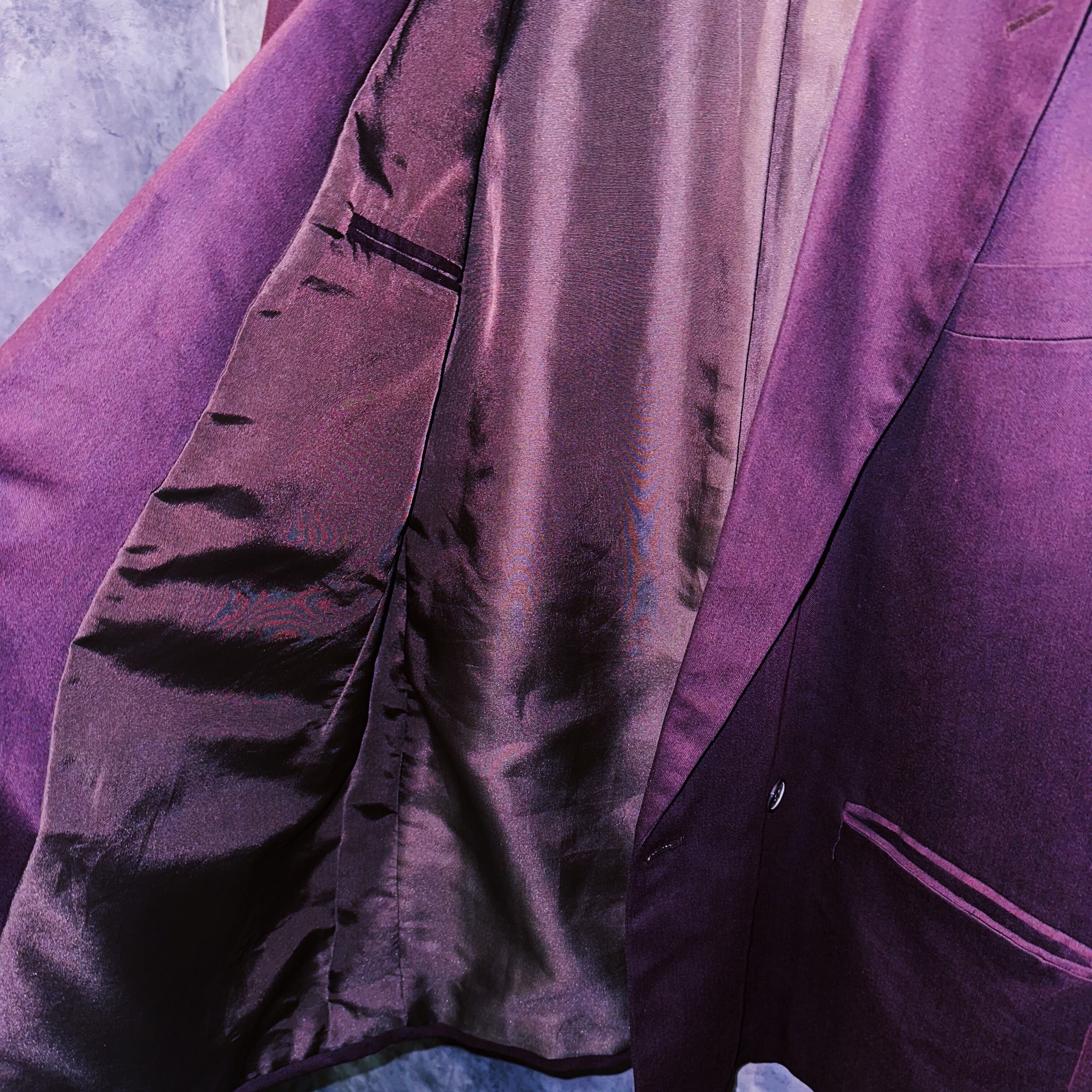 少し赤みを帯びたレディッシュブラウンカラーを纏い、美しく程よい光沢感を身に包んだ高級感溢れるセットアップ。今っぽいパワーショルダーからウエストに向かうにかけ狭くなっていく逆三角形シルエットは、40年代の「力強さ」を彷彿させていますね。