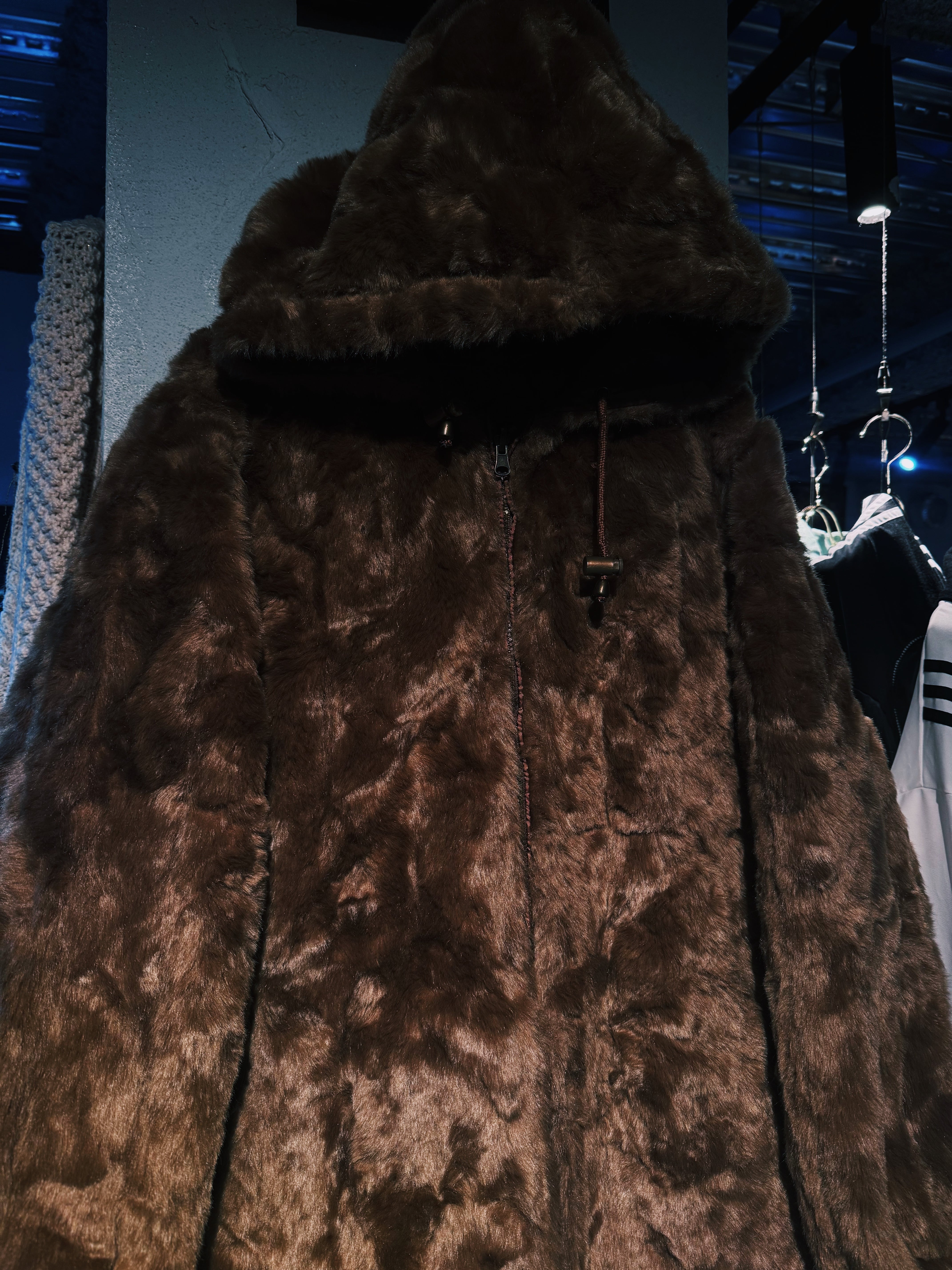 ヴィンテージのファーアイテムはフックで引っ掛けて止めるものが多いのですが、今回は着脱が楽々可能なジップタイプというのも嬉しいポイント。フードが搭載されているのでエレガンスなスタイリングにはもちろん、ラグジュアリーストリートにまで落とし込めるかと。さらに今回はリバーシブル仕様なので裏返せば光沢のあるブラウンカラーのジャケットに。