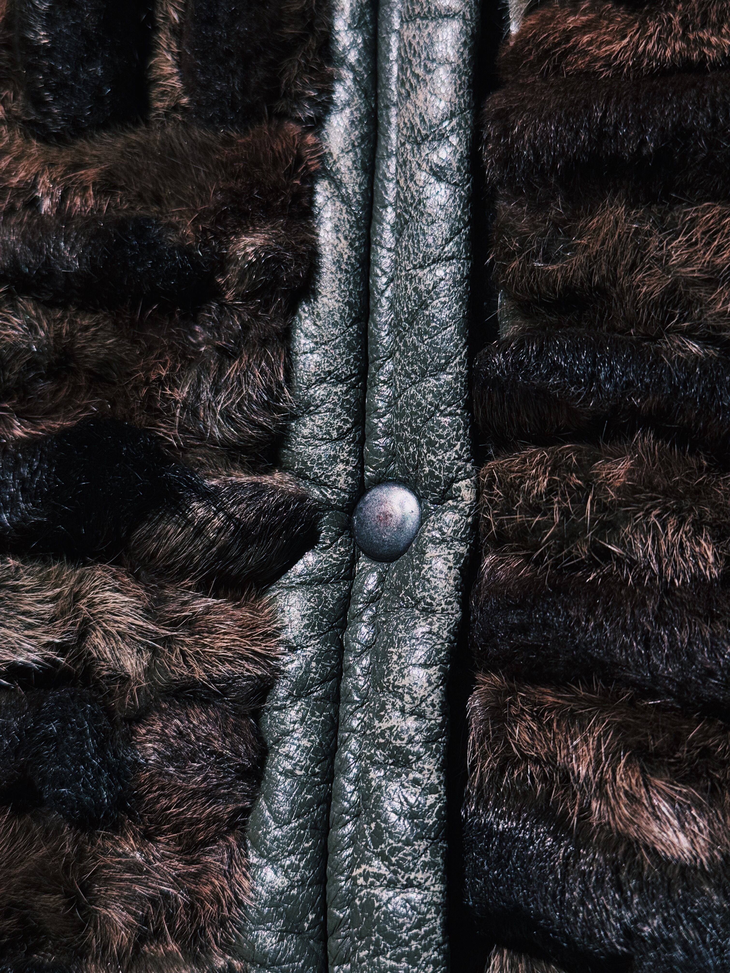 ヴィンテージのファーアイテムはフックで引っ掛けて止めるものが多いのですが、今回は着脱が楽々可能なスナップボタンというのも嬉しいポイント。