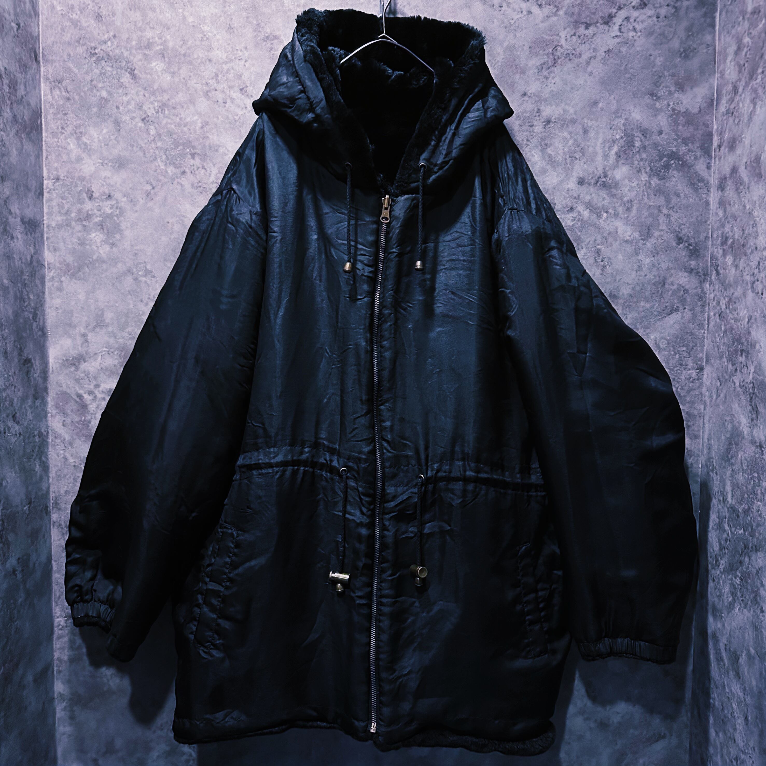 ヴィンテージブラックフェイクファーデザインリバーシブルルーズフーディージャケット