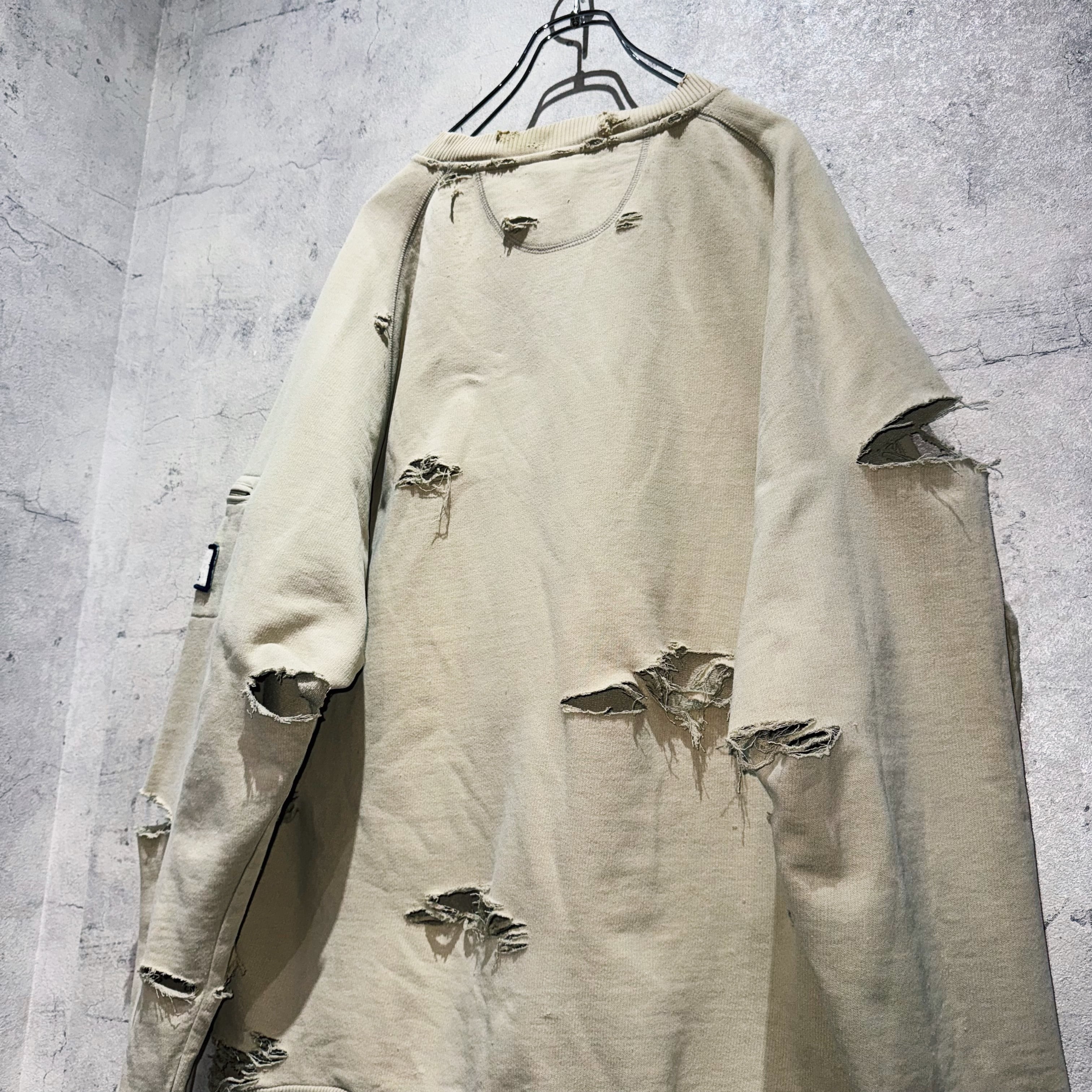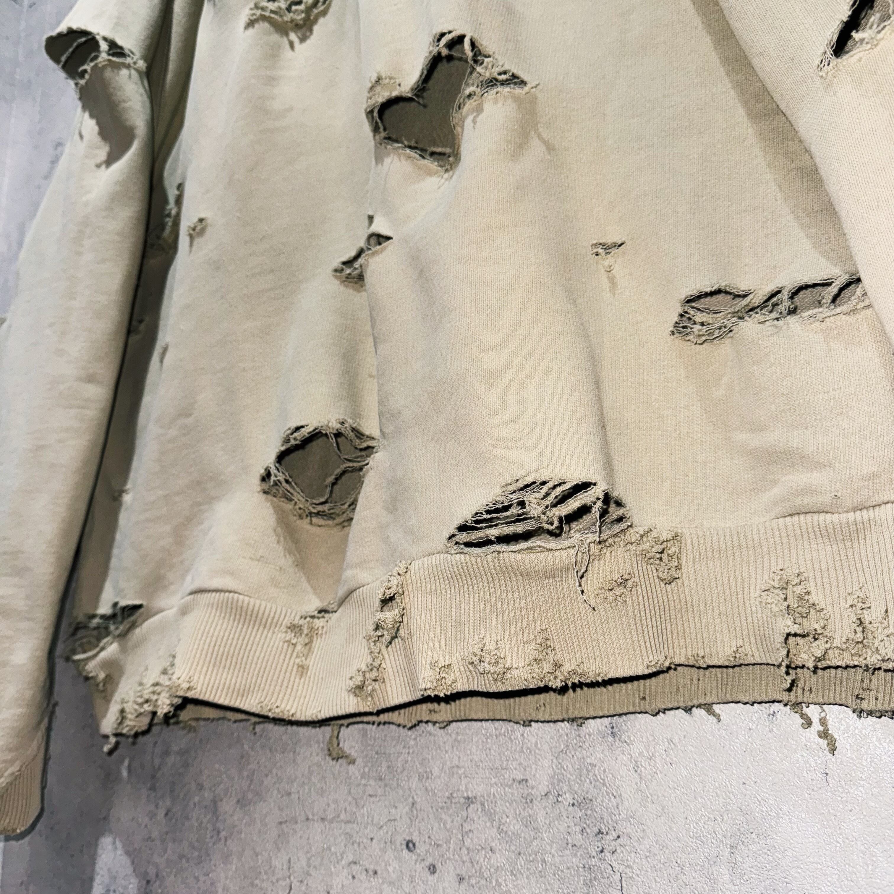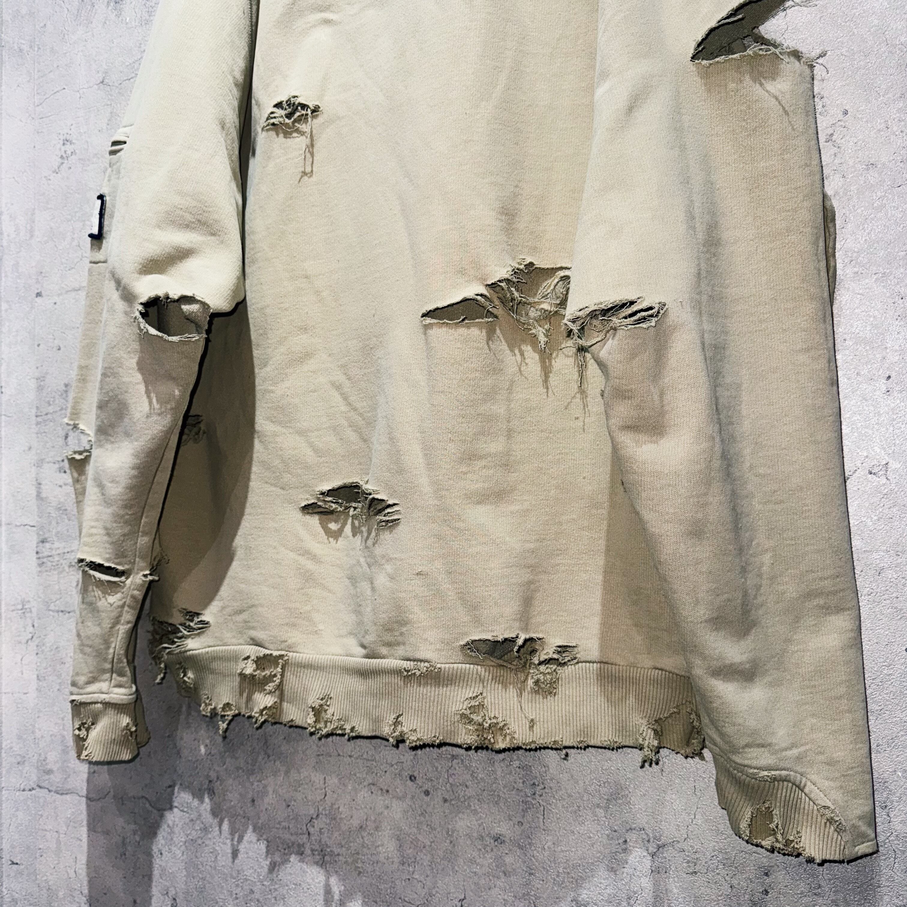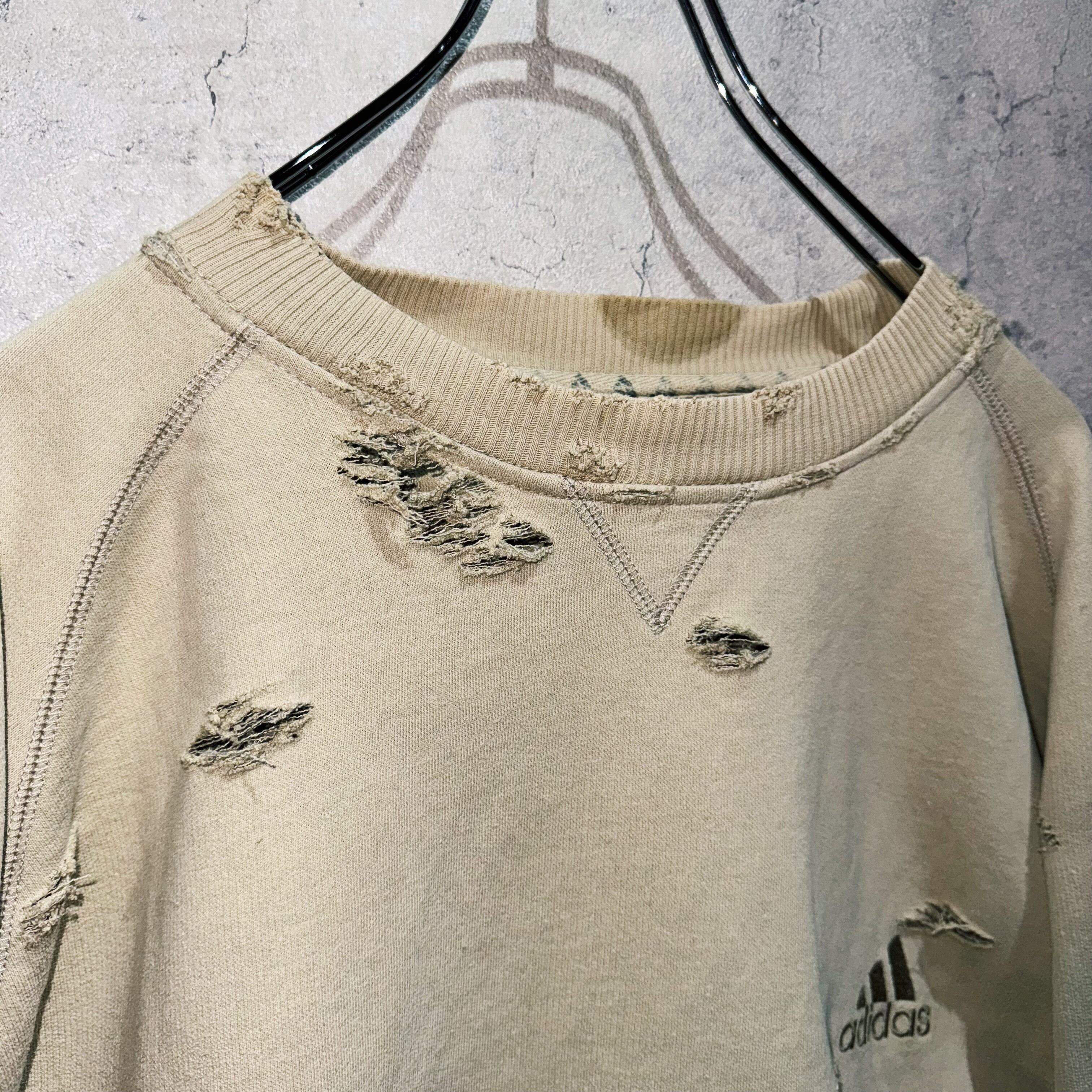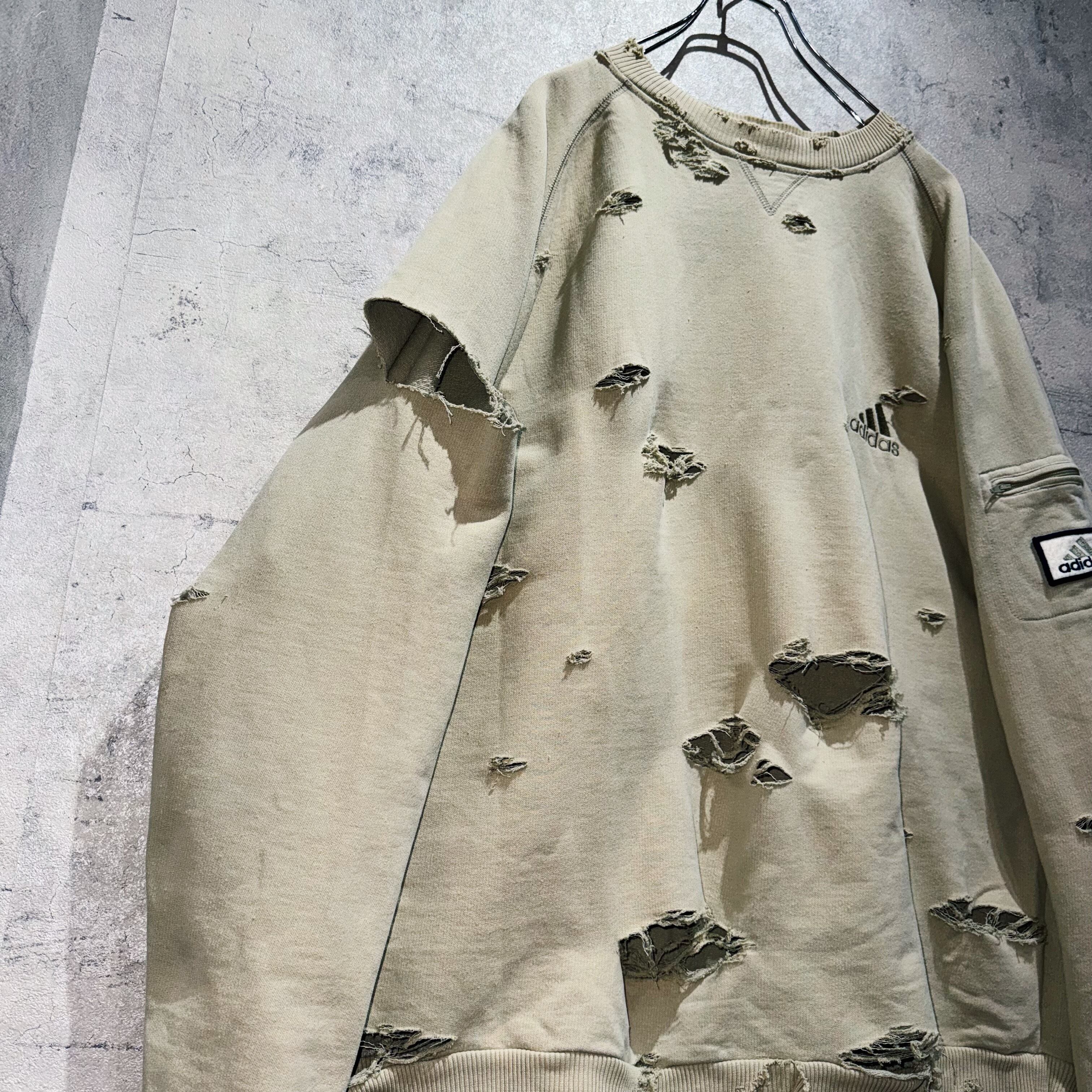 ベーシックで品格のあるベージュカラーに身を包み、胸元に”ADIDAS ”の90年代といえばのパフォーマンスロゴが刺繍されてプルオーバースウェット。左袖にも同様のロゴがワッペンで施されています。そんなスウェットを贅沢に当店のハイクオリティなデザインでボロカスタム。