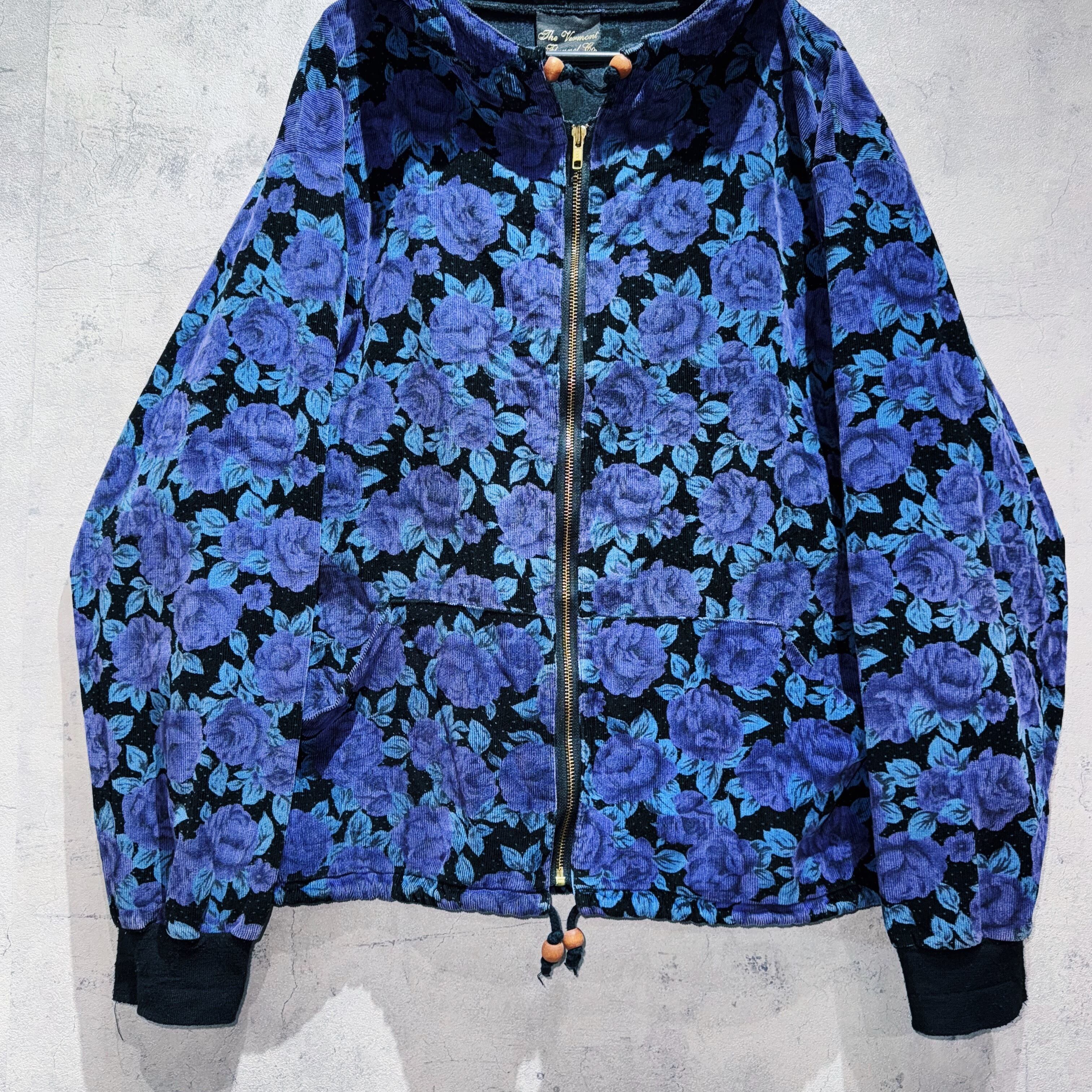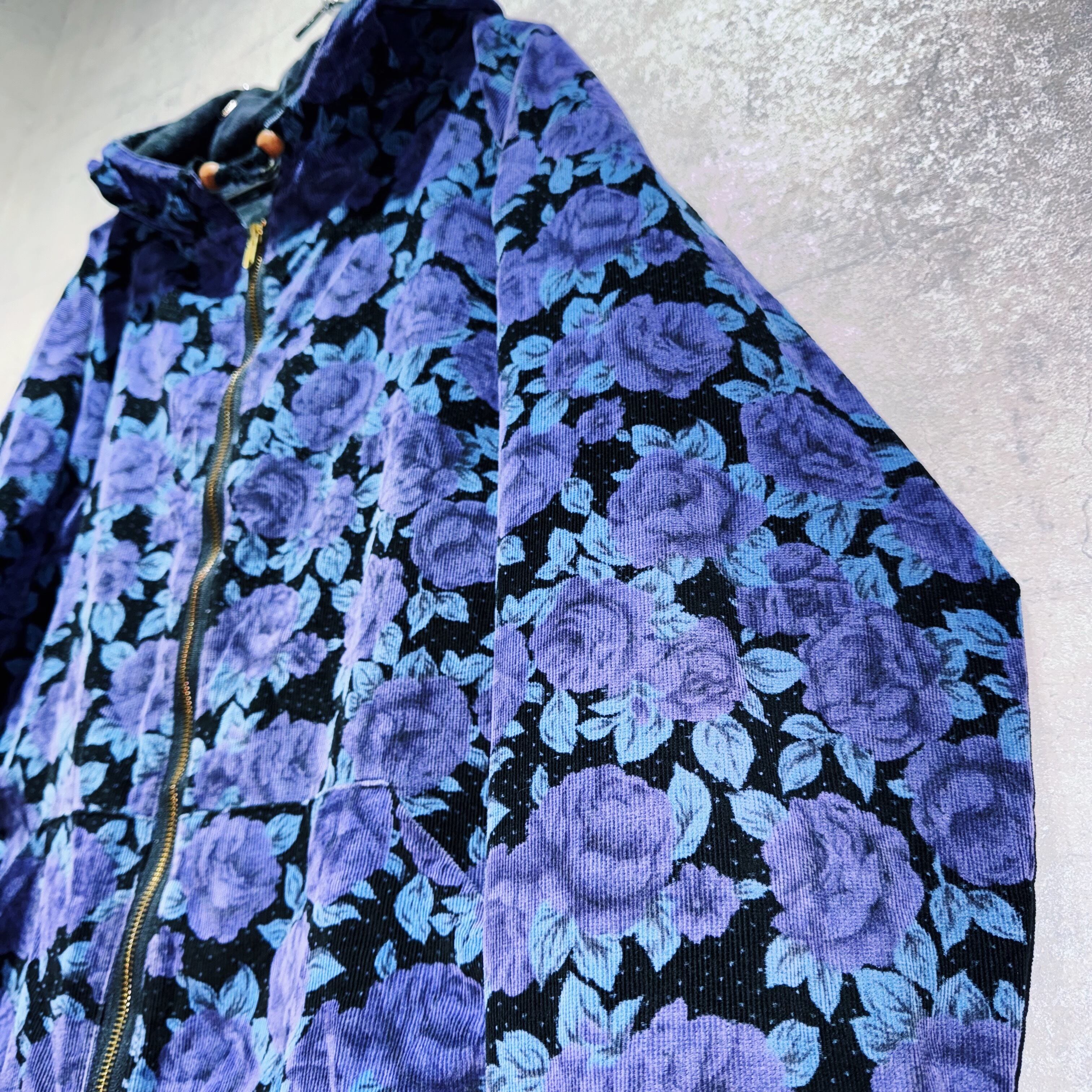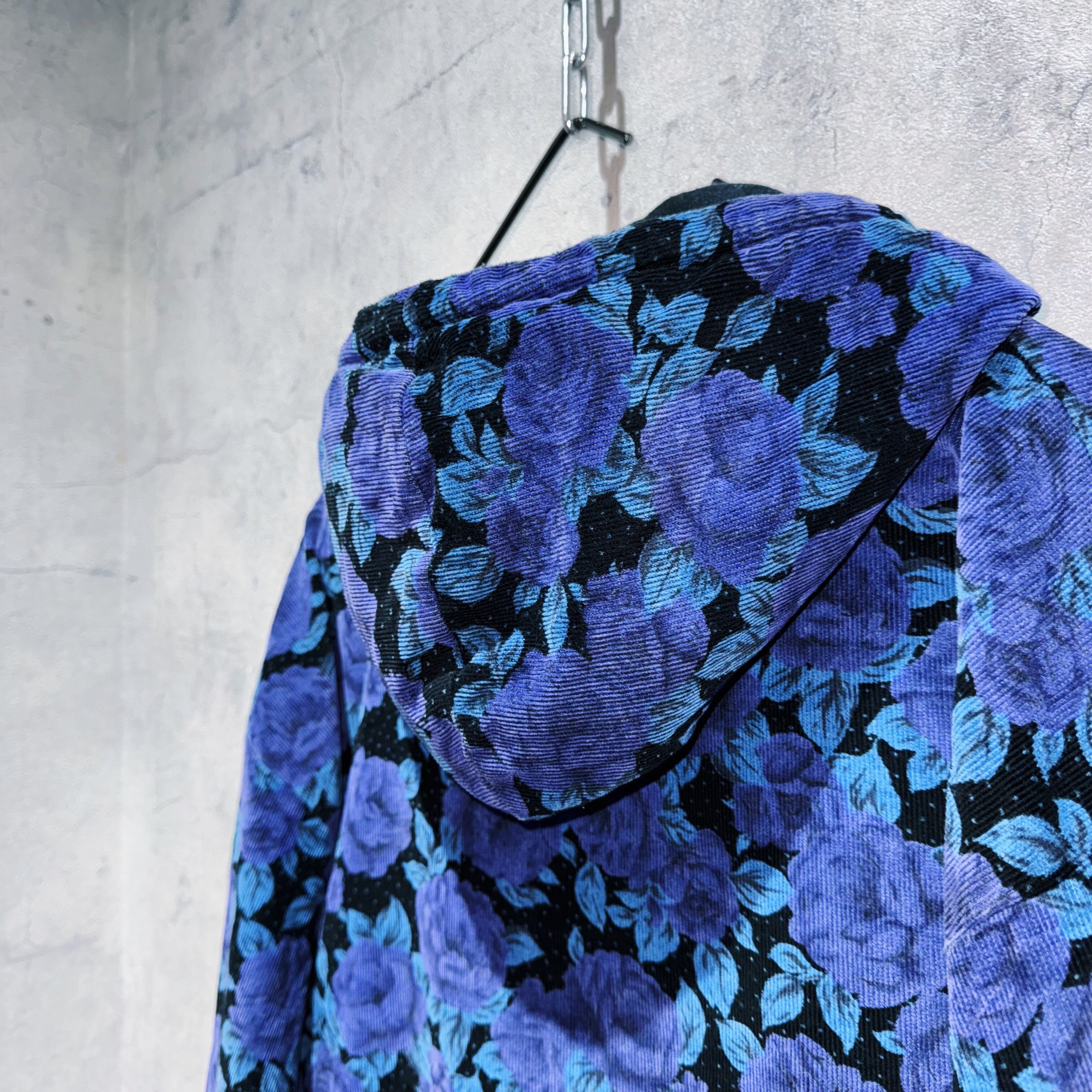 妖麗に咲き誇る紫の薔薇柄を前面にあしらったフーディーライトジャケット。圧巻のカラーリングに加え、異素材の高級感を演出してくれるコーデュロイを採用することで一際存在感のある仕上がりに。