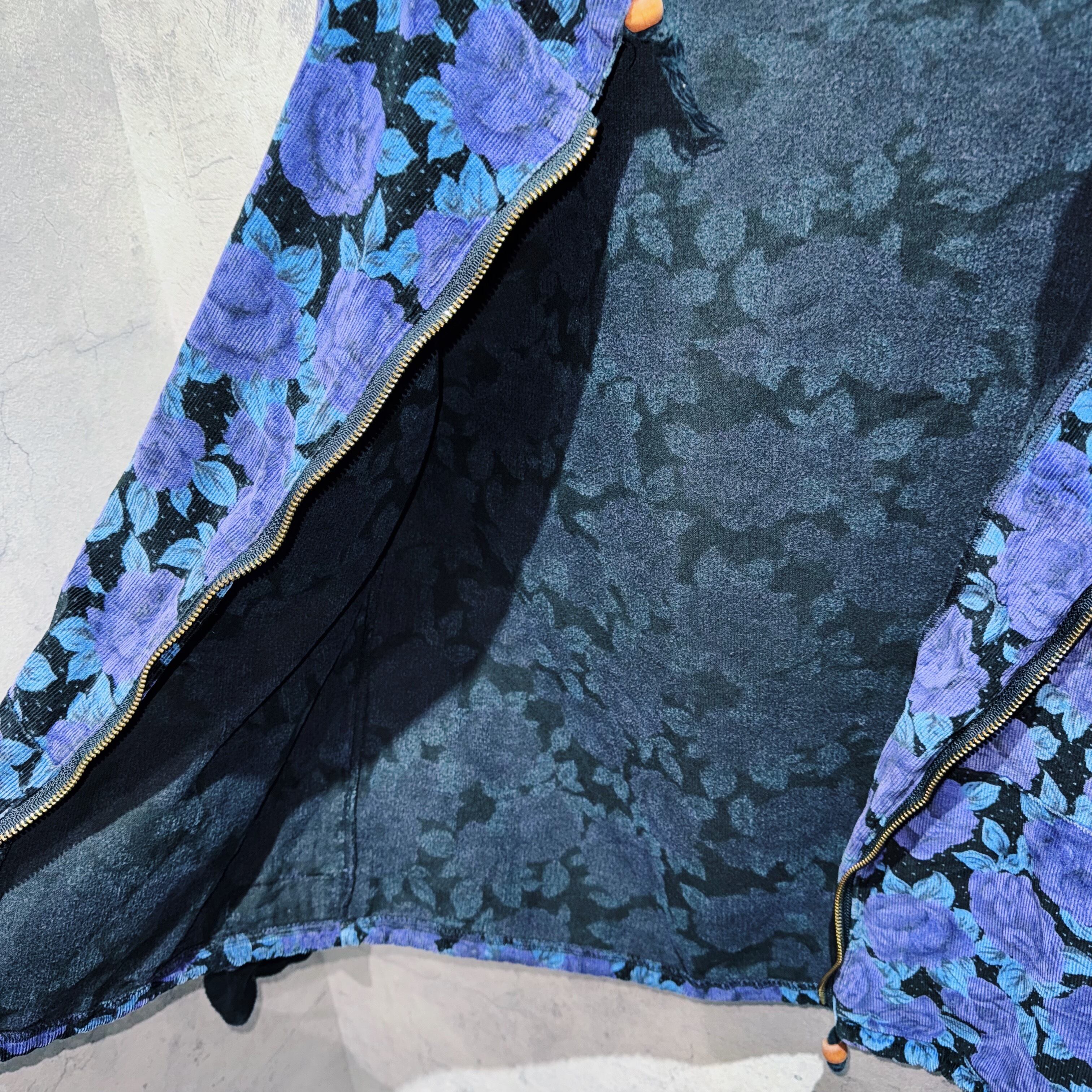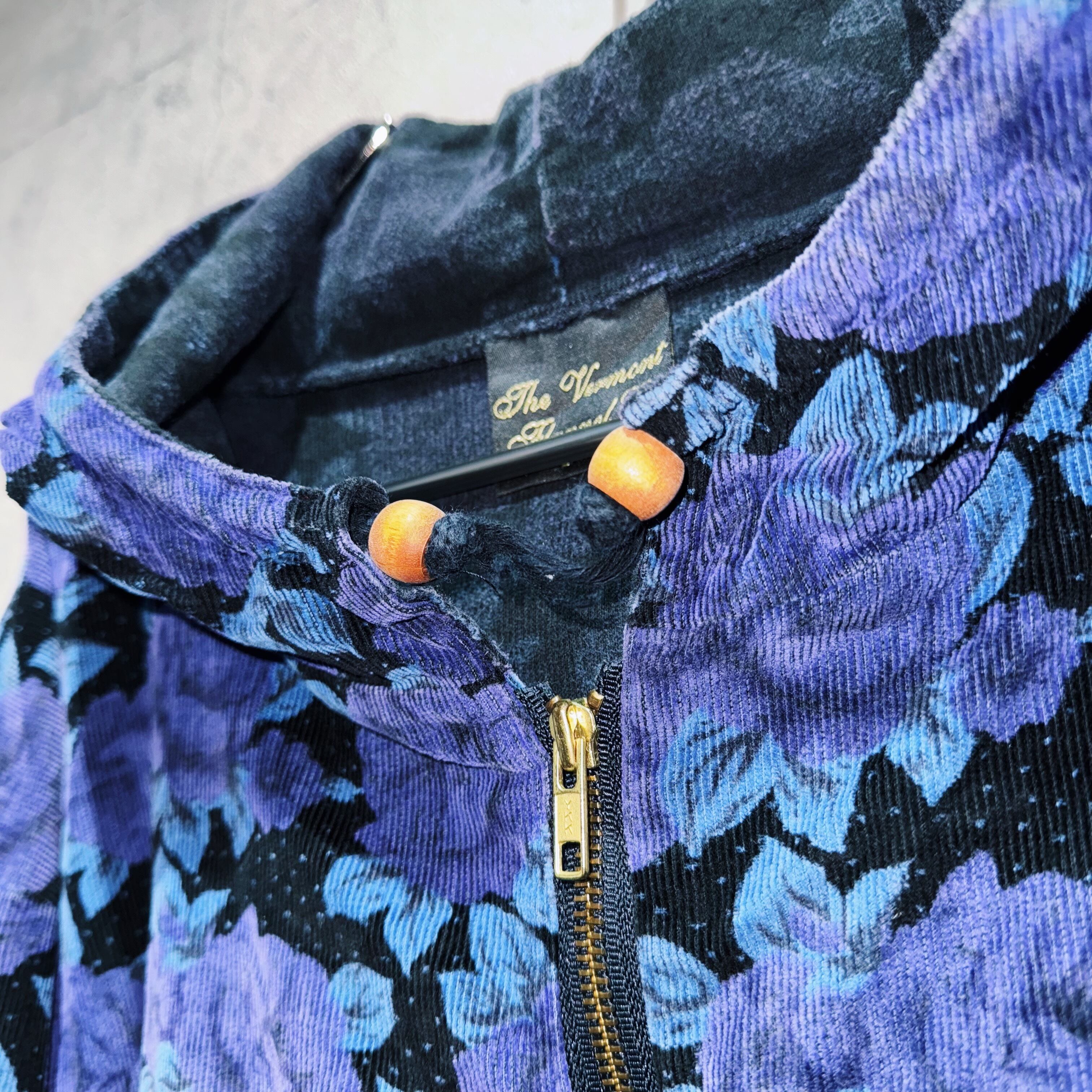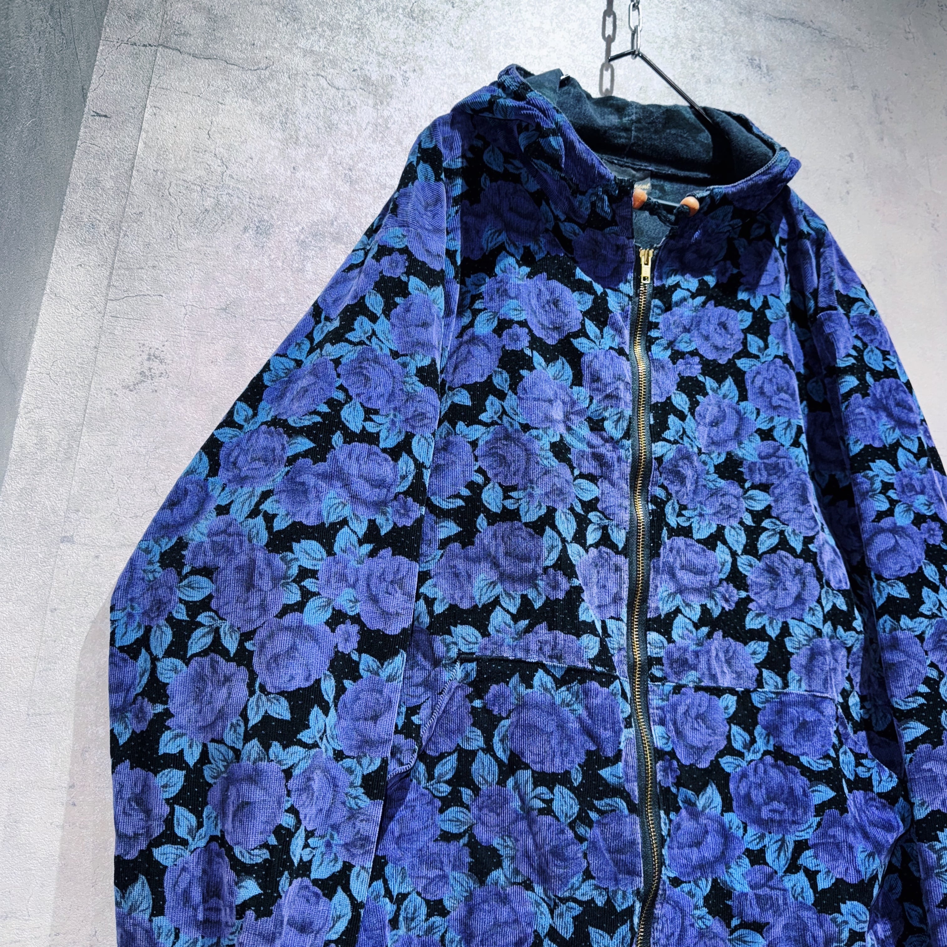 妖麗に咲き誇る紫の薔薇柄を前面にあしらったフーディーライトジャケット。圧巻のカラーリングに加え、異素材の高級感を演出してくれるコーデュロイを採用することで一際存在感のある仕上がりに。