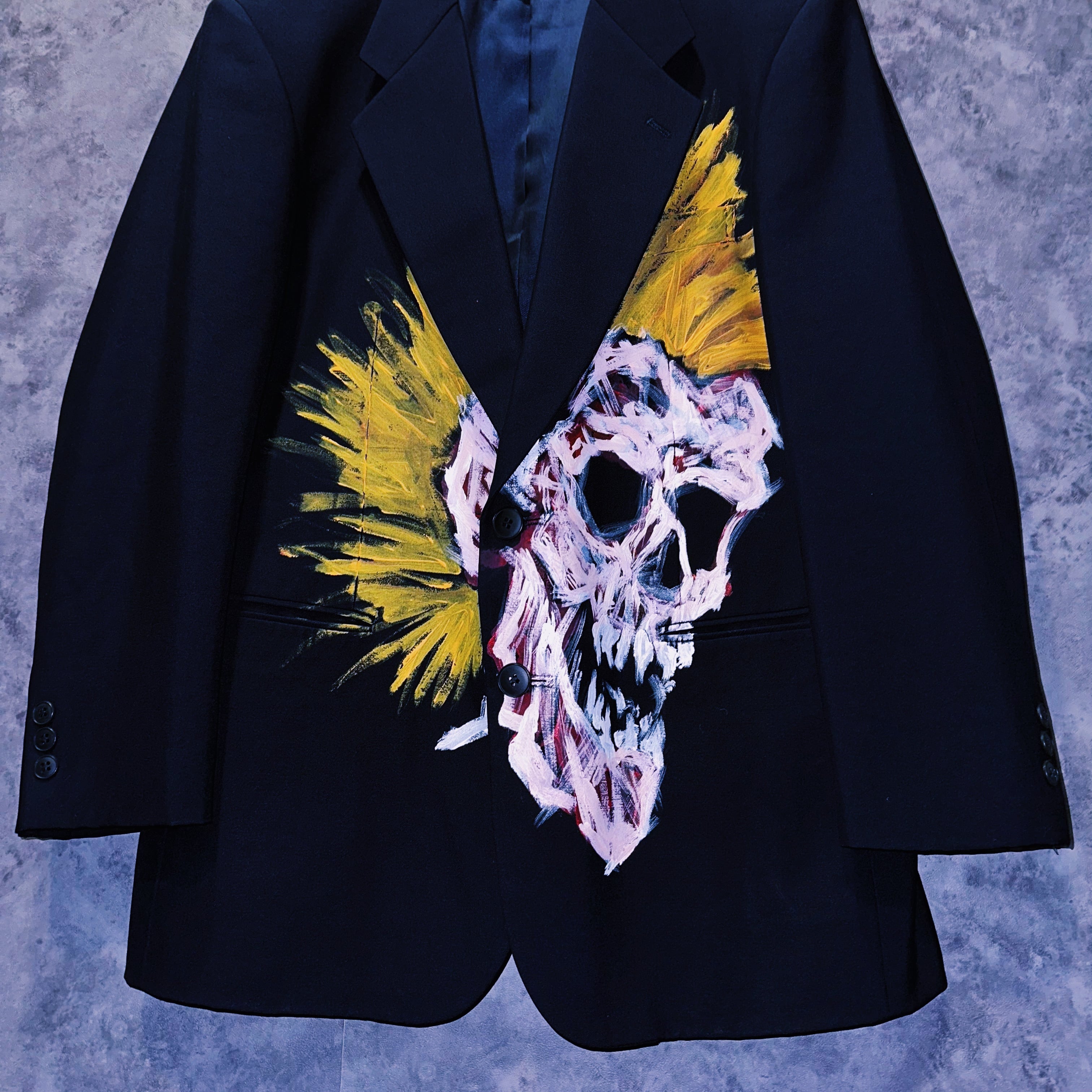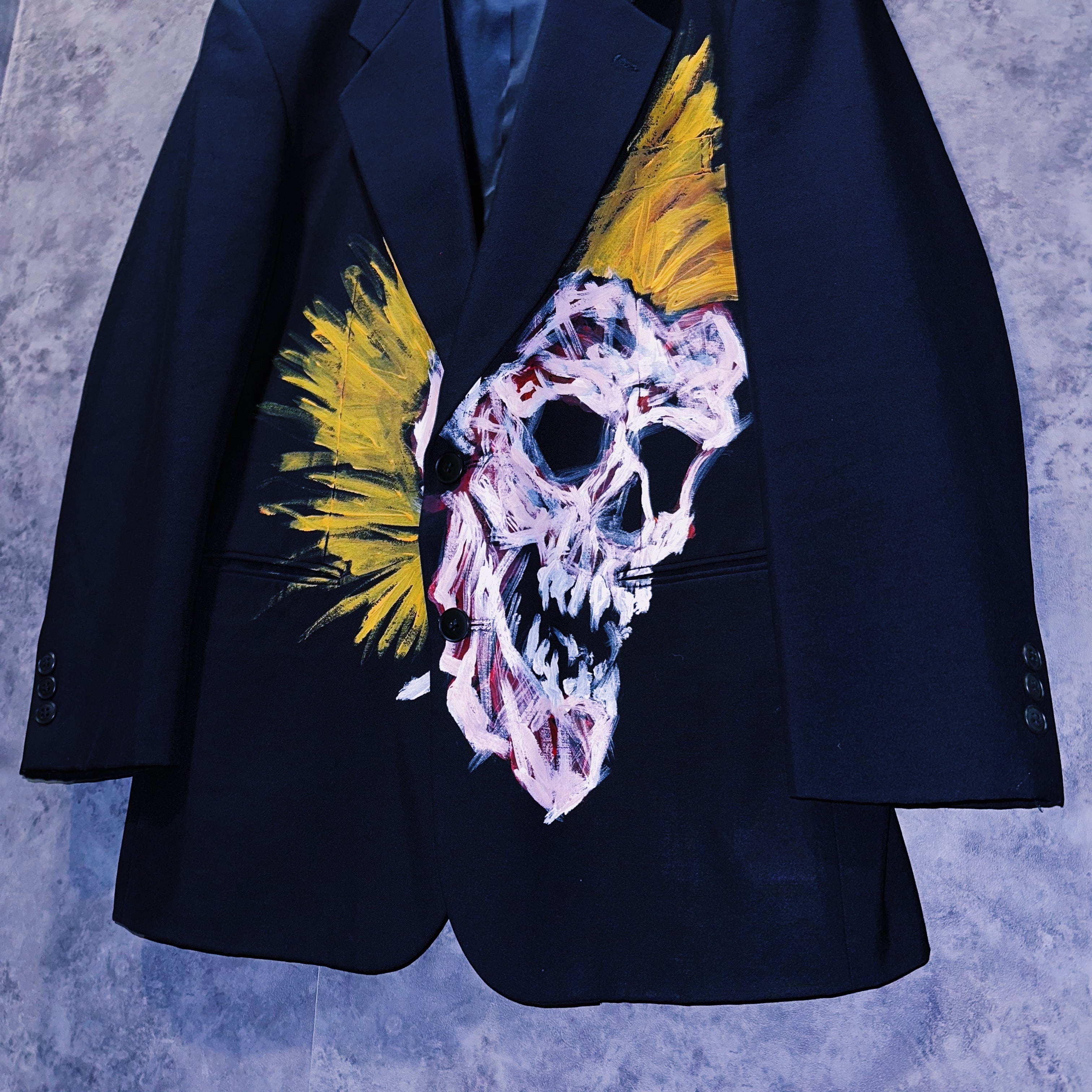 シングルブレストのテーラードジャケットにペインティングを加え、1つのアートを創造している斬新でルード且つレトロ感も垣間見える一着。