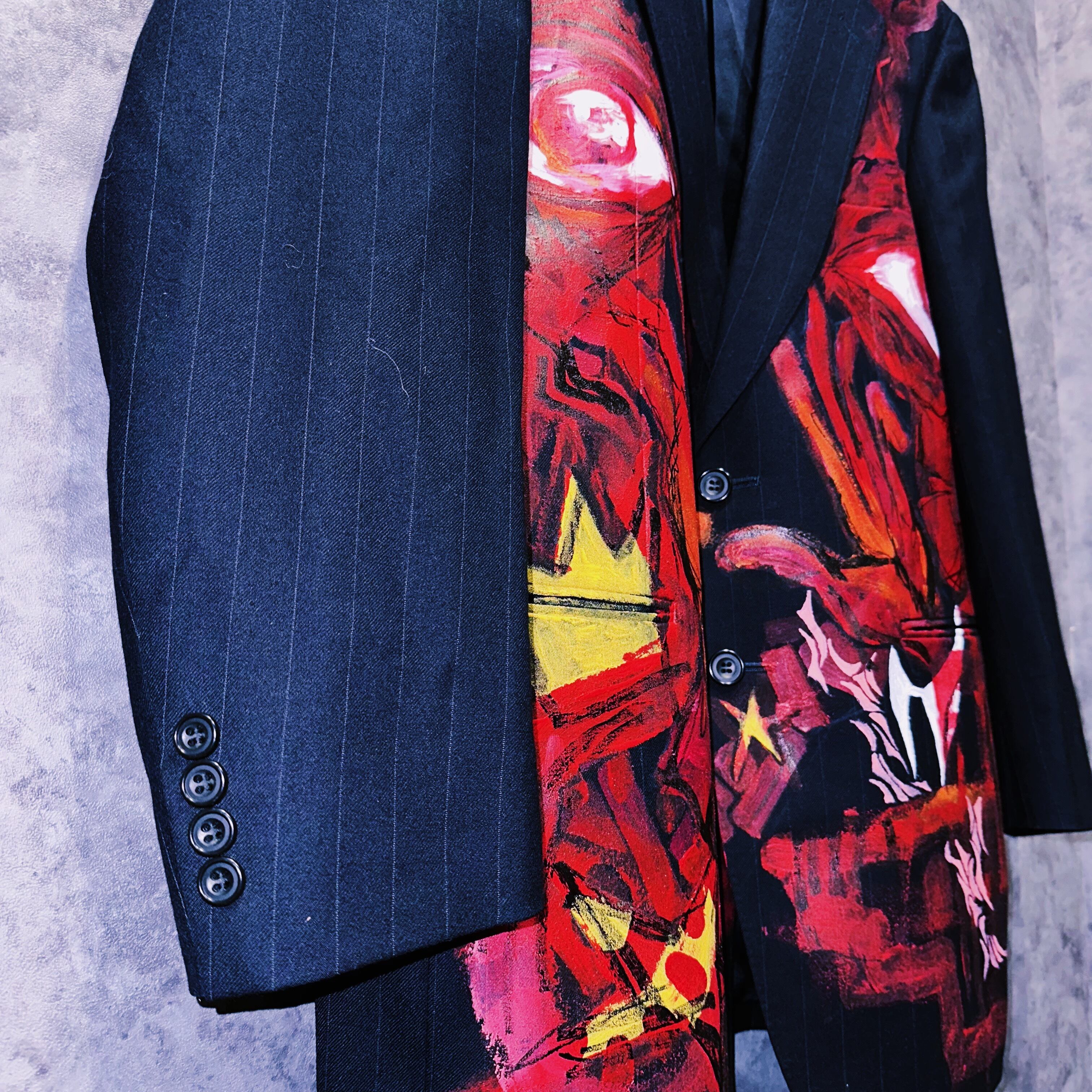 シングルブレストのテーラードジャケットにペインティングを加え、1つのアートを創造している斬新でルード且つレトロ感も垣間見える一着。