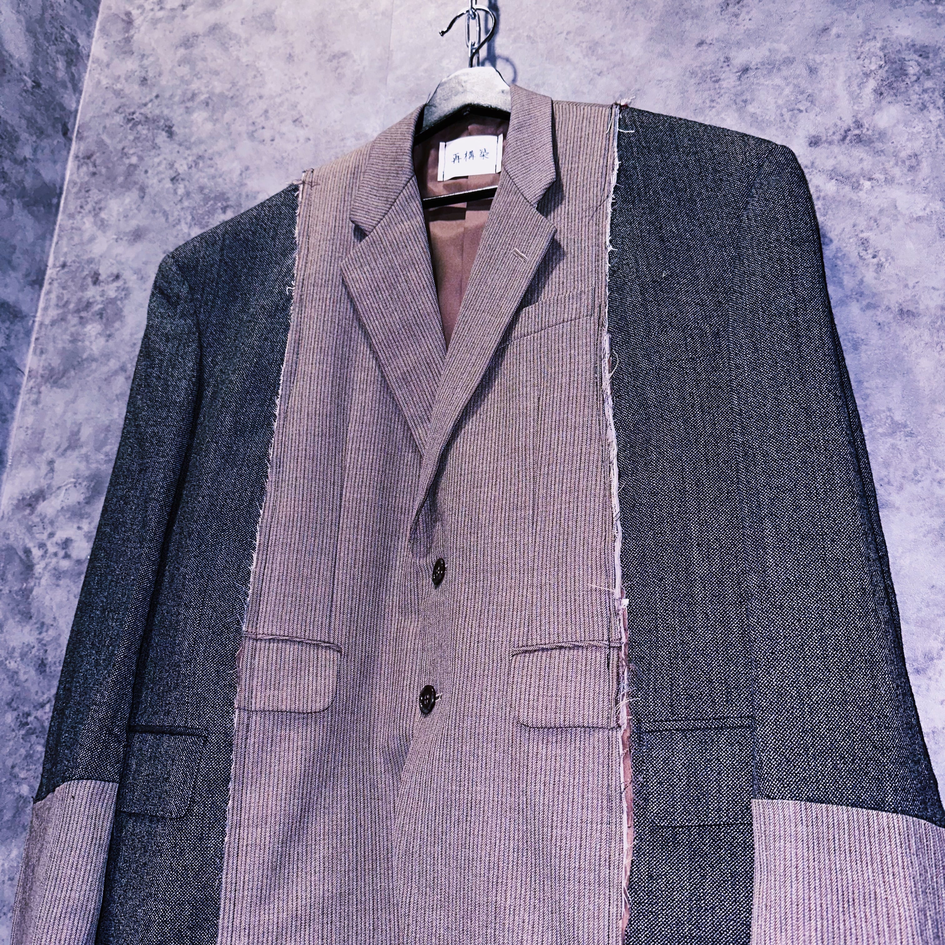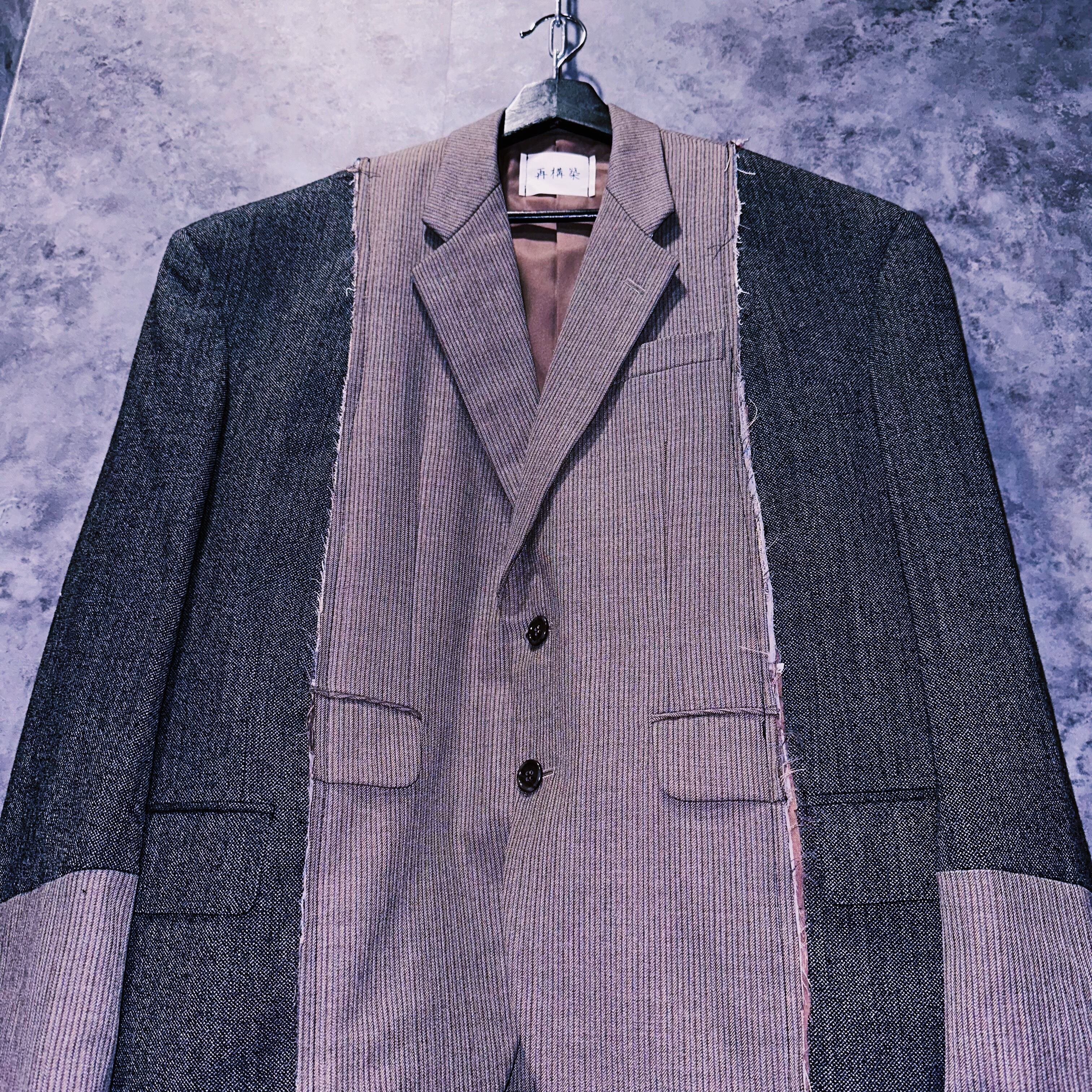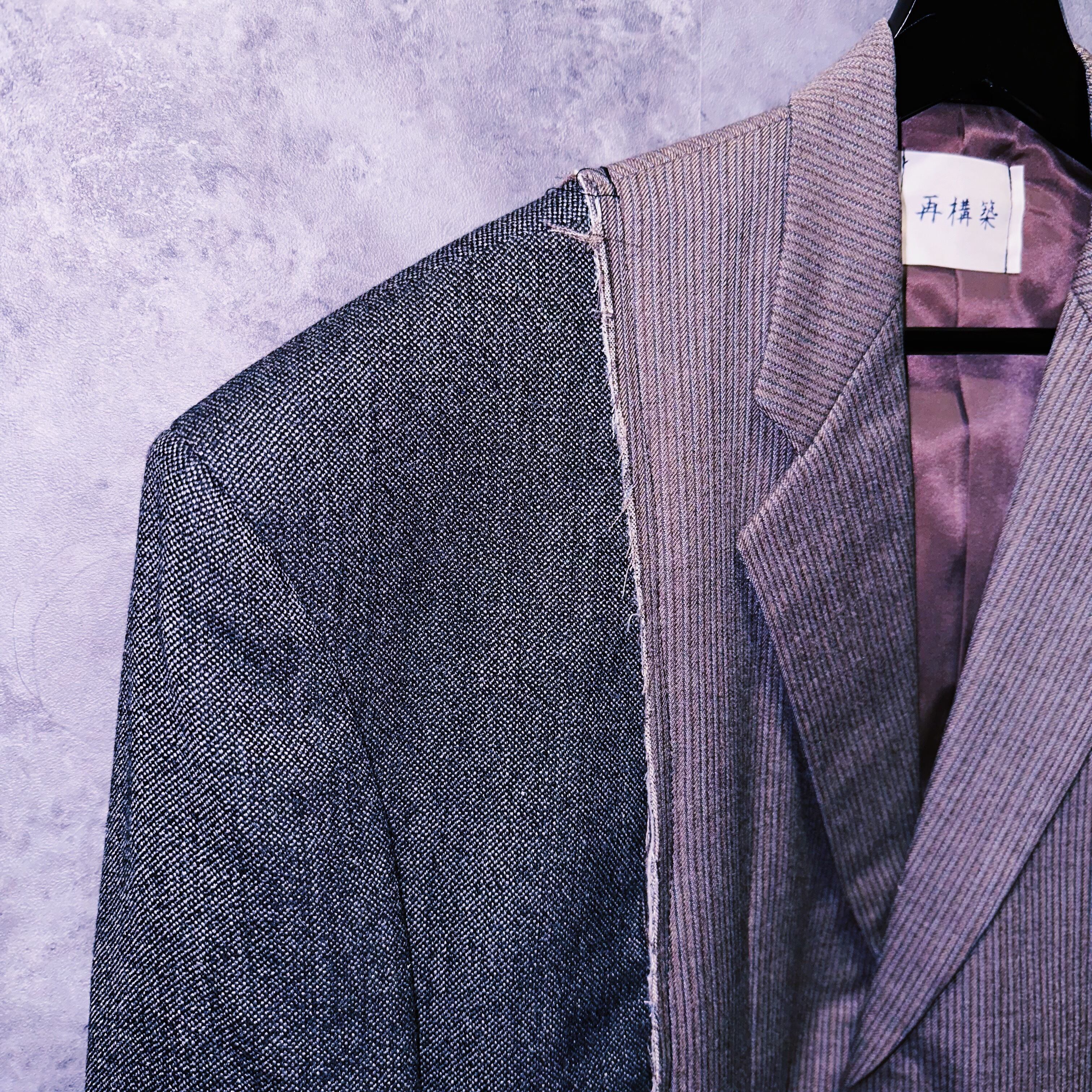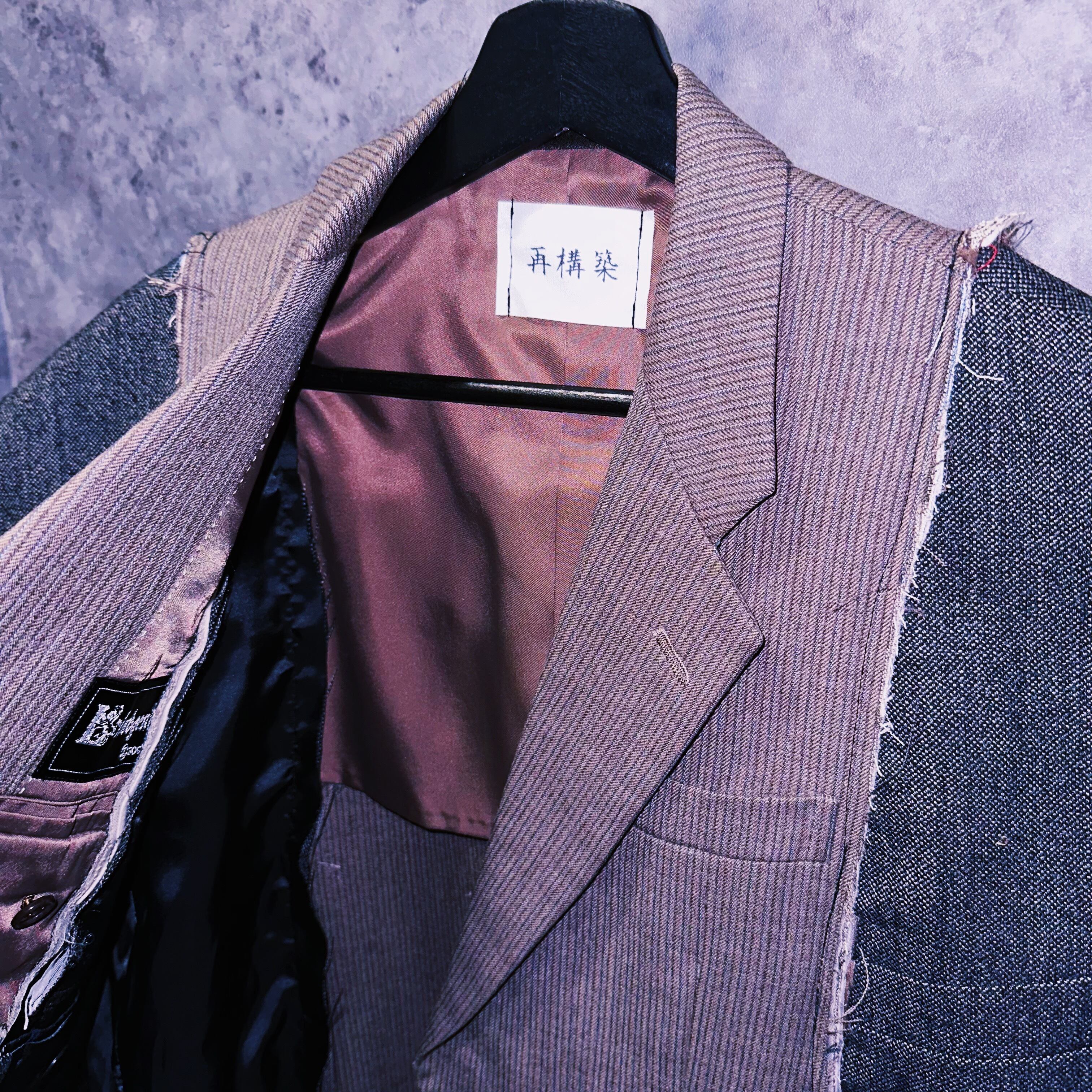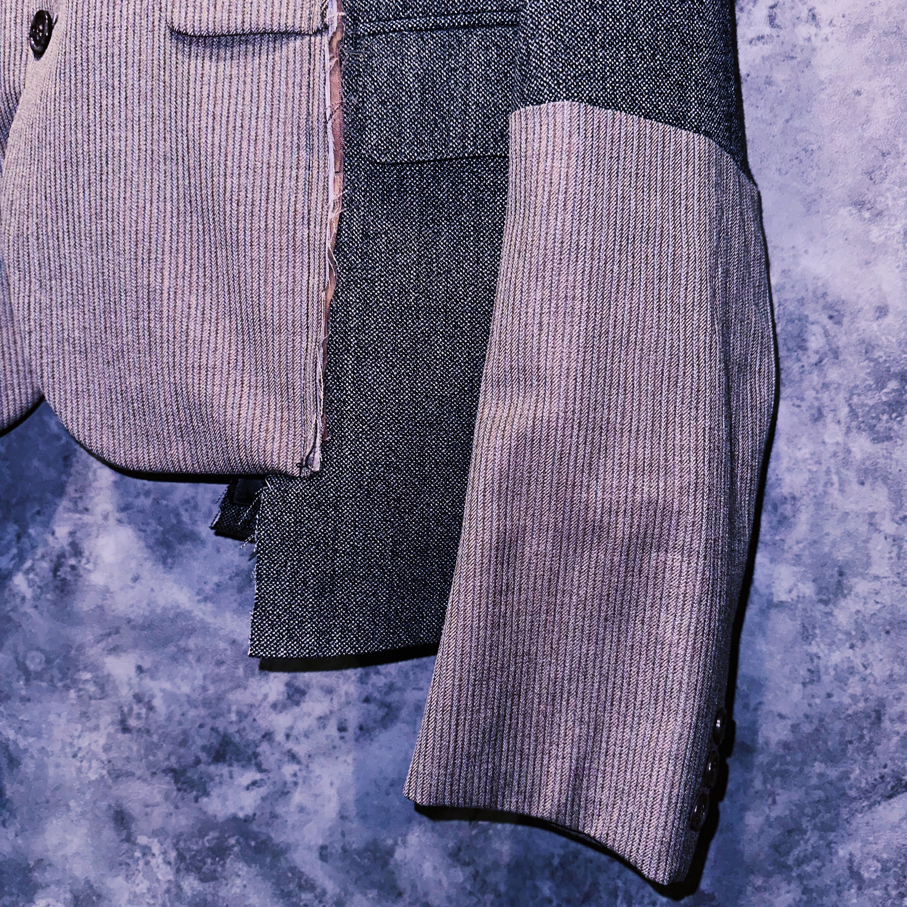 二つのダブルブレストのテーラードジャケットをドッキングカスタムしたリメイクセットアップ。