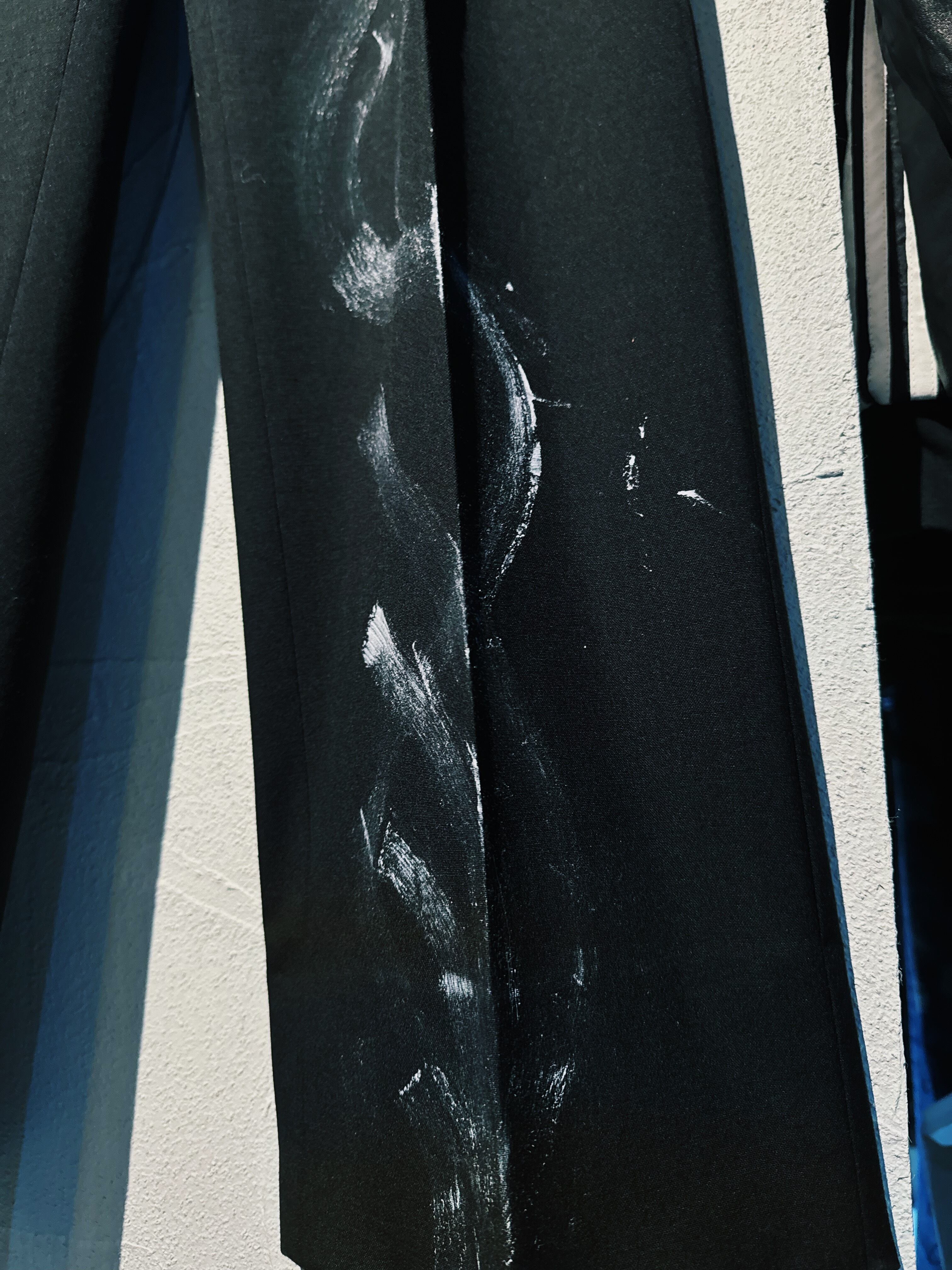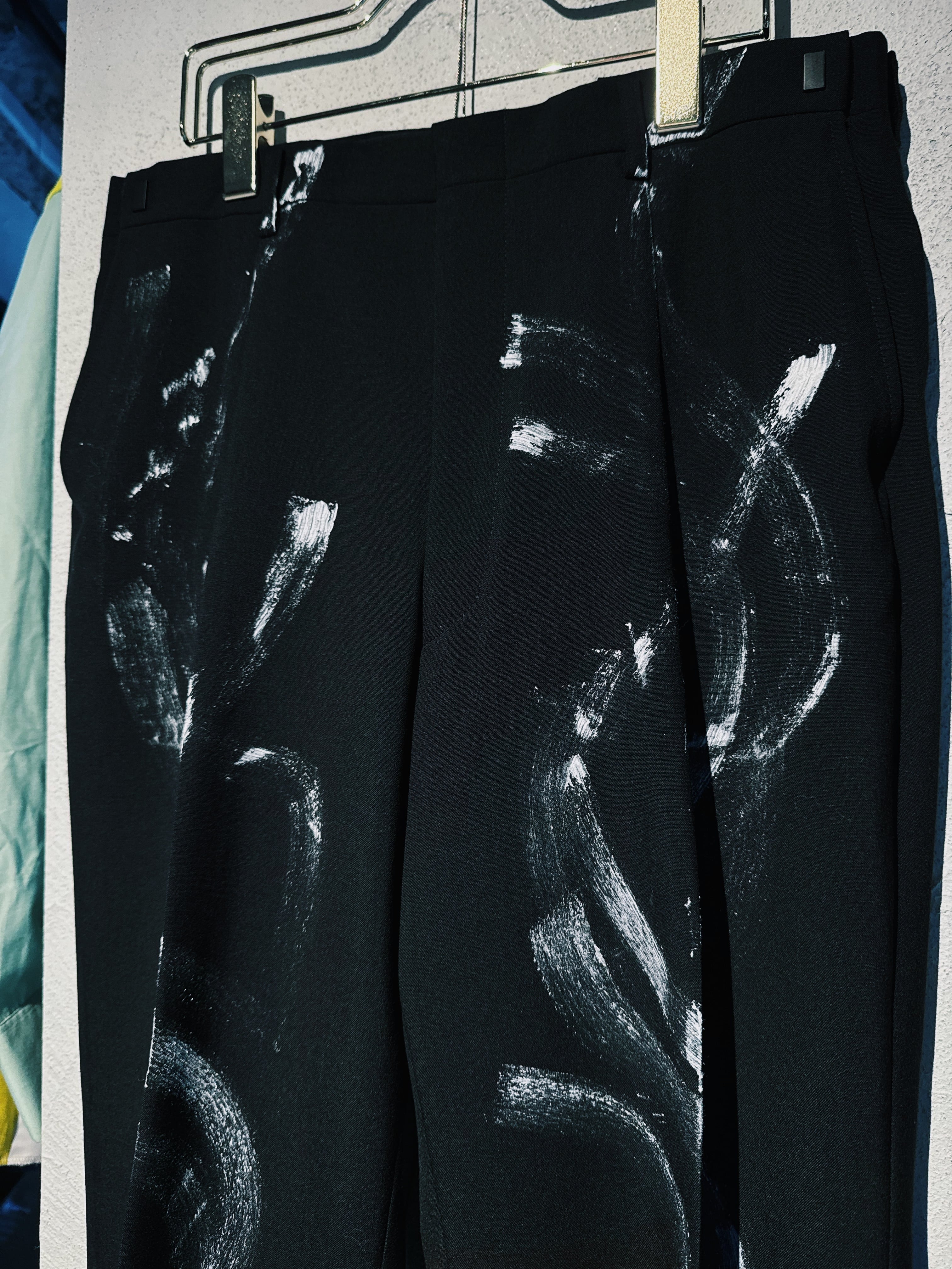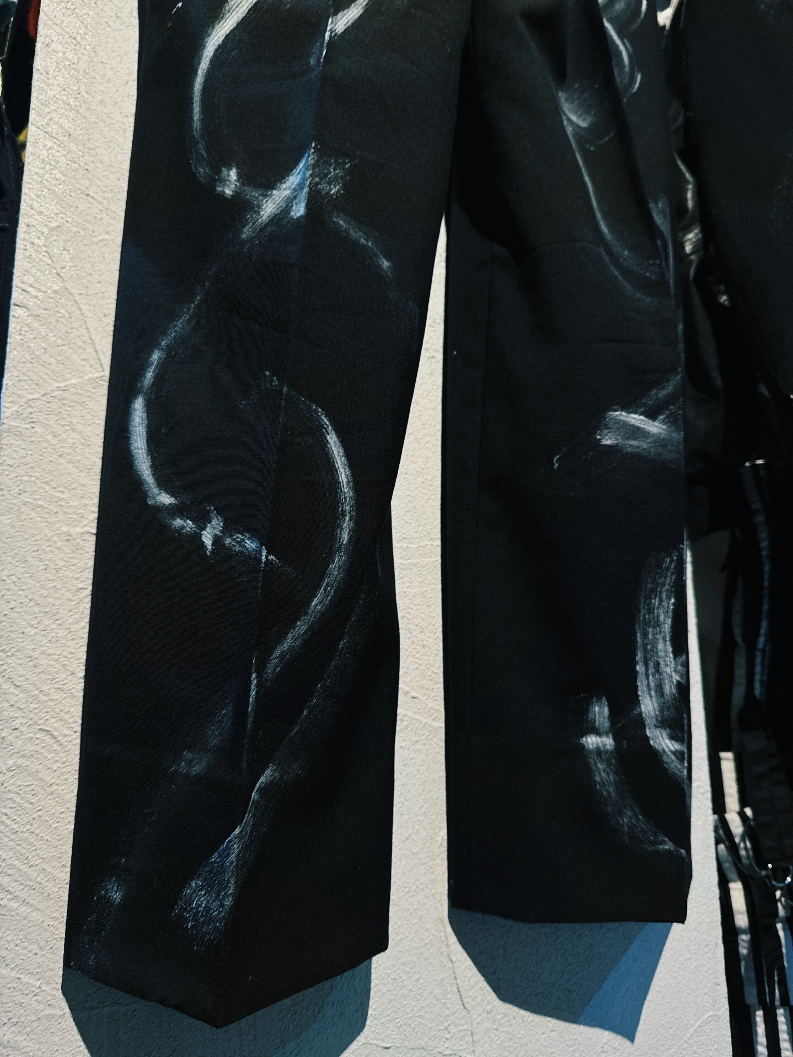 パンツにも華やかな雰囲気を醸し出す、ブラシペイントが描かれており、もはや1つの作品として芸術を嗜むことができるかと。ファッションとアートを楽しめる素晴らしい逸品。