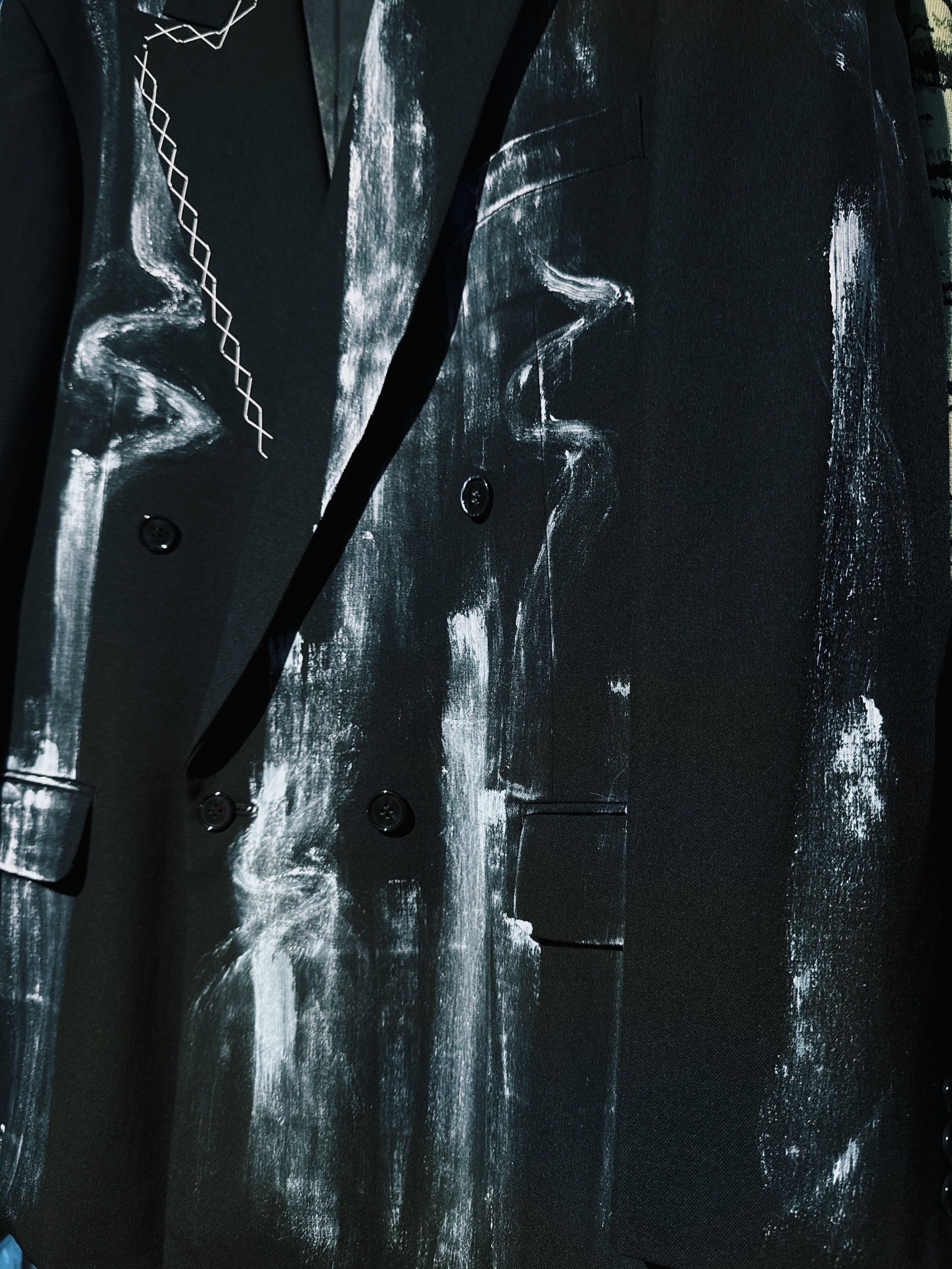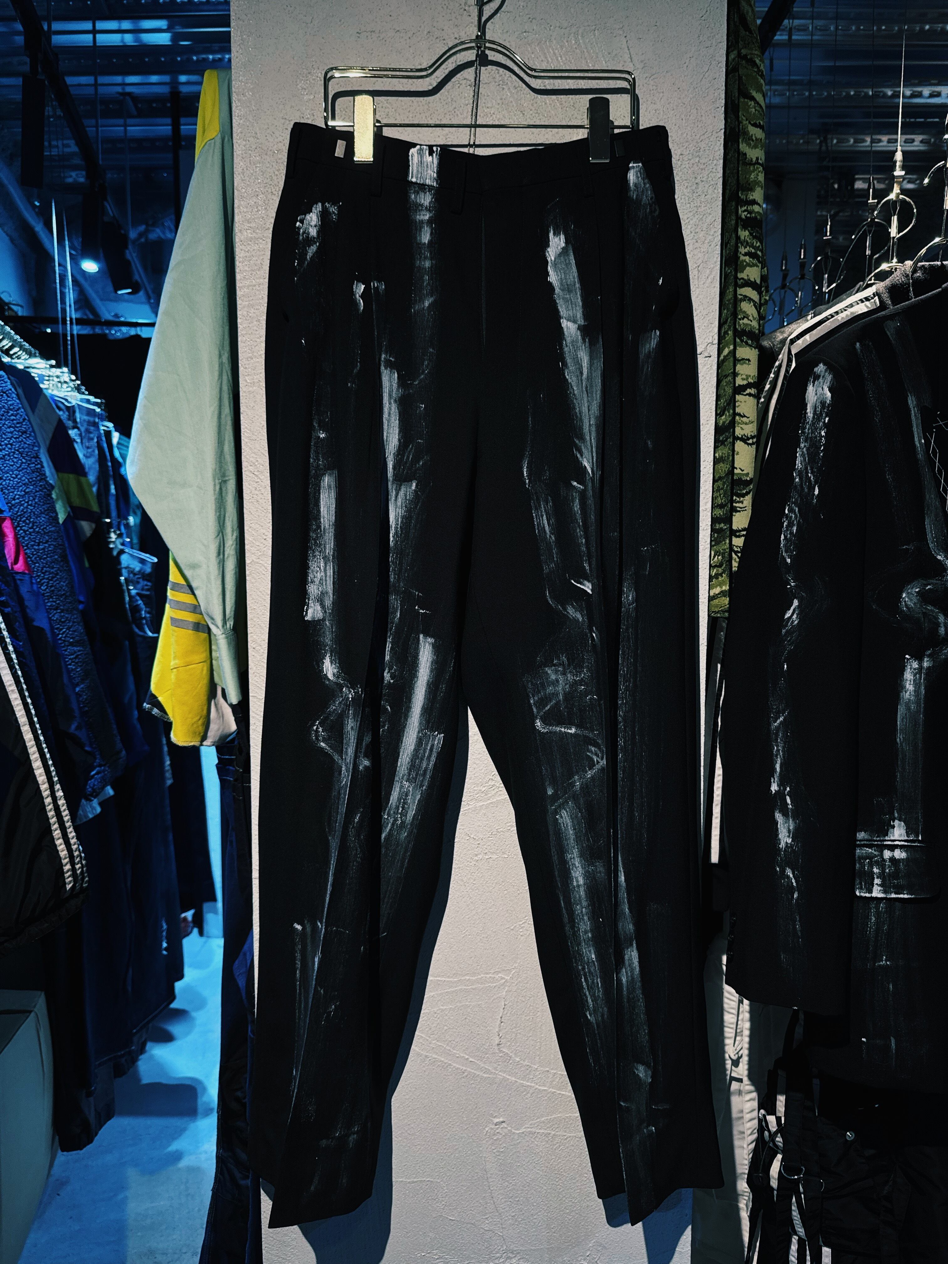 パンツにも華やかな雰囲気を醸し出す、ブラシペイントが描かれており、もはや1つの作品として芸術を嗜むことができるかと。ファッションとアートを楽しめる素晴らしい逸品。