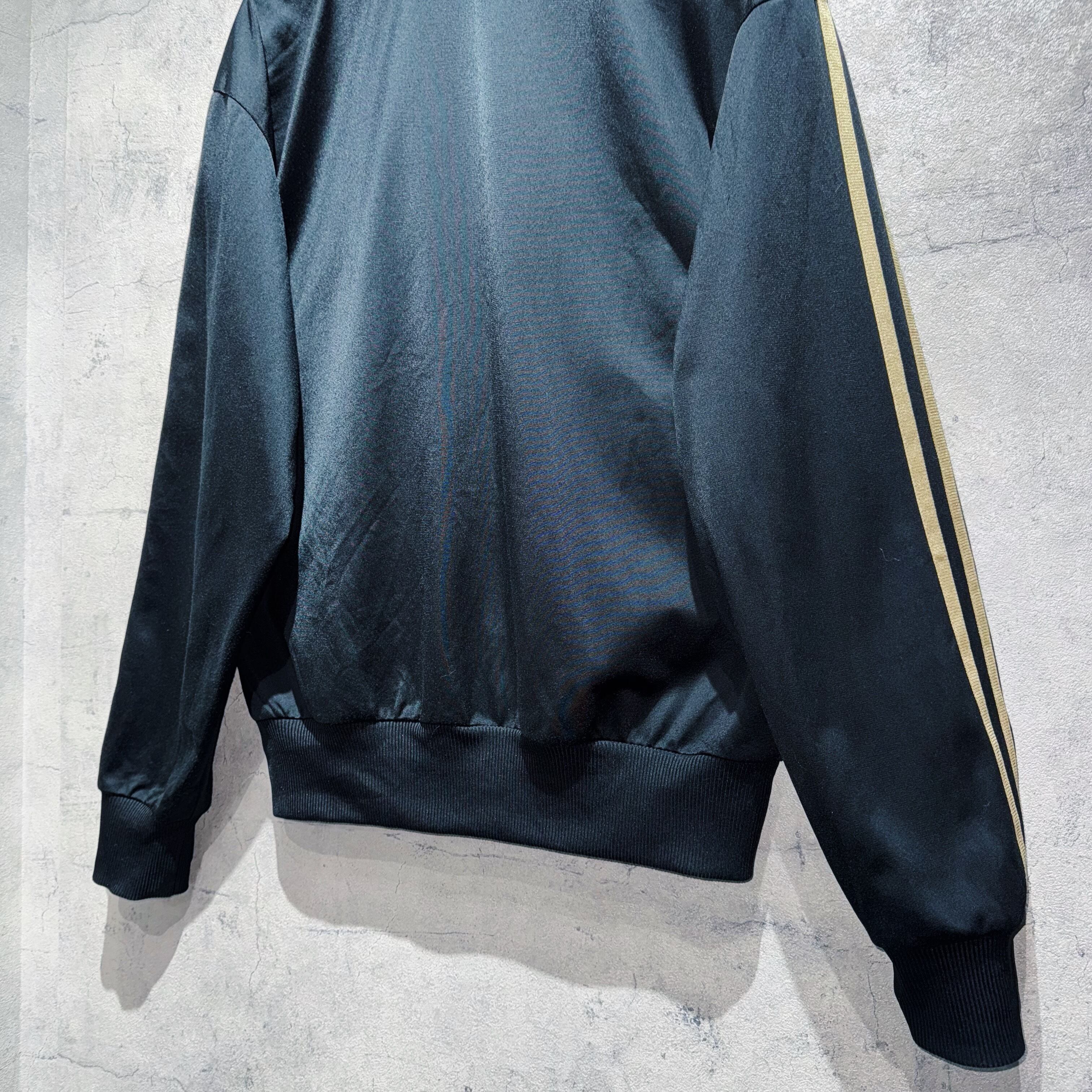 “ATP”のような光沢のある艶やかなボディに、”adidas”の代名詞である3ストライプスとトレフォイルの刺繍をゴールドで載せた、高級感のあるトラックジャケット。
