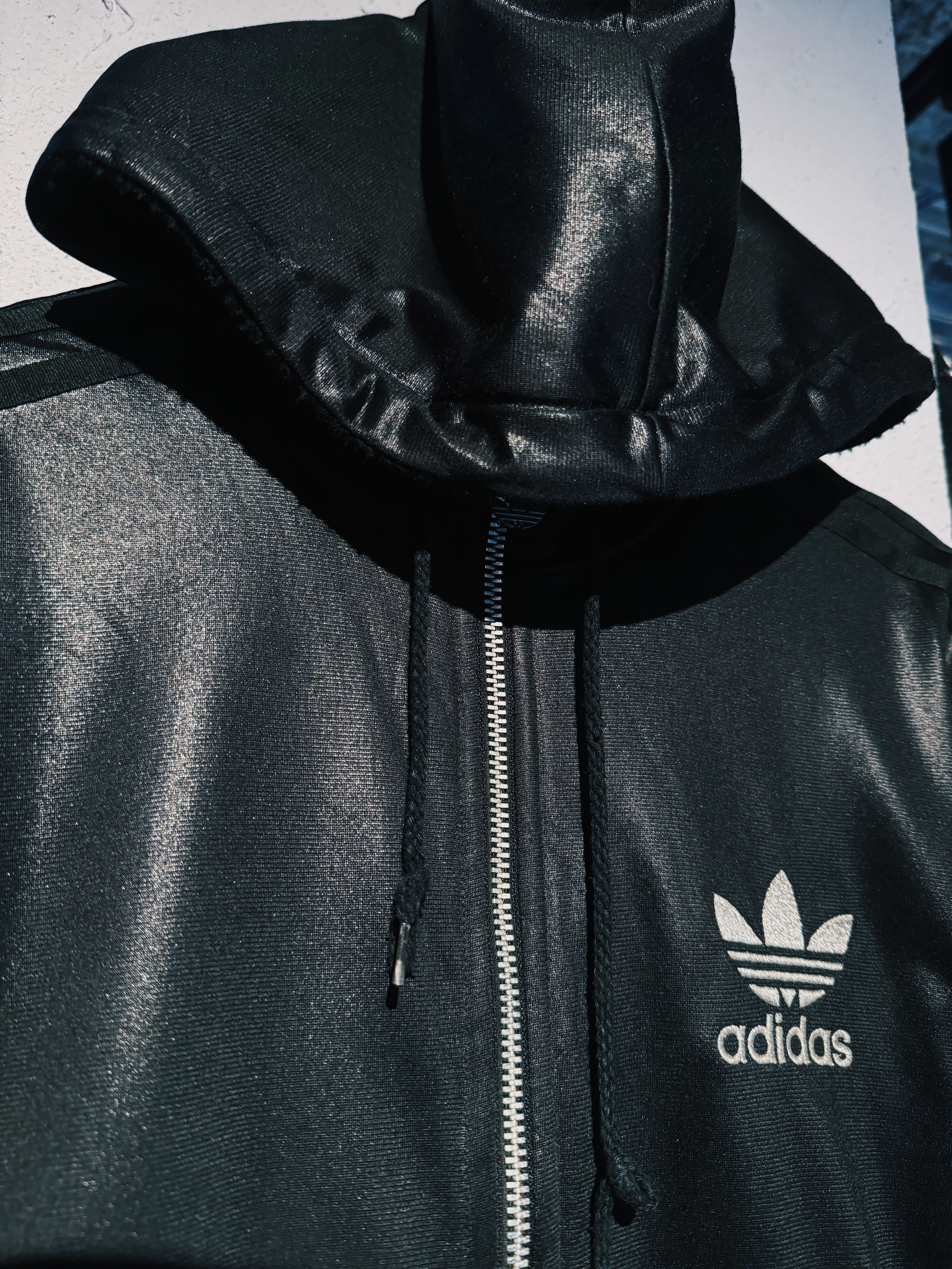 表面はCHILE62のトラックジャケットと同様のデザインで、レザーのようなブラックのボディに銀色のトレフォイルとフロント下部にはブランド名が刺繍されています。CHILE62の独特なデザインでもあるポケットも施されていますね。ボディと同色で”ADIDAS”の代名詞でもある3ストライプスもあしらった抜かりのないデザイン。