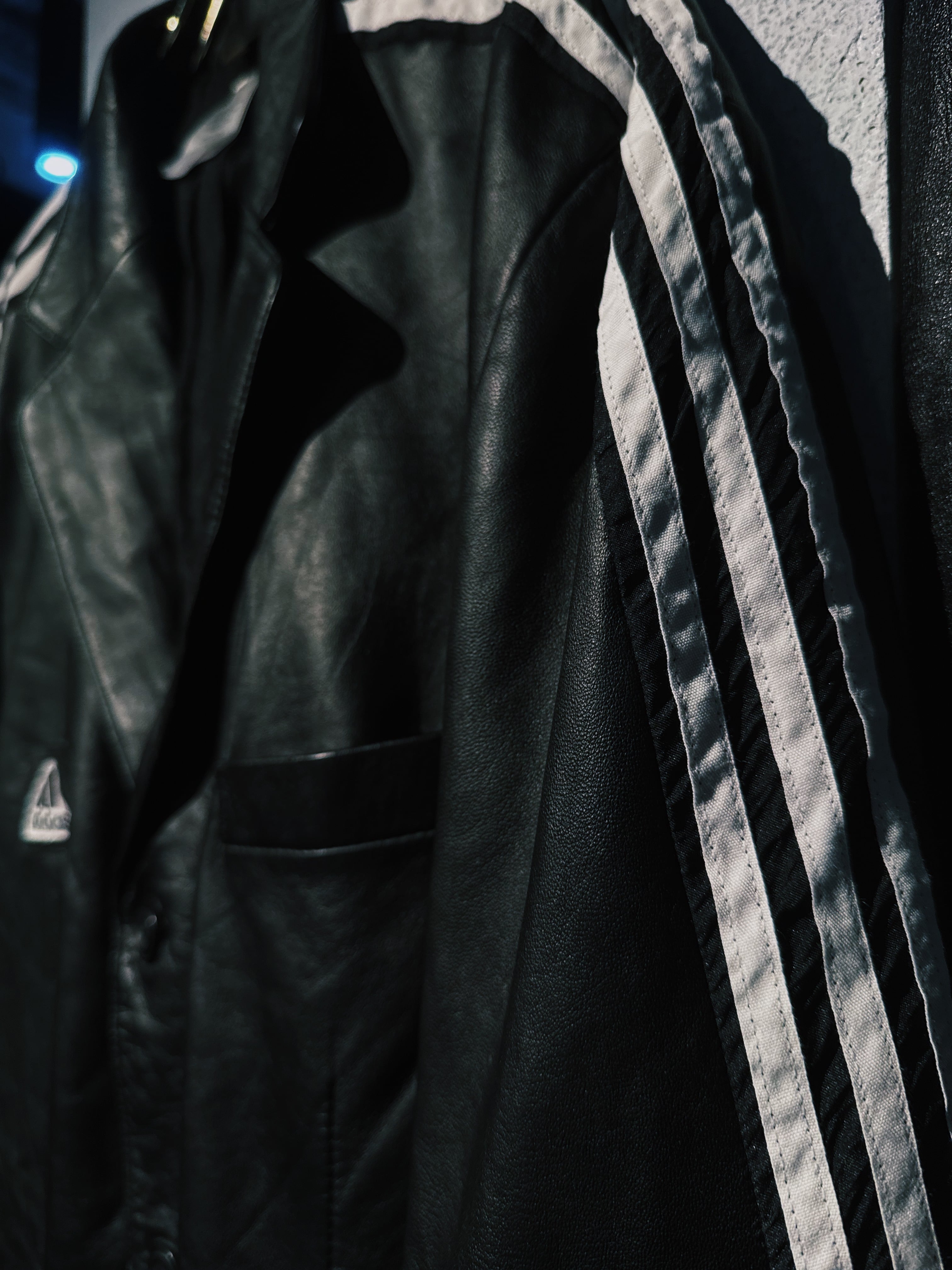 ハリがありモッチモチのレザージャケットにシティーポップでハイストリートなスリーストライプの上質なトラックテキスタイルを"融合"させてハイモード×ハイストリートなアイテムに。