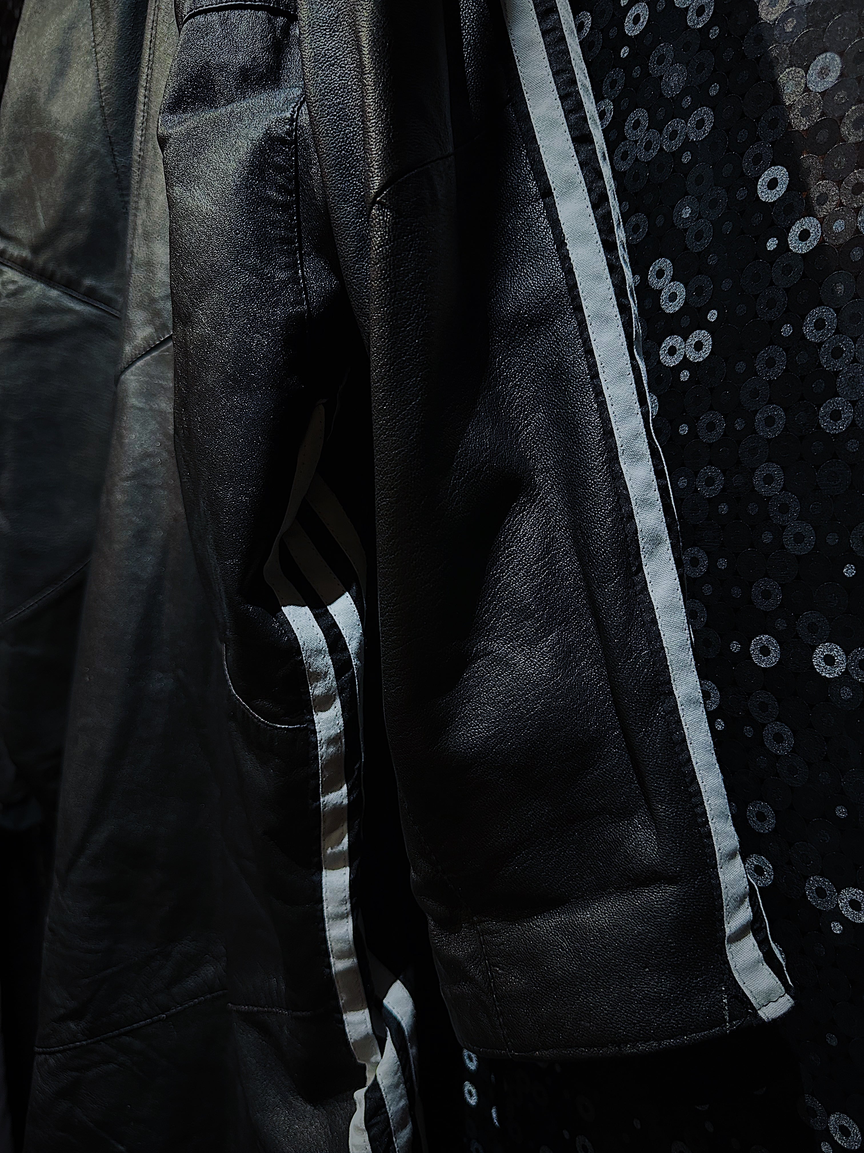 ハリがありモッチモチのレザーコートにシティーポップでハイストリートなスリーストライプの上質なトラックテキスタイルを"融合"させてハイモード×ハイストリートなアイテムに。