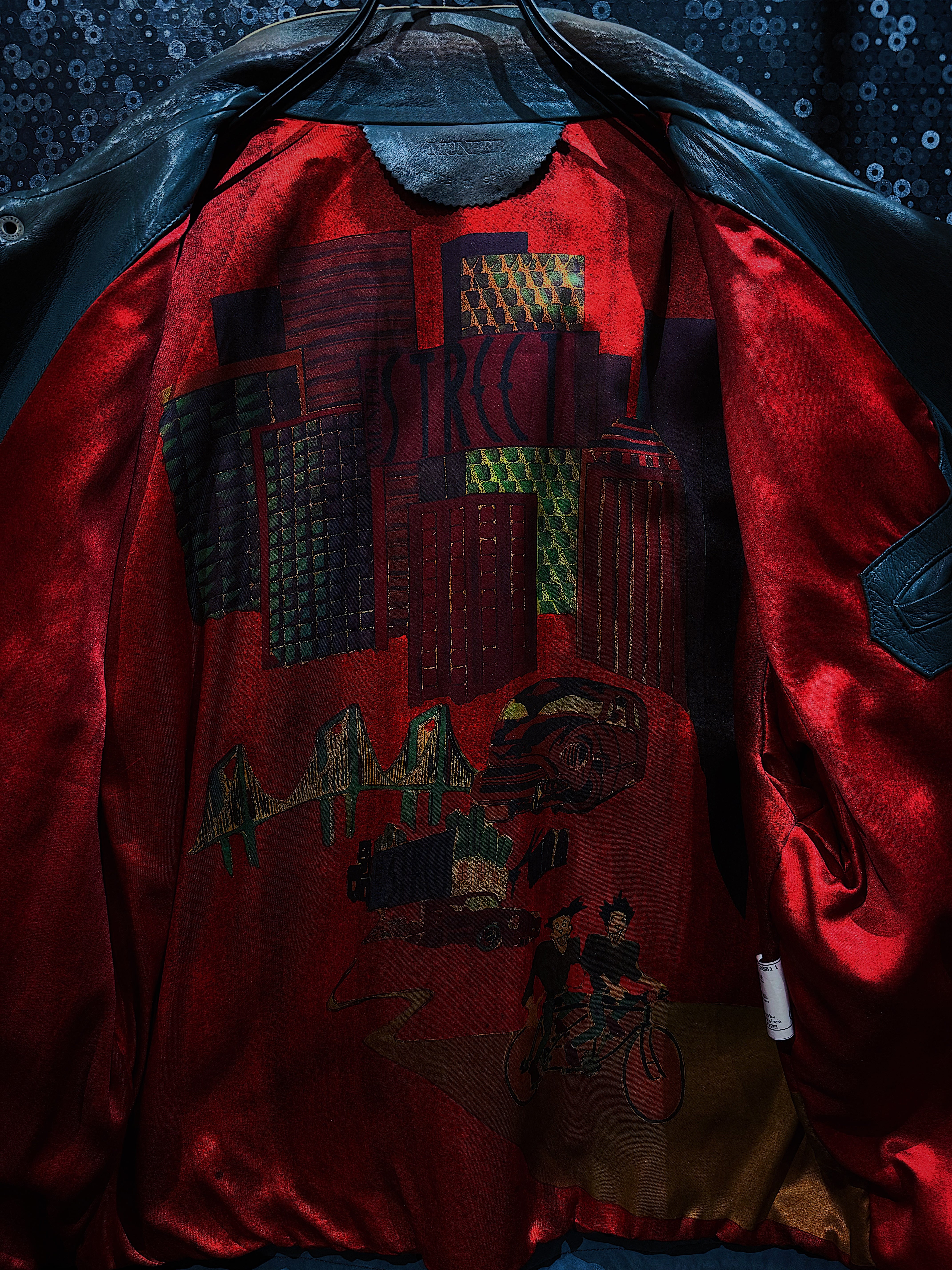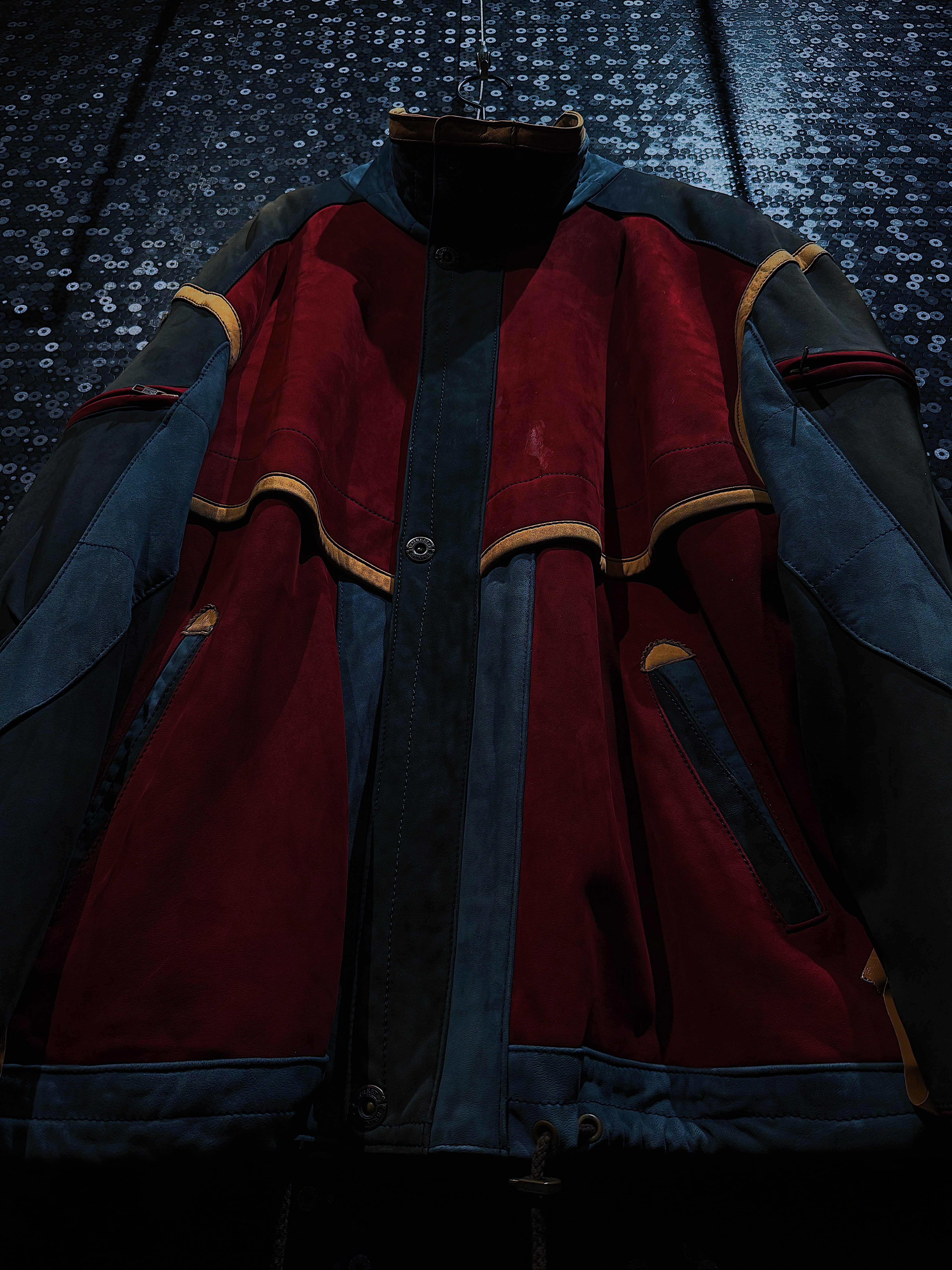 こちらは”MUNPER”のヴィンテージディープレッドカラーパターンレザージャケットです。独特なデザインと配色が特徴で、まるでガンダムに登場するパイロットスーツを彷彿とさせるような未来的で個性的な印象を与えます。デザイン性が非常に高く、着用するだけで圧倒的な存在感を放つ一着です。