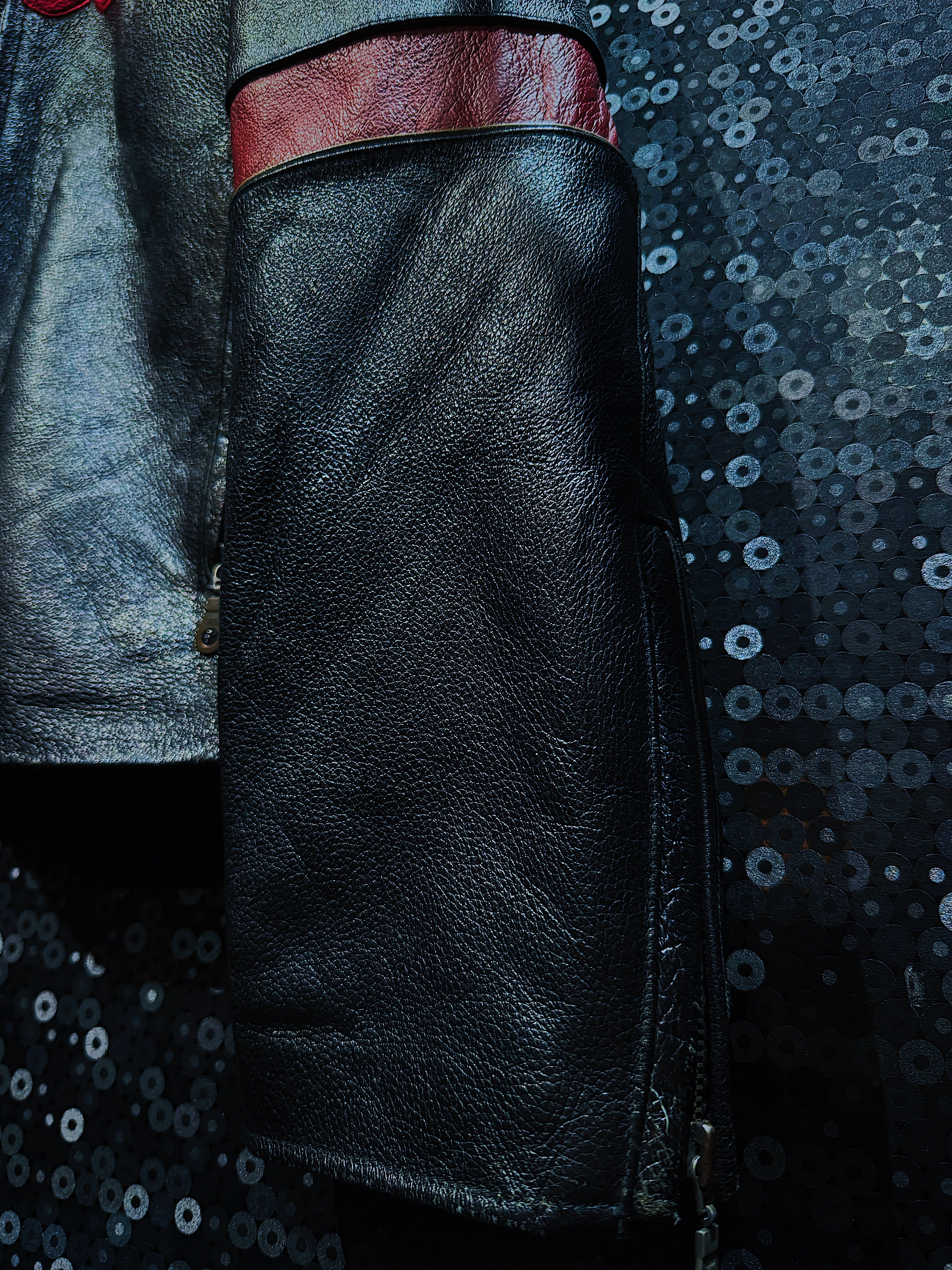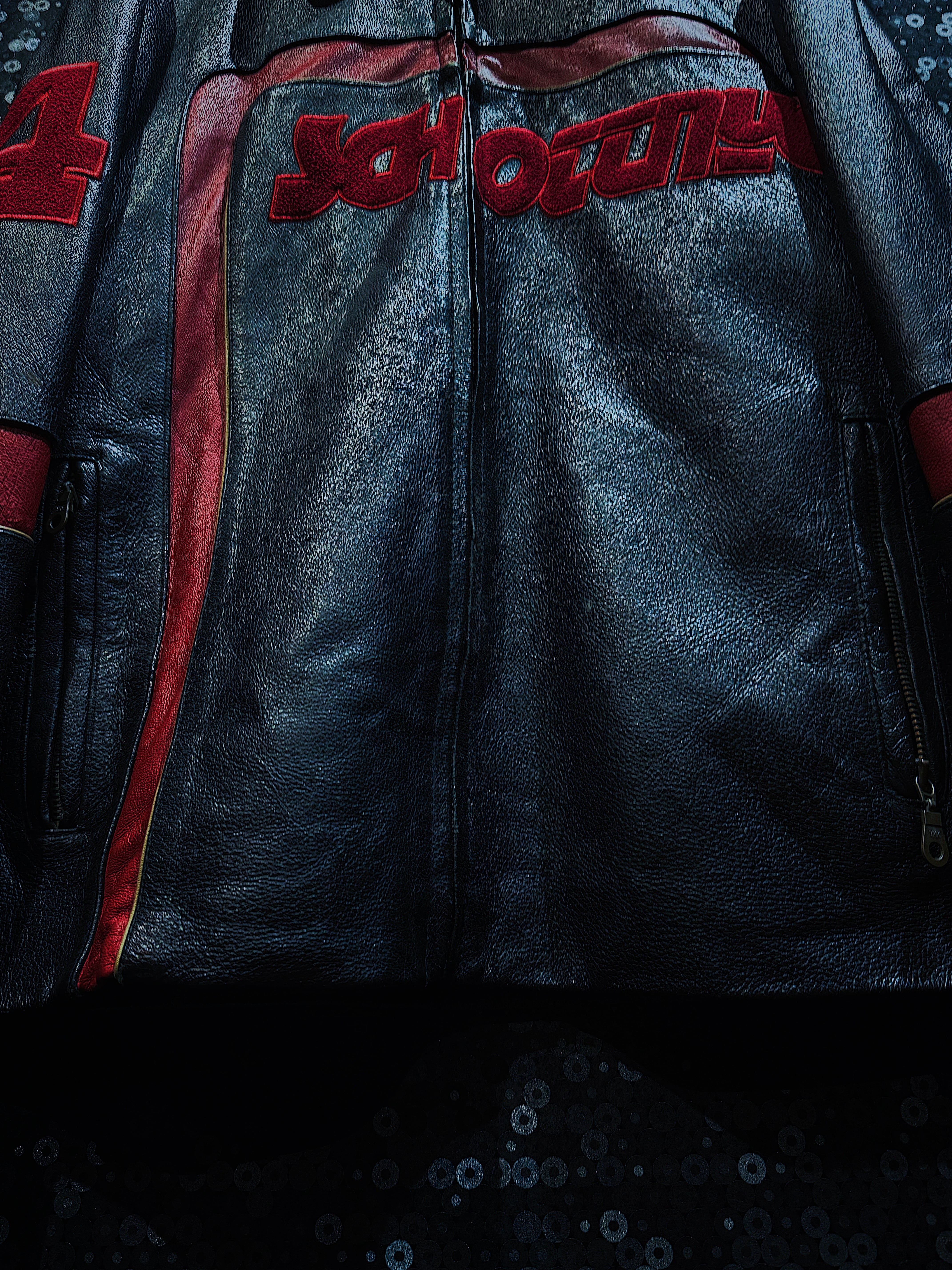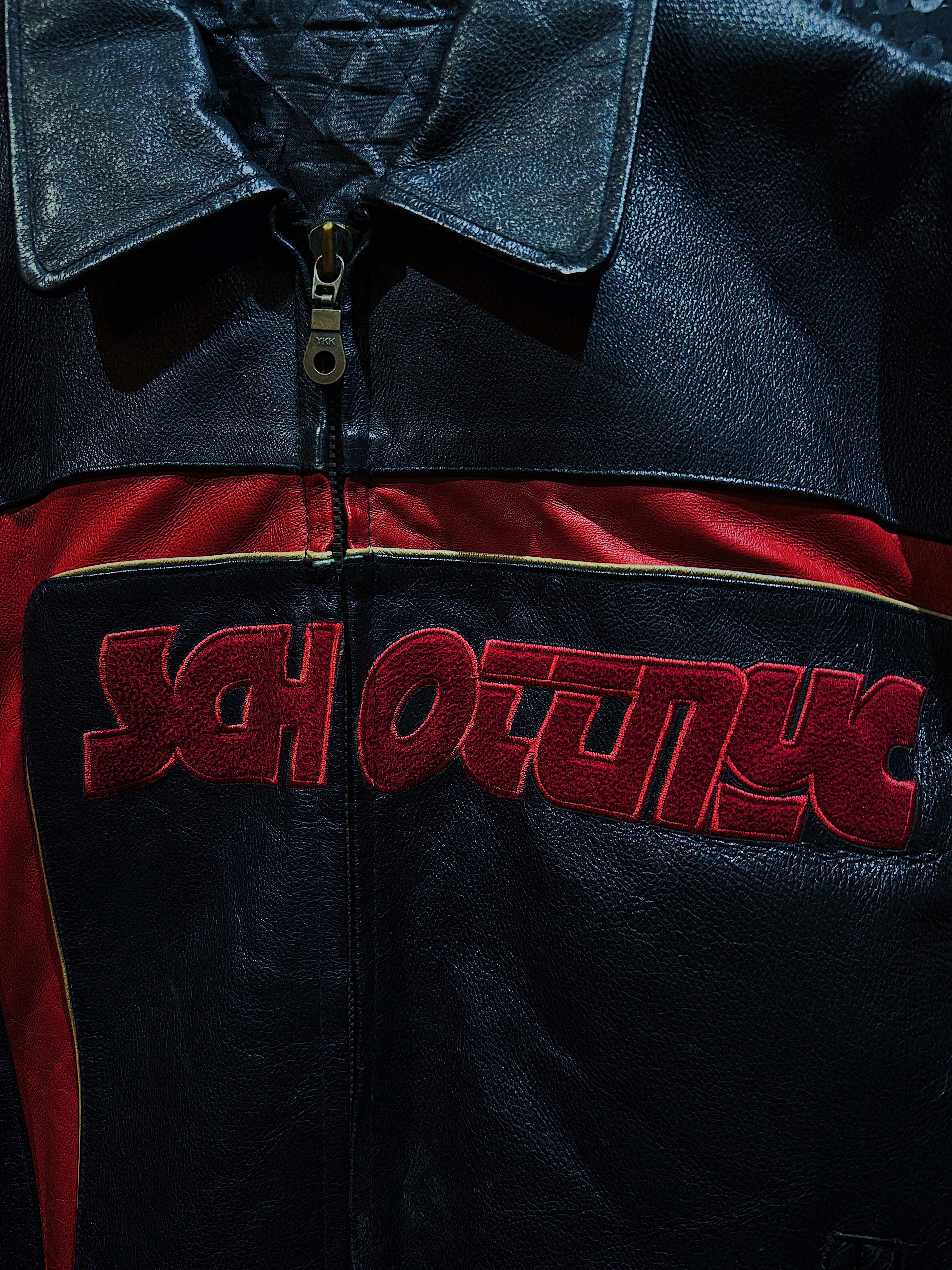 こちらは”Schott”のヴィンテージ短丈ライダースレザージャケットです。短丈のデザインが腰回りをすっきりと引き締め、スタイリッシュなシルエットを演出します。ブラックを基調としたボディに施された赤のロゴとラインが印象的で、男らしく力強い存在感を放つ一着です。