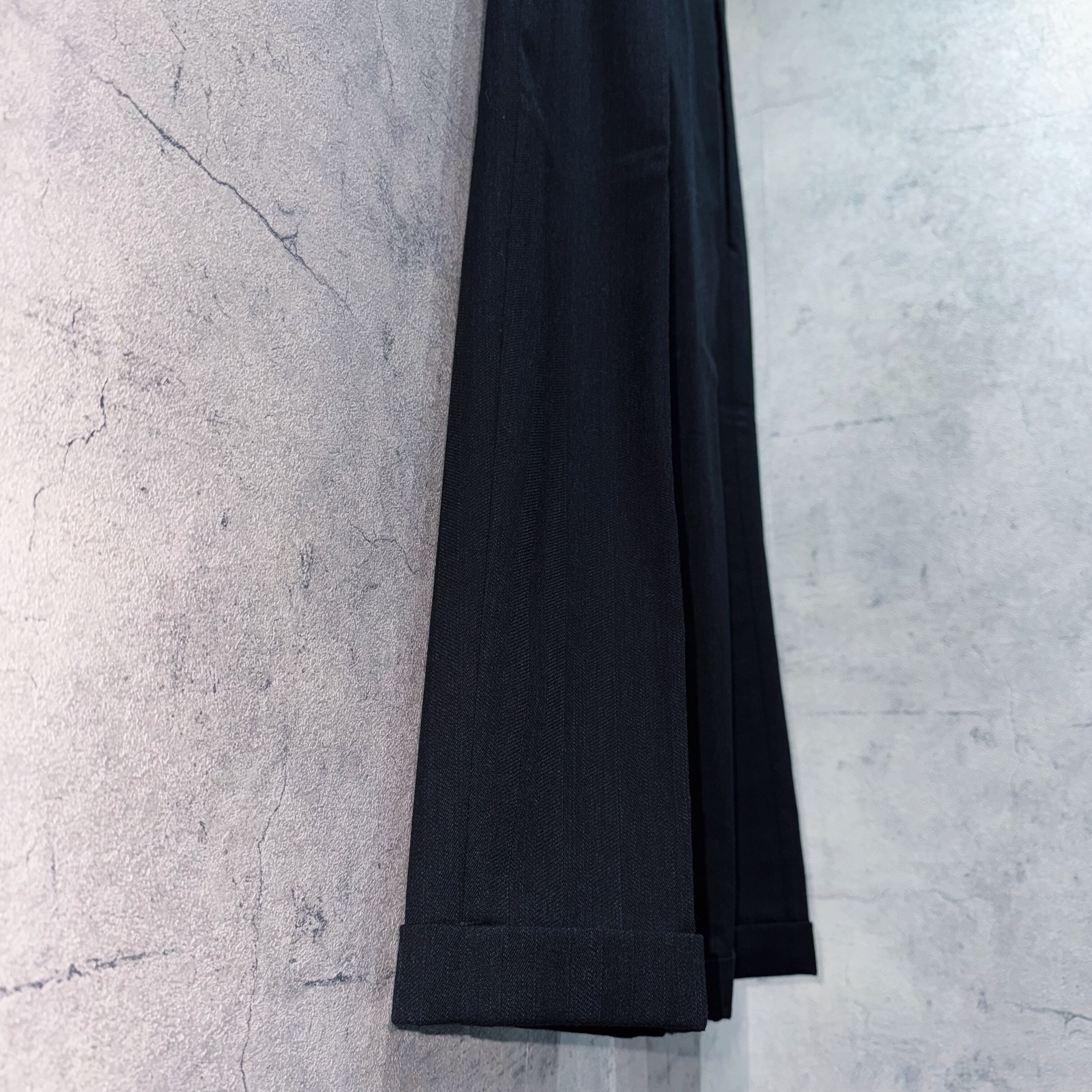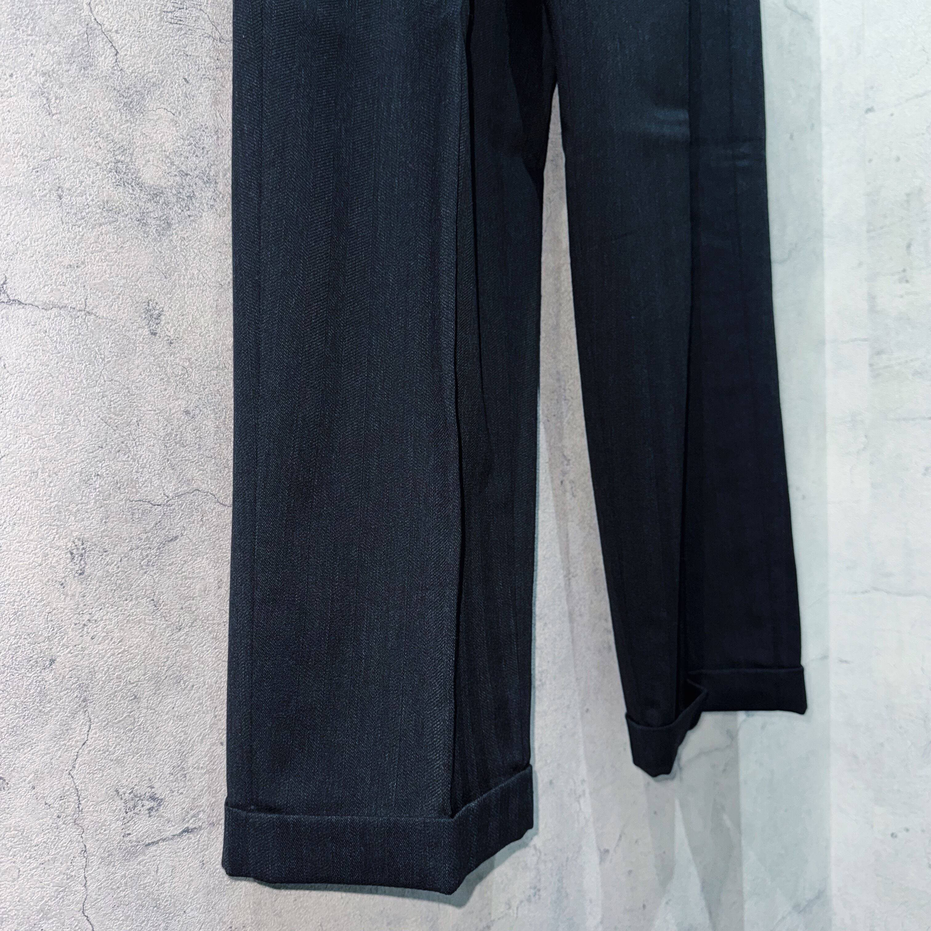 広めのピークドラペルに加え、男らしさを表現してくれるパワーショルダー。センタープレスが施された筒状の美シルエットで、セットで着用すれば圧巻の着こなしを叶えます。