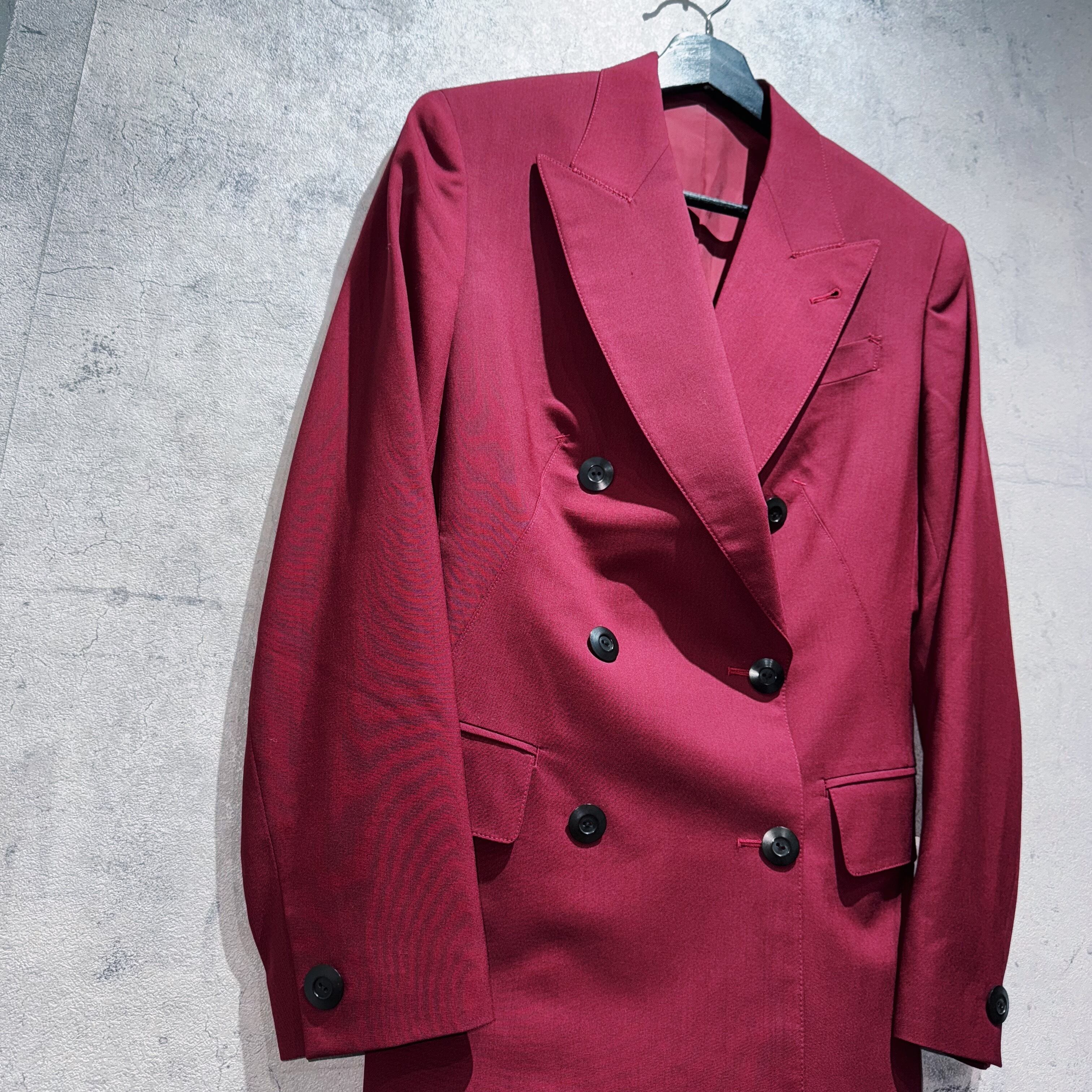 当店でもかなり人気の高いワインレッドカラーに身を包んだ、妖麗且つパンクさも感じる存在感のあるダブルブレストのセットアップ。