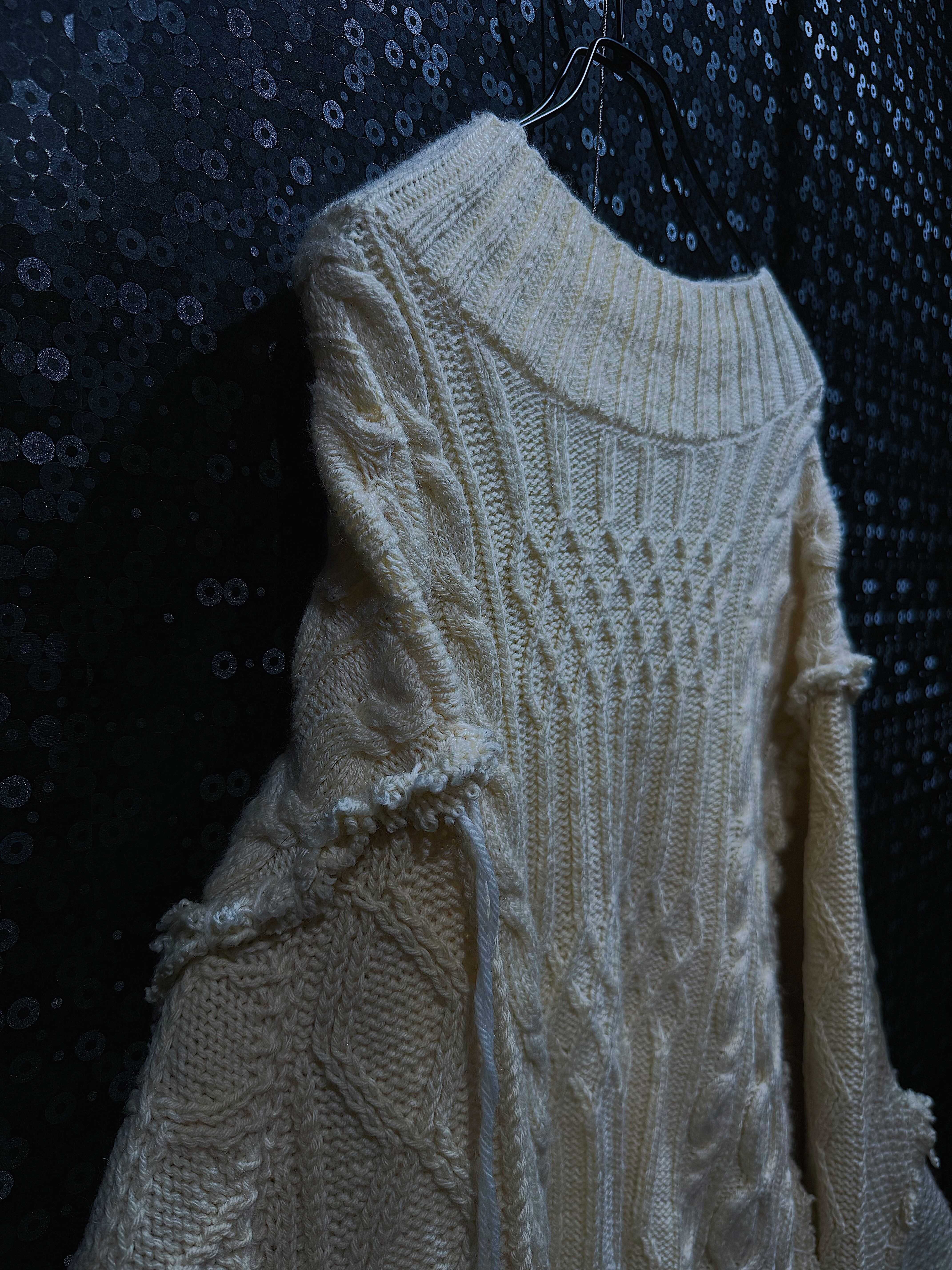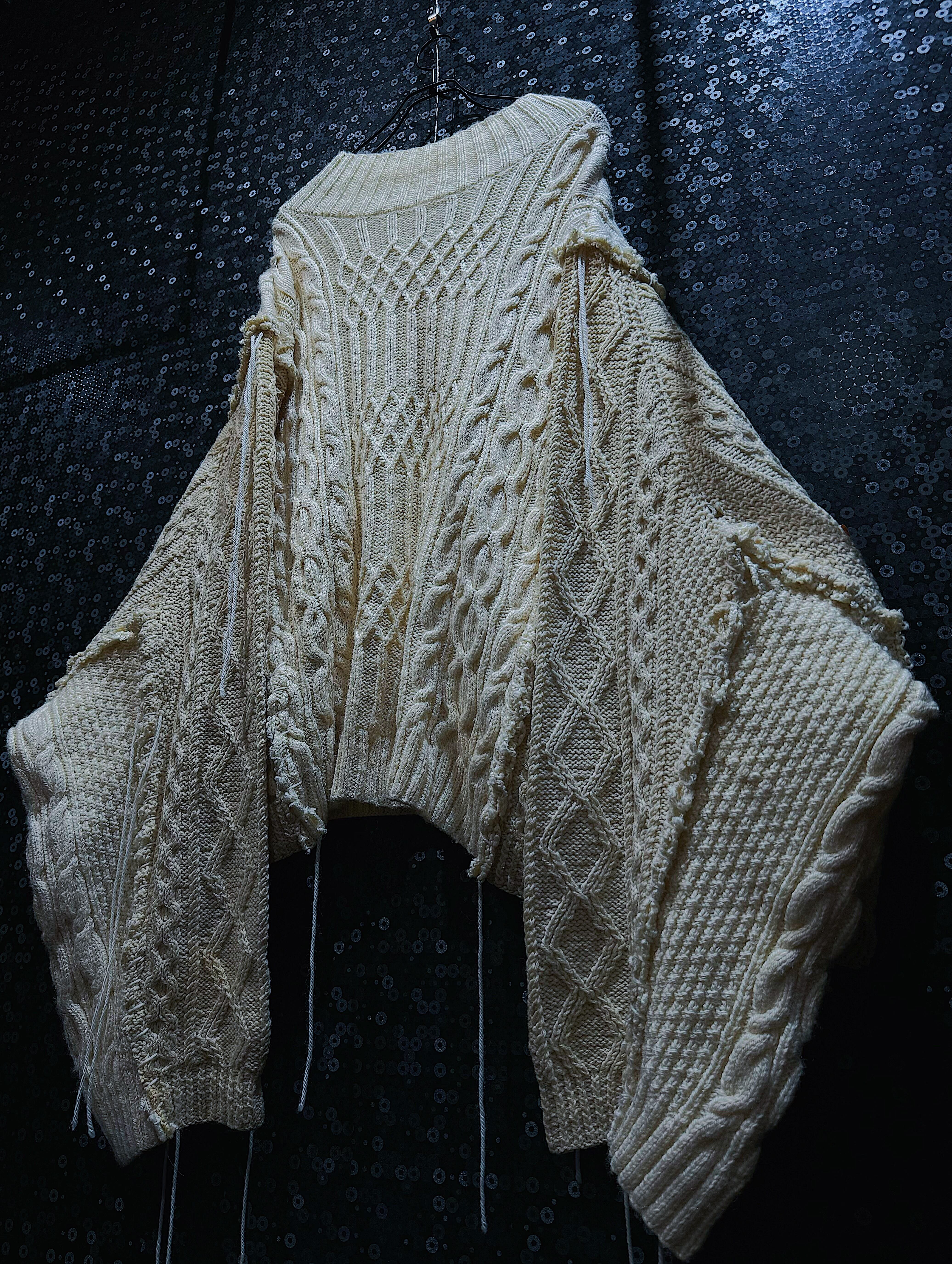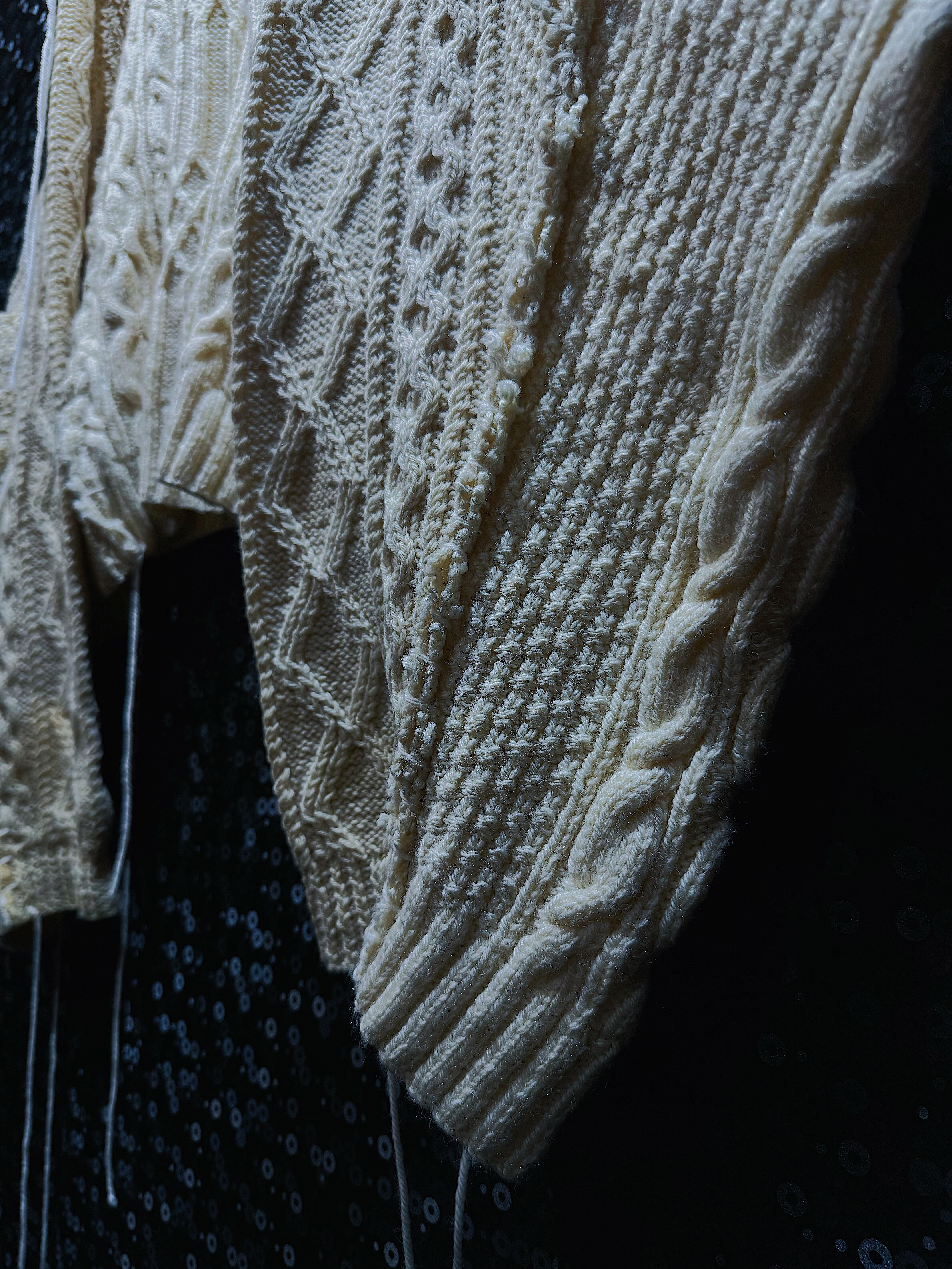 複数の模様編みや質感を大胆にドッキングさせたこの作品は、クラシックなフィッシャーマンニットの持つ伝統美を活かしながら、現代的でアバンギャルドなスタイルを提供します。