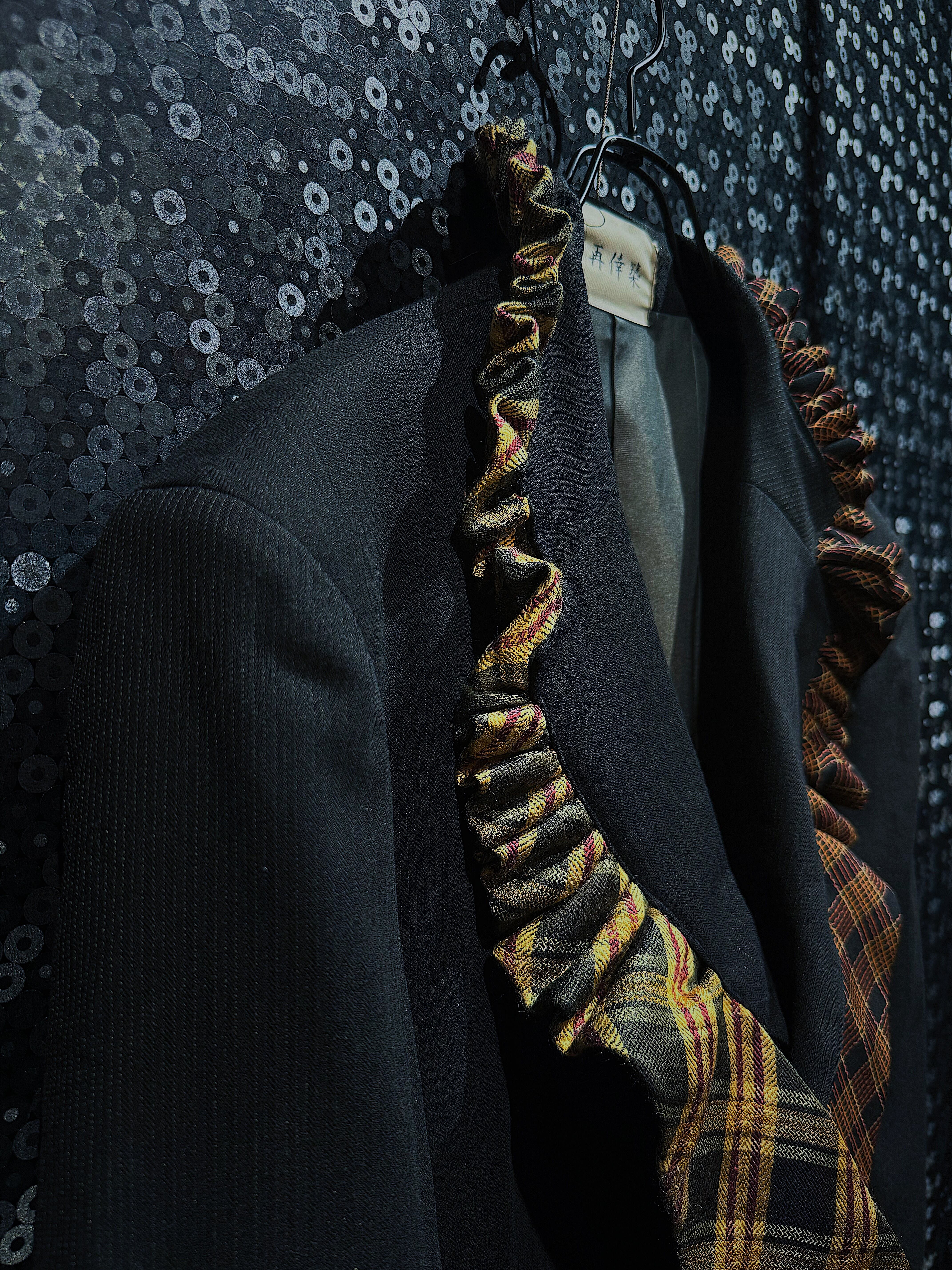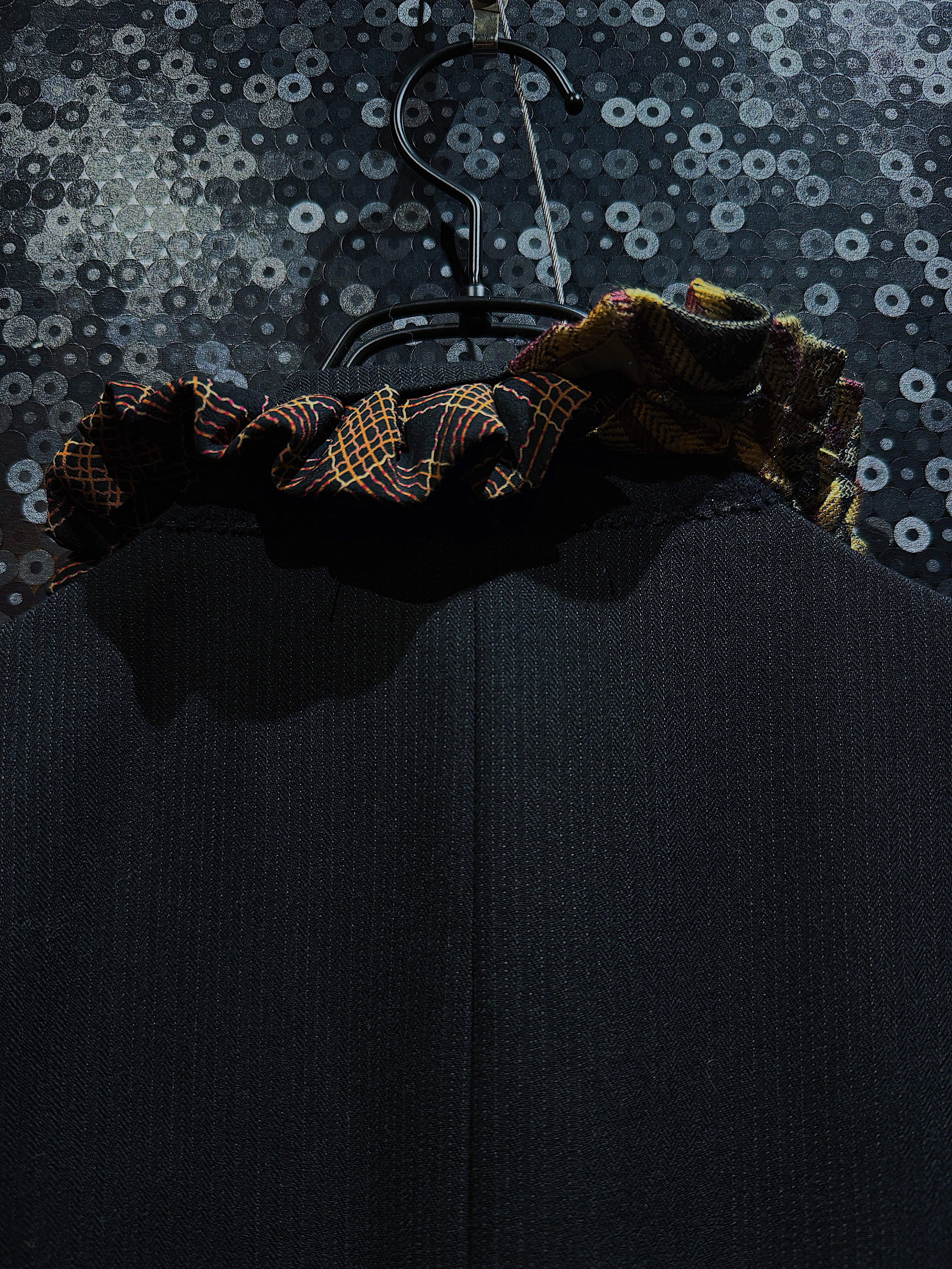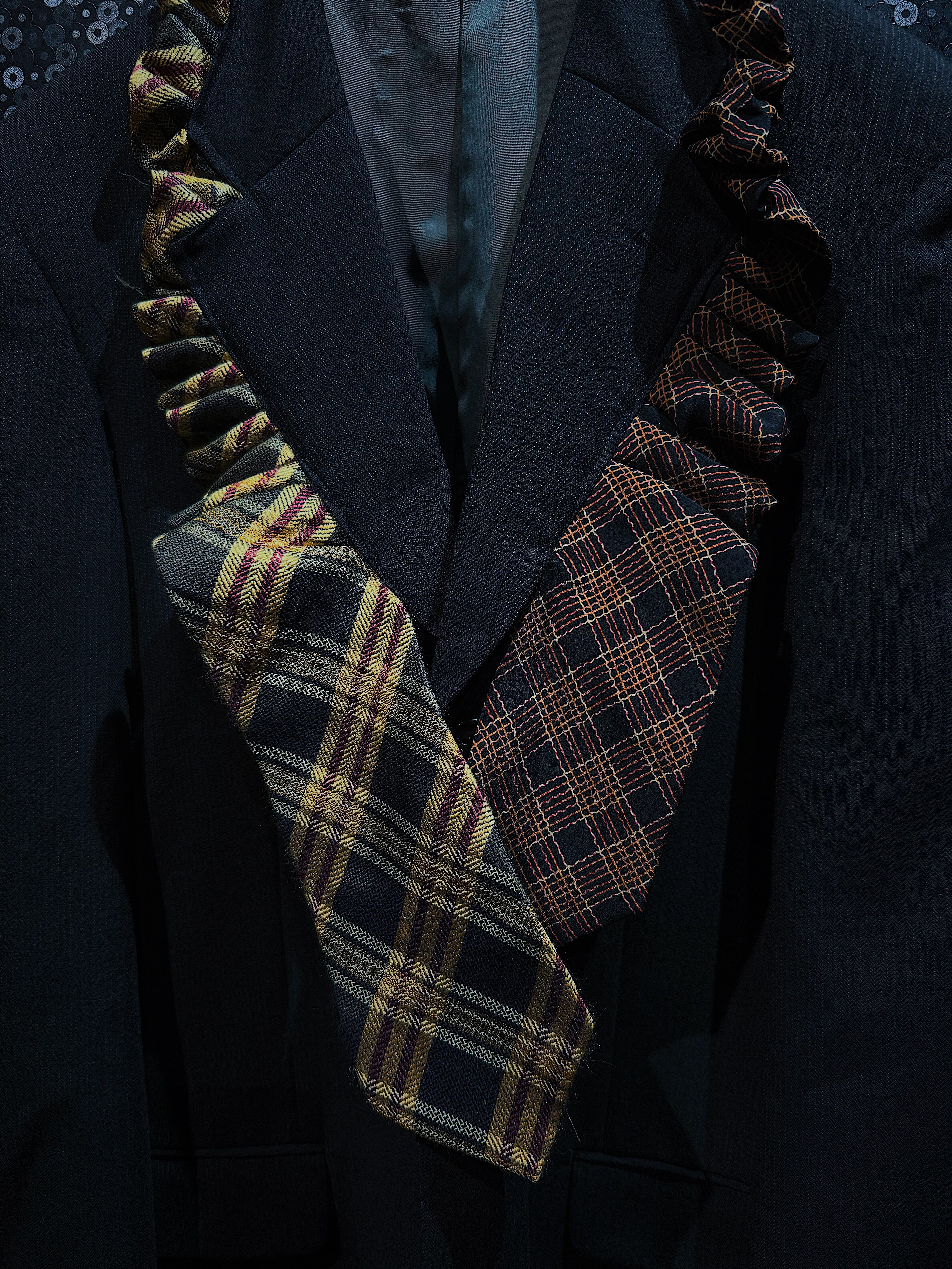 異なる柄のネクタイを組み合わせることで、クラシックなテーラードジャケットに遊び心を加え、より印象的な一着となっています。また、ネクタイのドッキングによりインナーのコーディネート幅が広がり、シャツやタートルネック、Tシャツなど様々なスタイルに対応可能です。日常使いから特別なシーンまで活躍する、再倖築の魅力を存分に引き出した一着です。