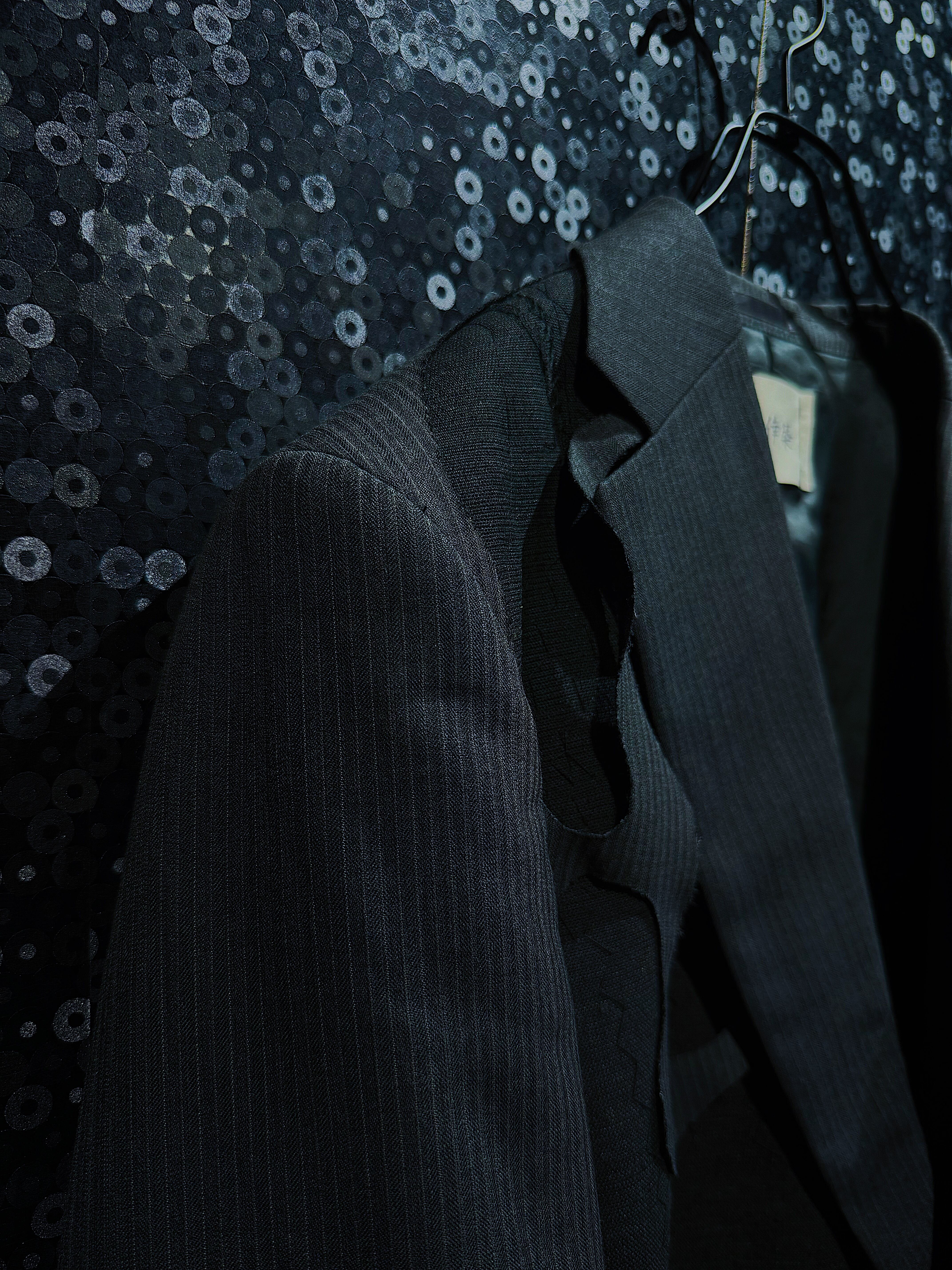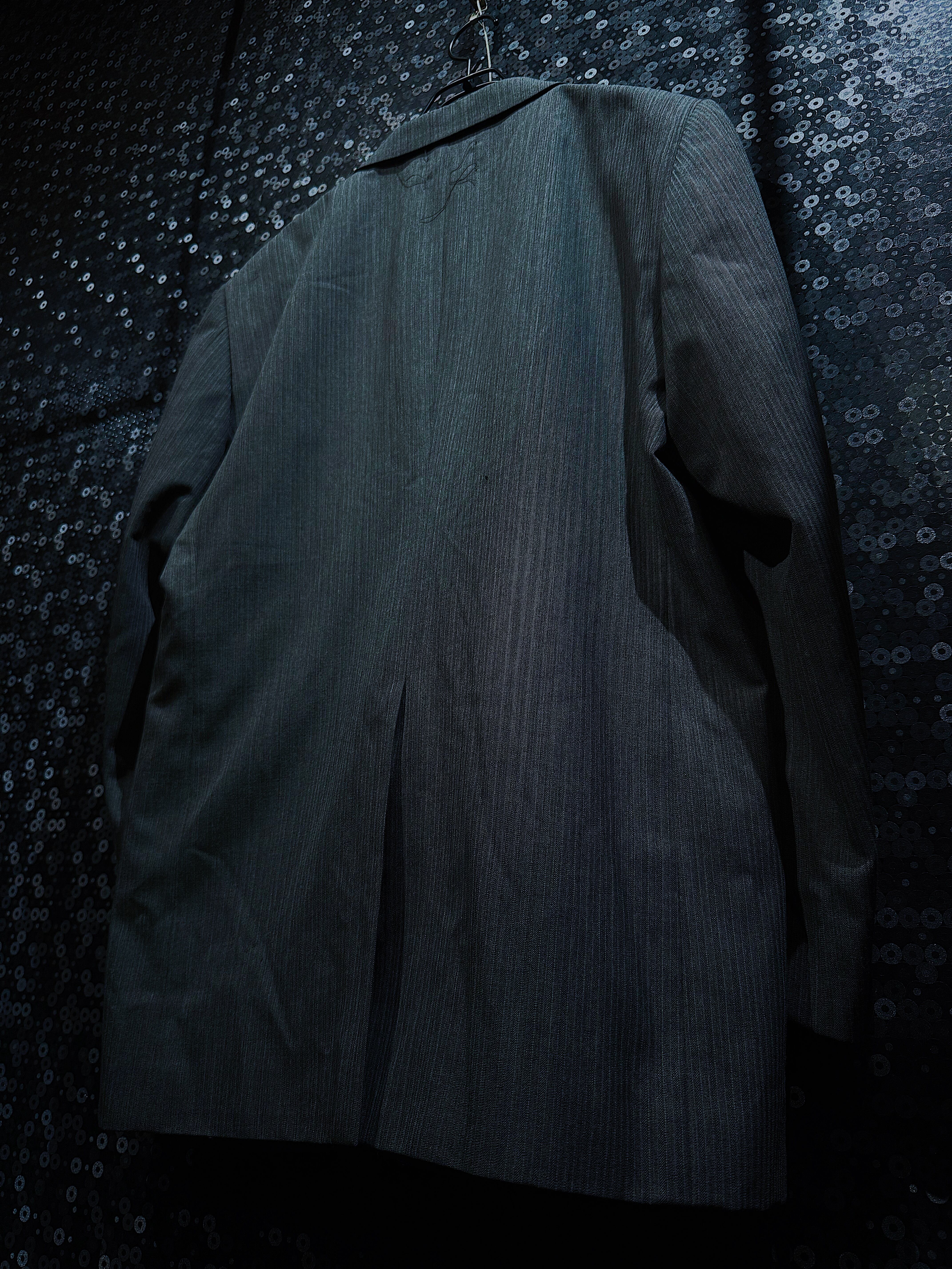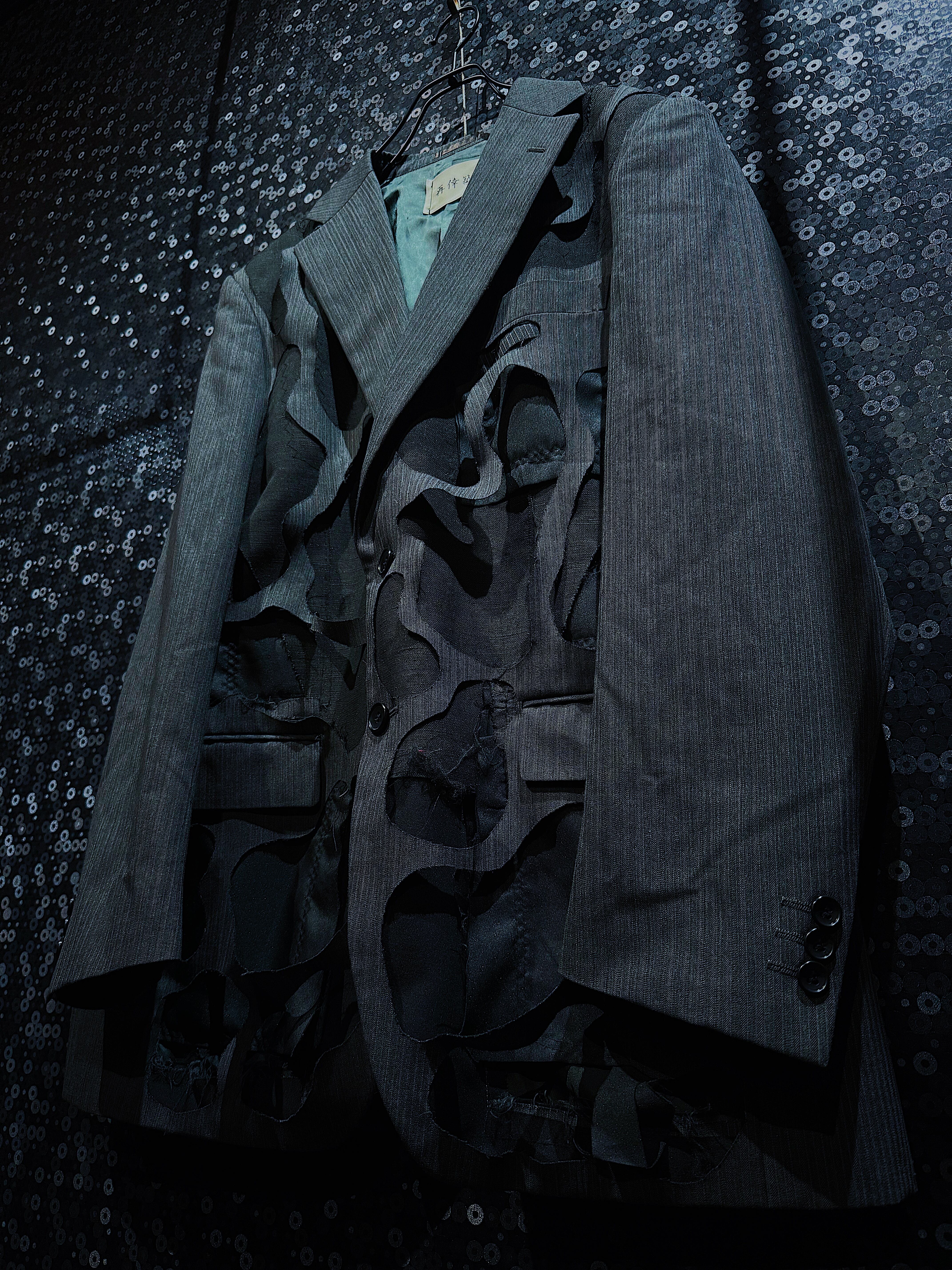 この再倖築のテーラードジャケットは、不規則に開けられた穴が最大の特徴です。大胆に施されたこのデザインは、空間を取り入れたアートのようで、独特の不気味さと前衛的な美しさを感じさせます。