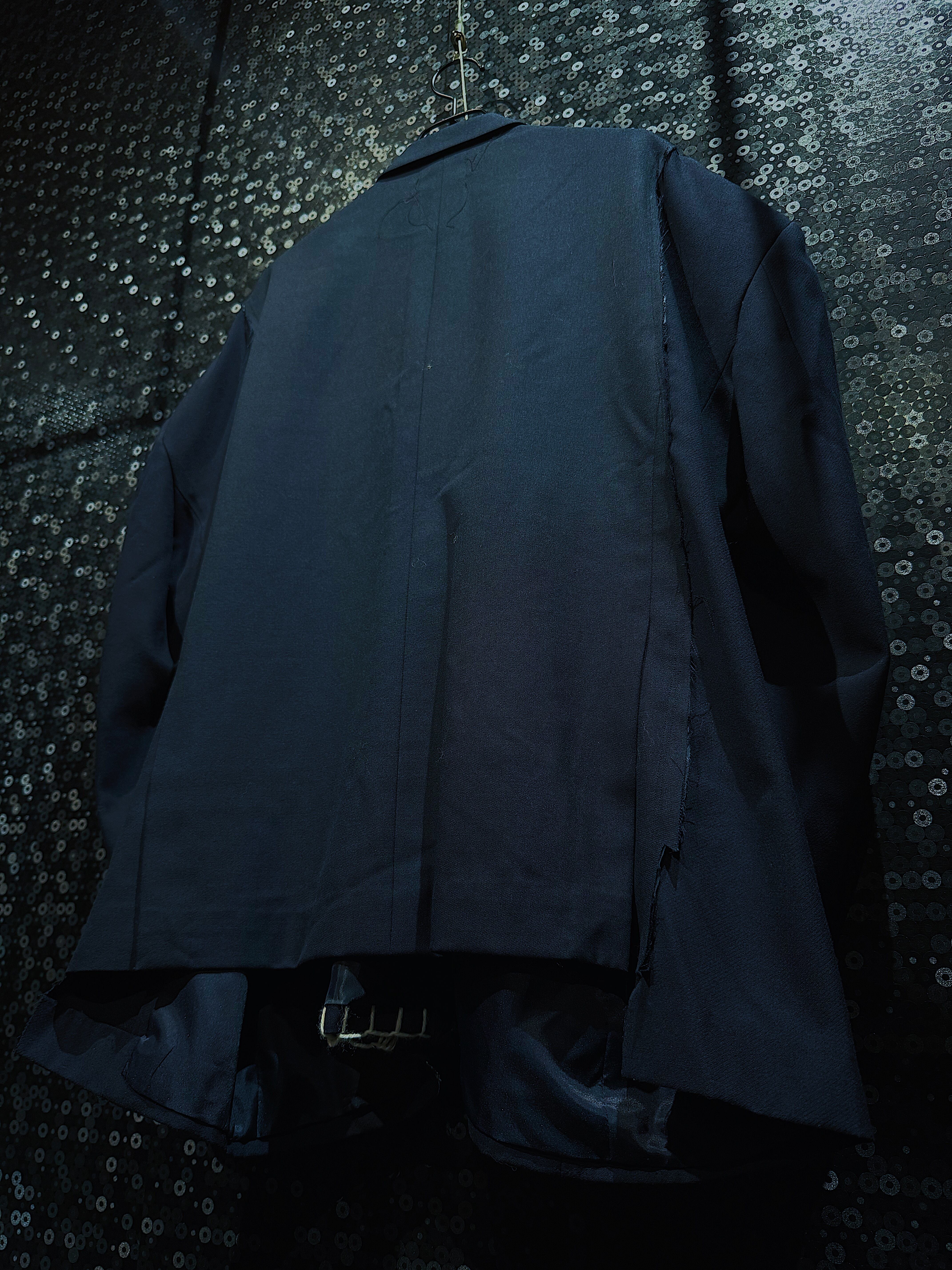 このアイテムは、伝統的なスーツスタイルに新たな解釈を加えた再倖築の魅力を象徴するデザインです。