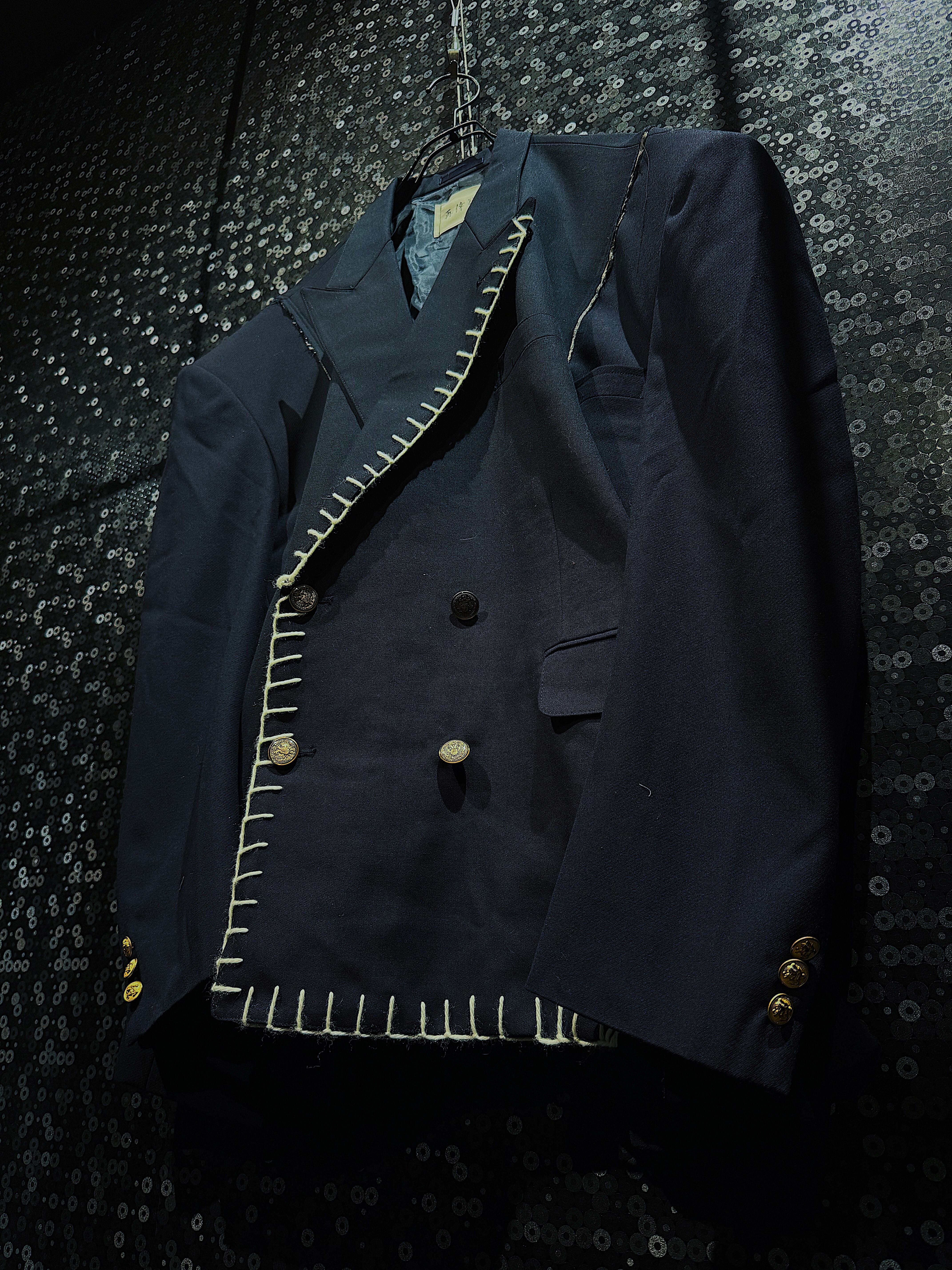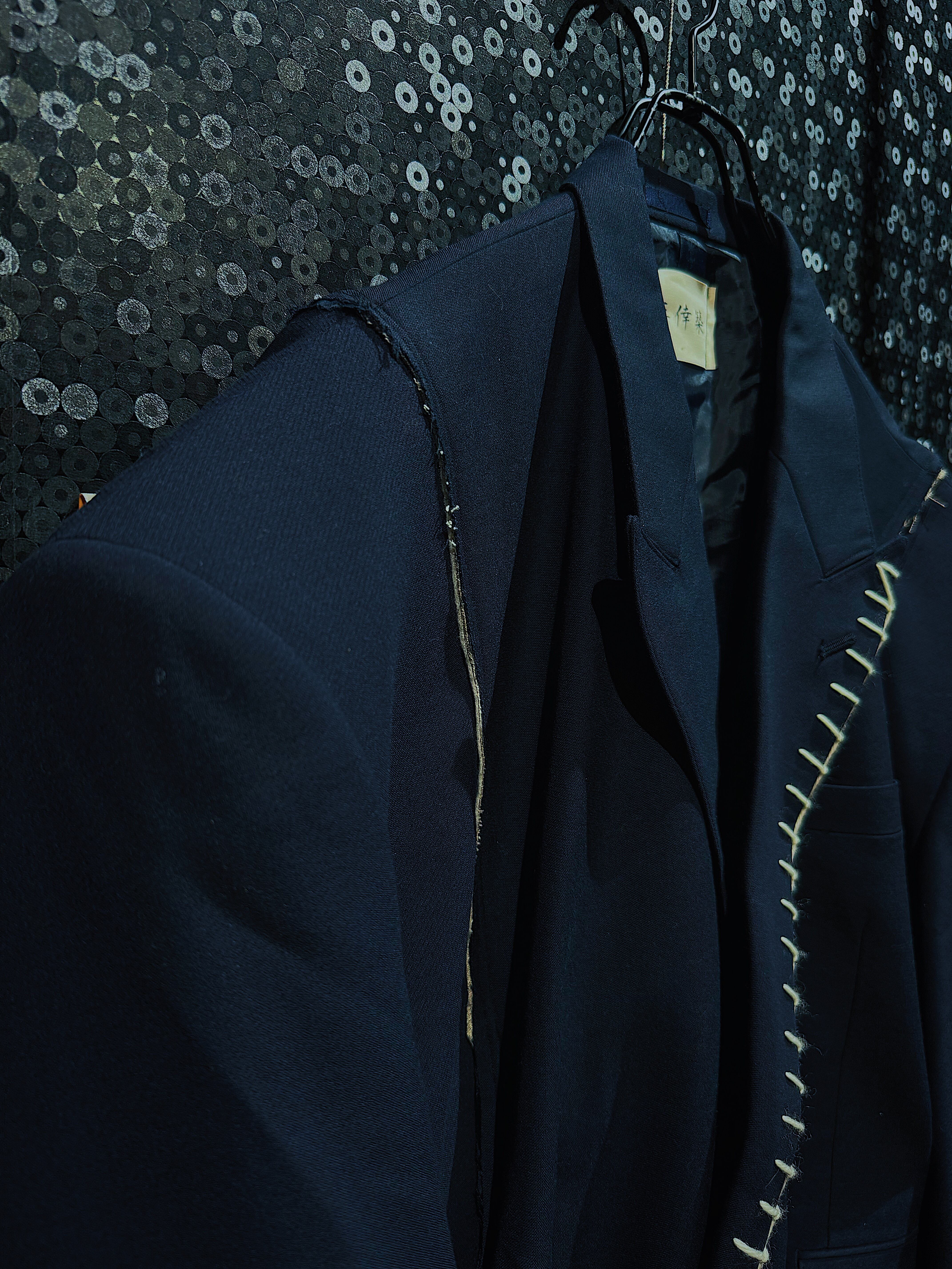 クラシックなテーラードの要素をベースにしながらも、大胆なステッチラインが全体にアクセントを加えています。