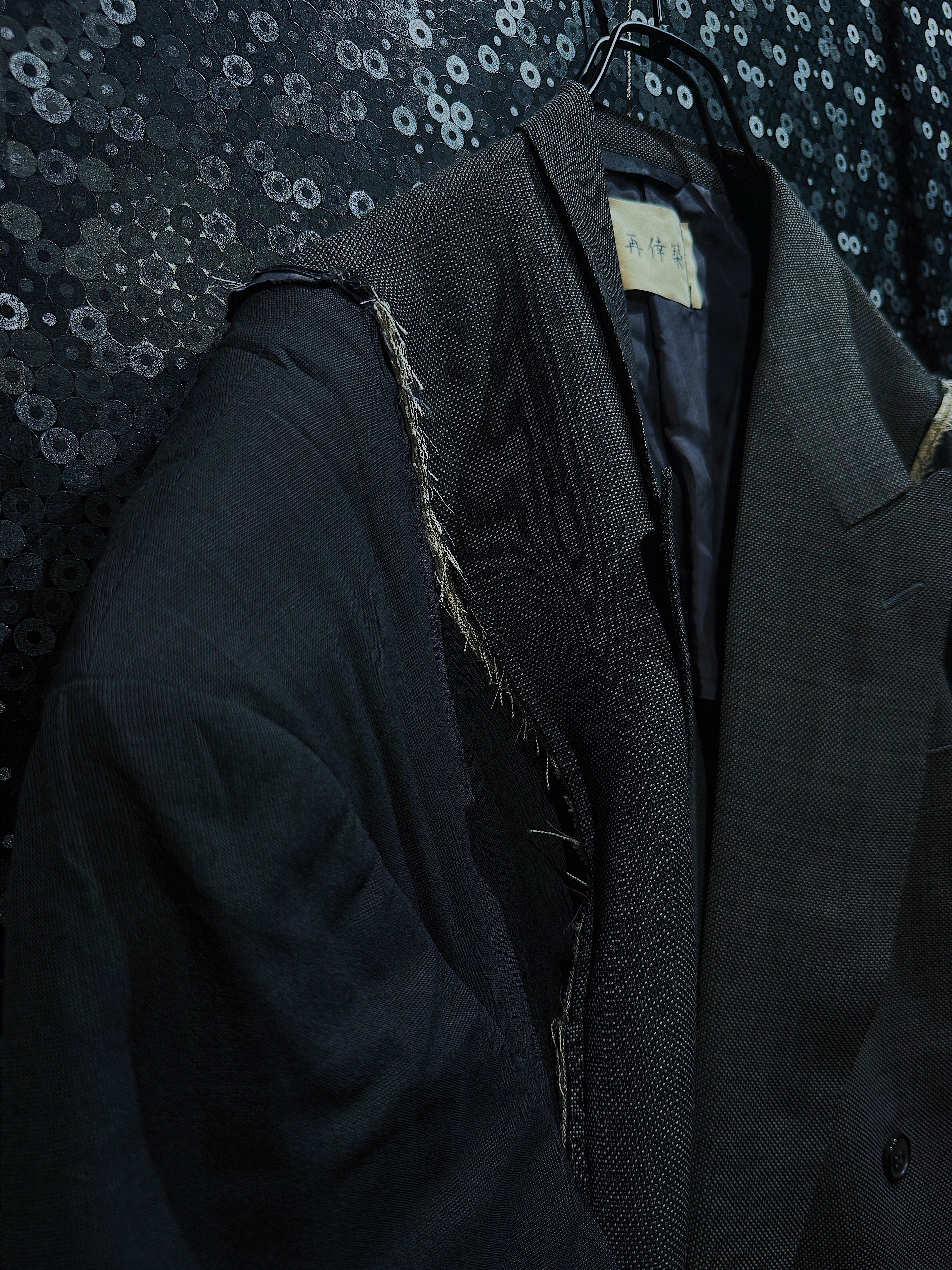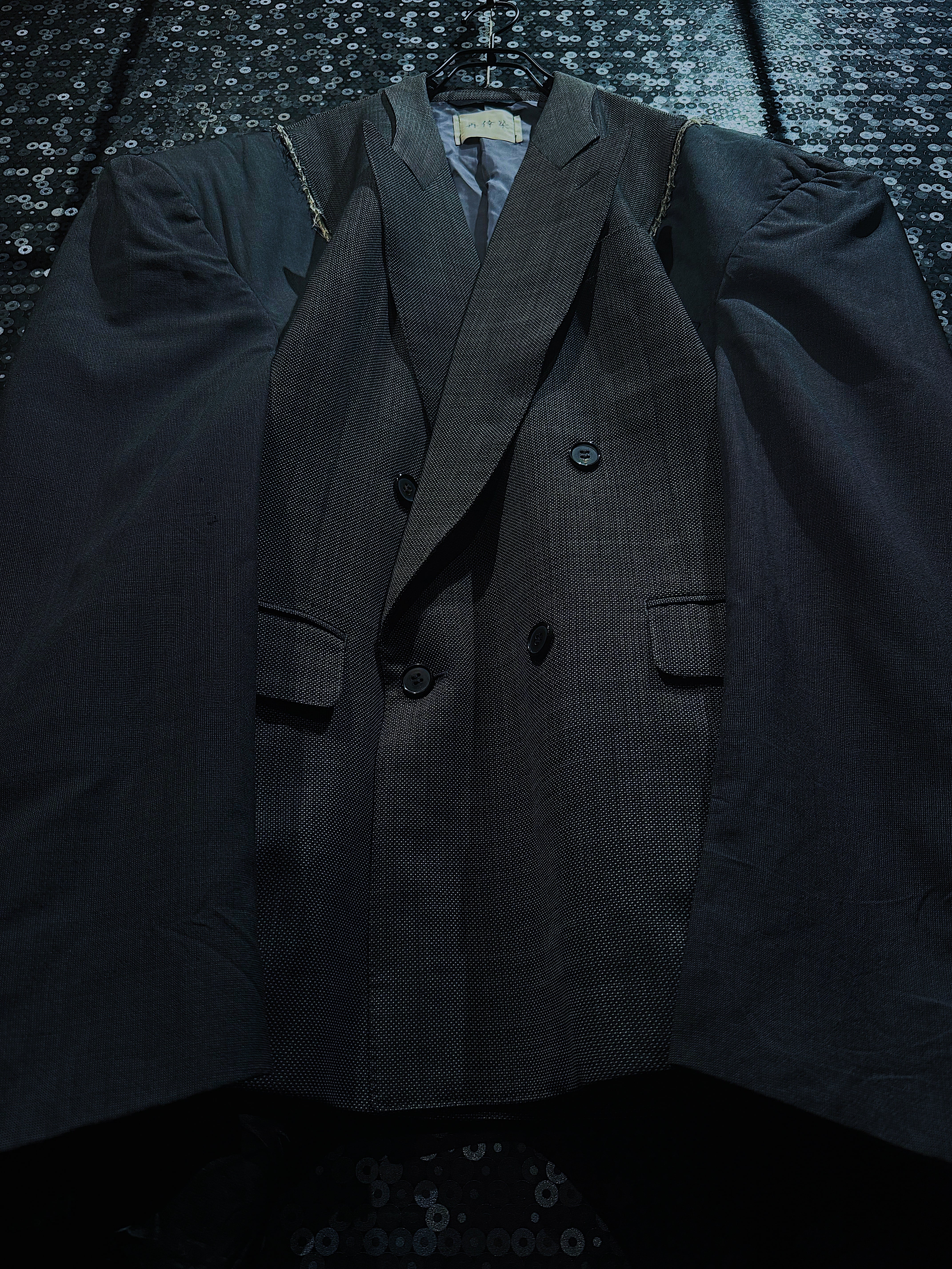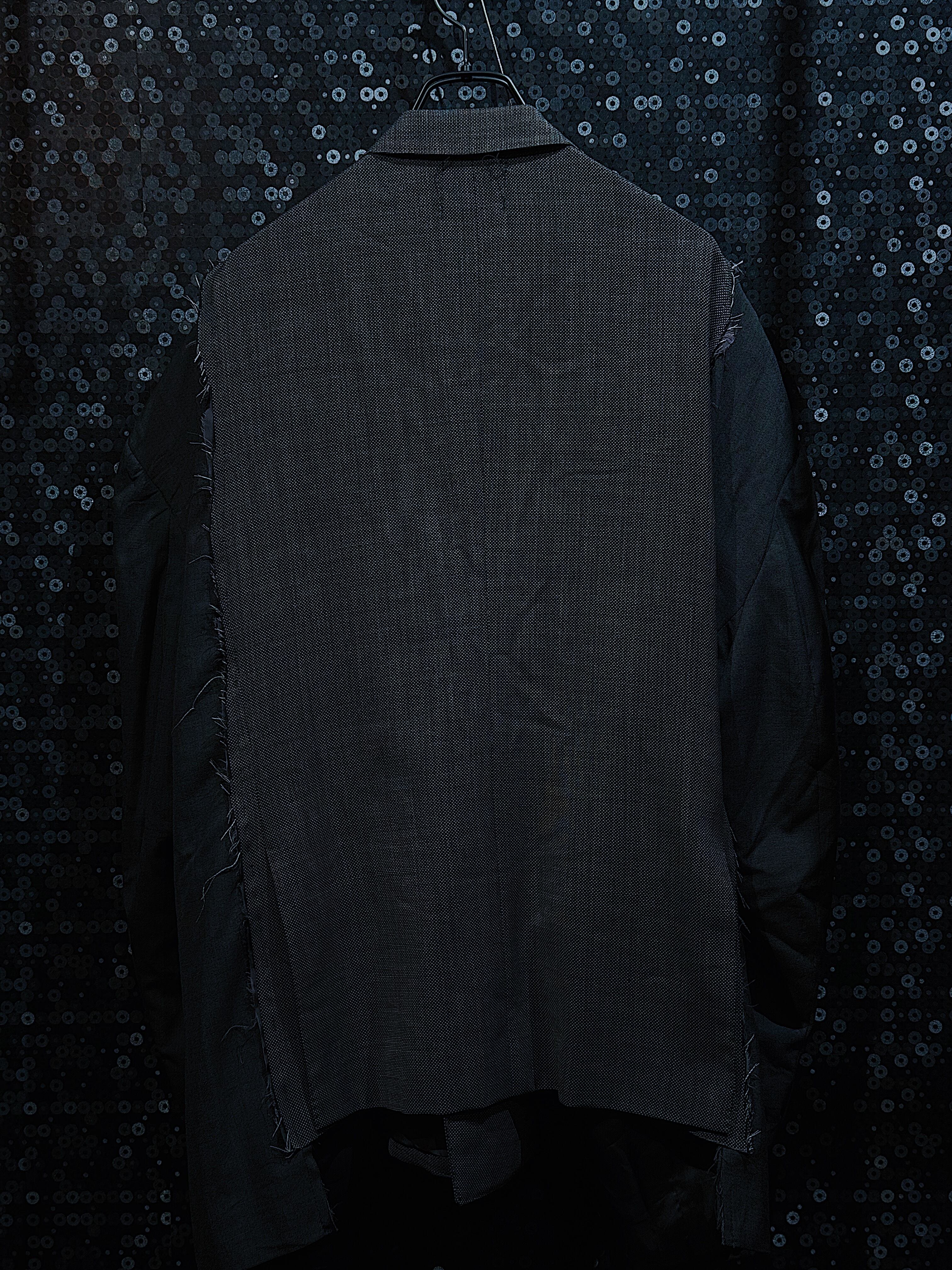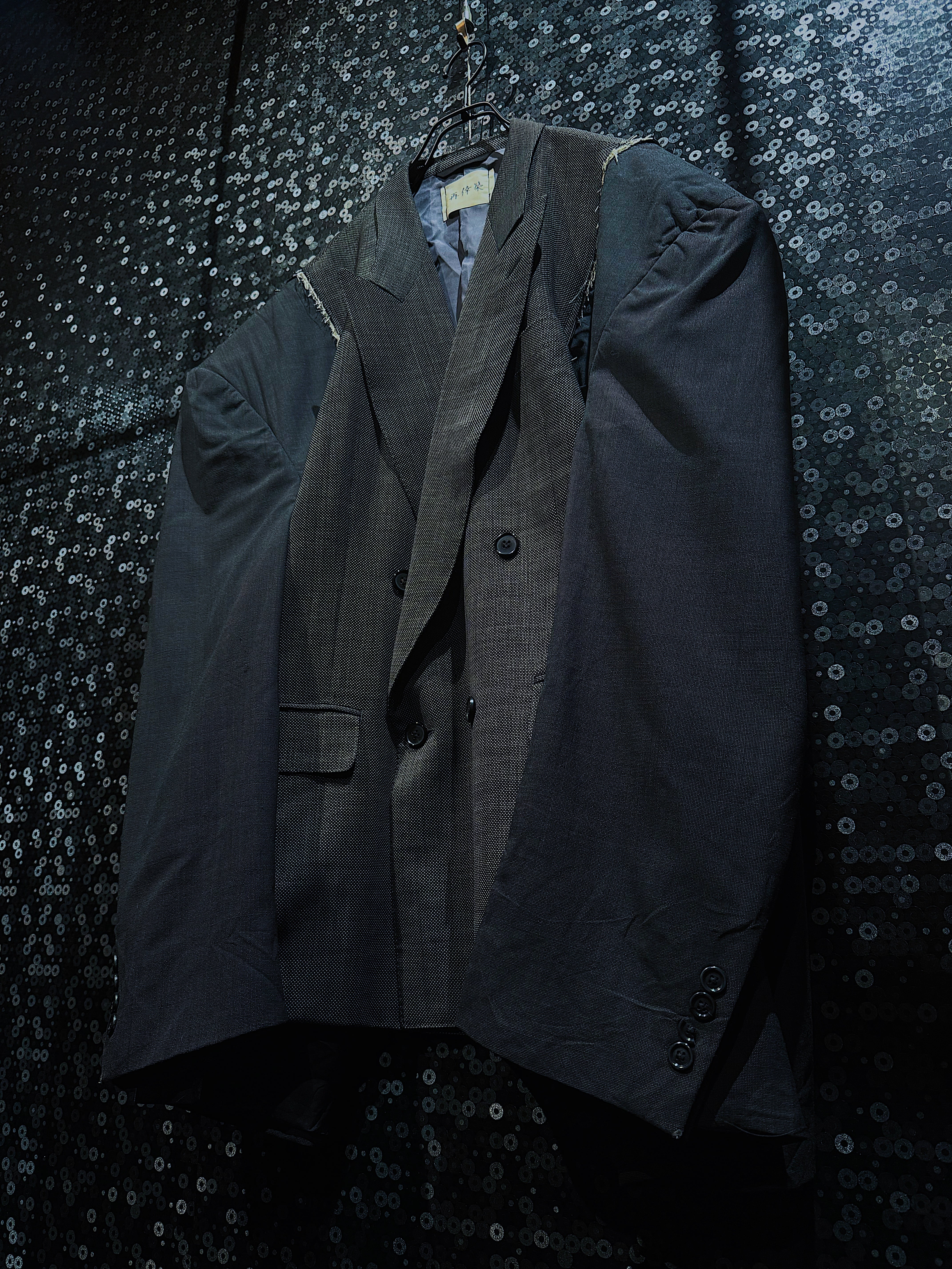 この再倖築テーラードは、「肩幅で全てを語りたい!」というあなたにぴったりな一着です。異なる材質をドッキングすることで、まるで「こっちが正装で、こっちは遊び心!」と主張しているかのようなデザインが魅力的。