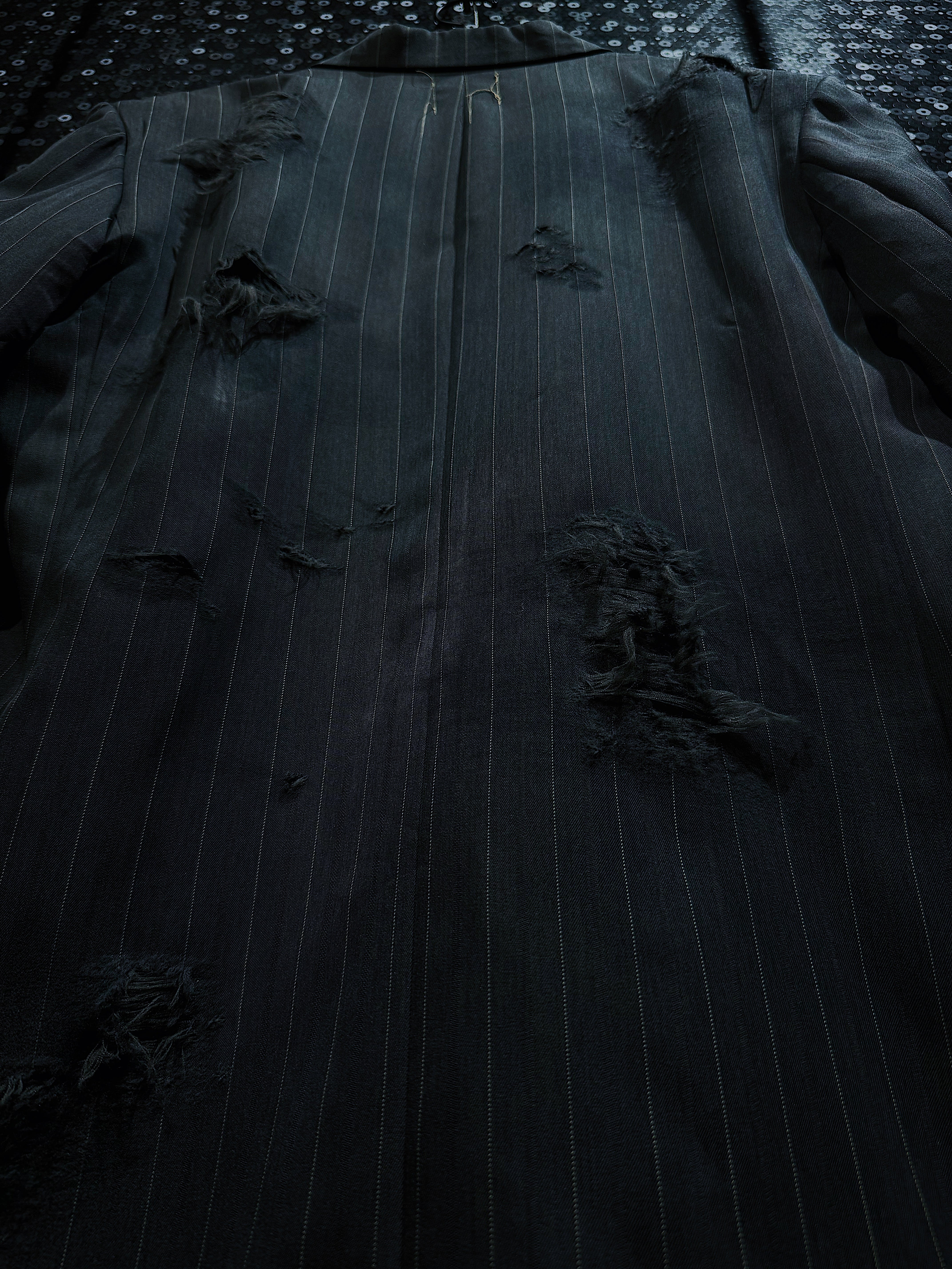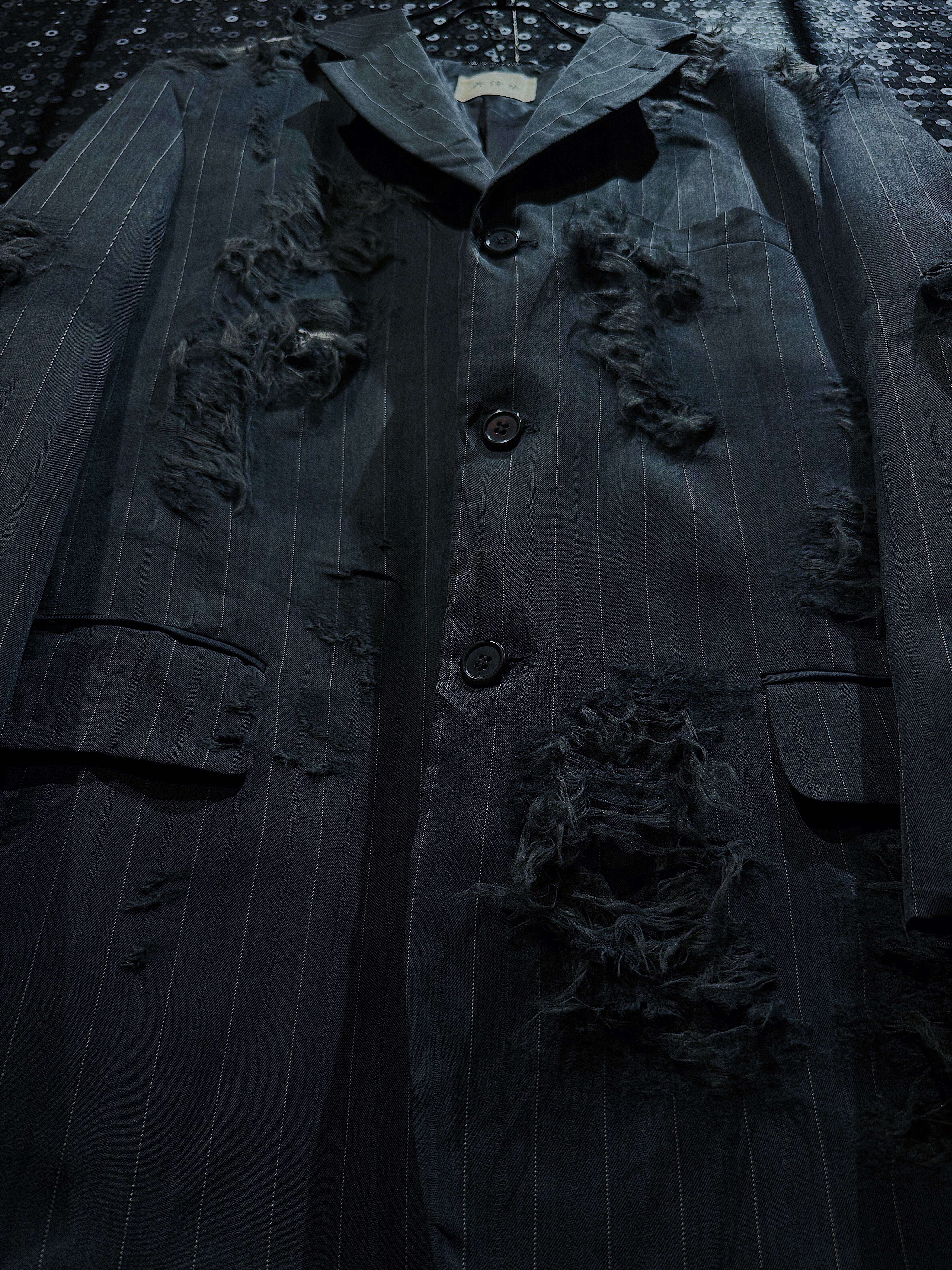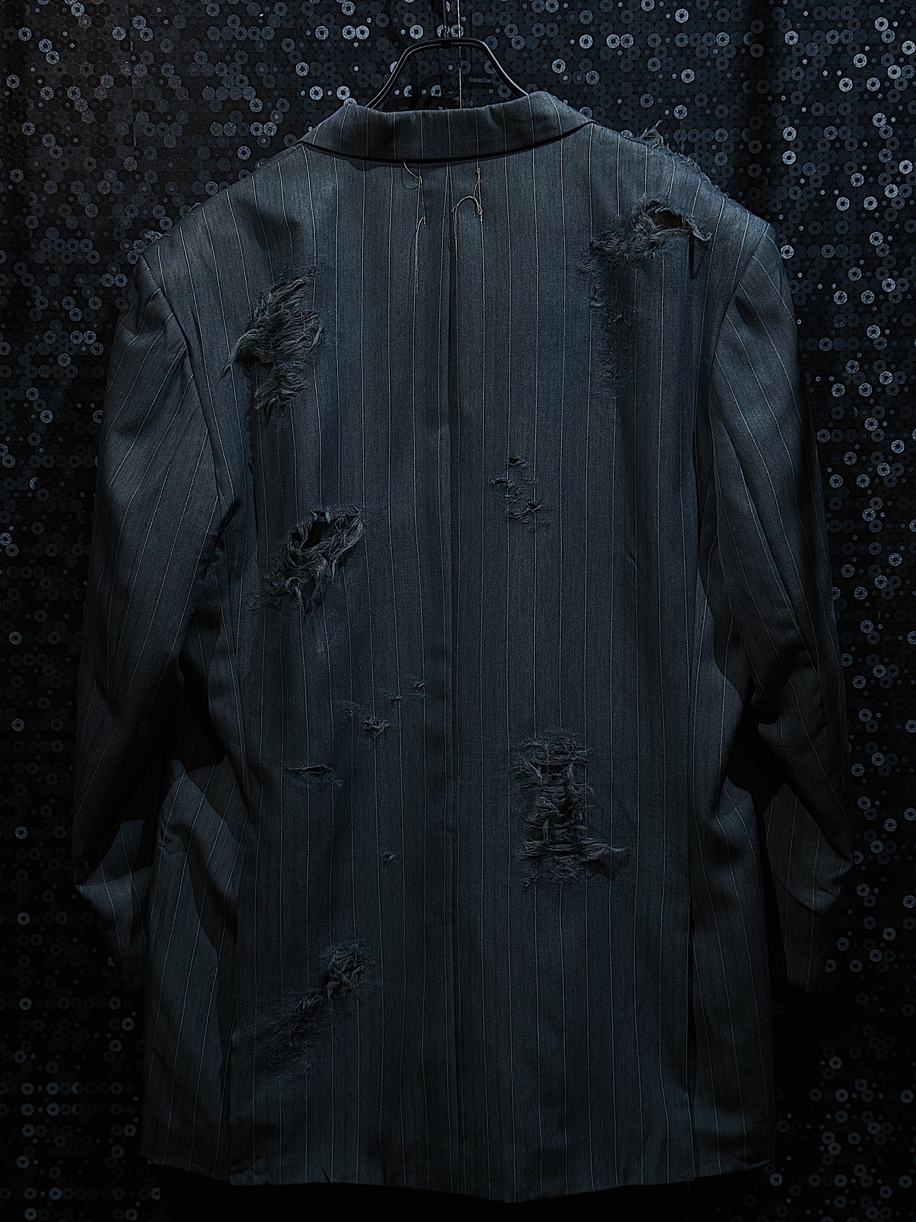 ドッキングやステッチといった技法をあえて使わず、クラシックなテーラードジャケットを大胆に再構築しています。ベースとなるストライプ柄のクラシックなテーラードは、もともと渋みのある印象を与えるデザインですが、そこにボロ加工を施すことで、さらに奥深いヴィンテージ感を演出しています。