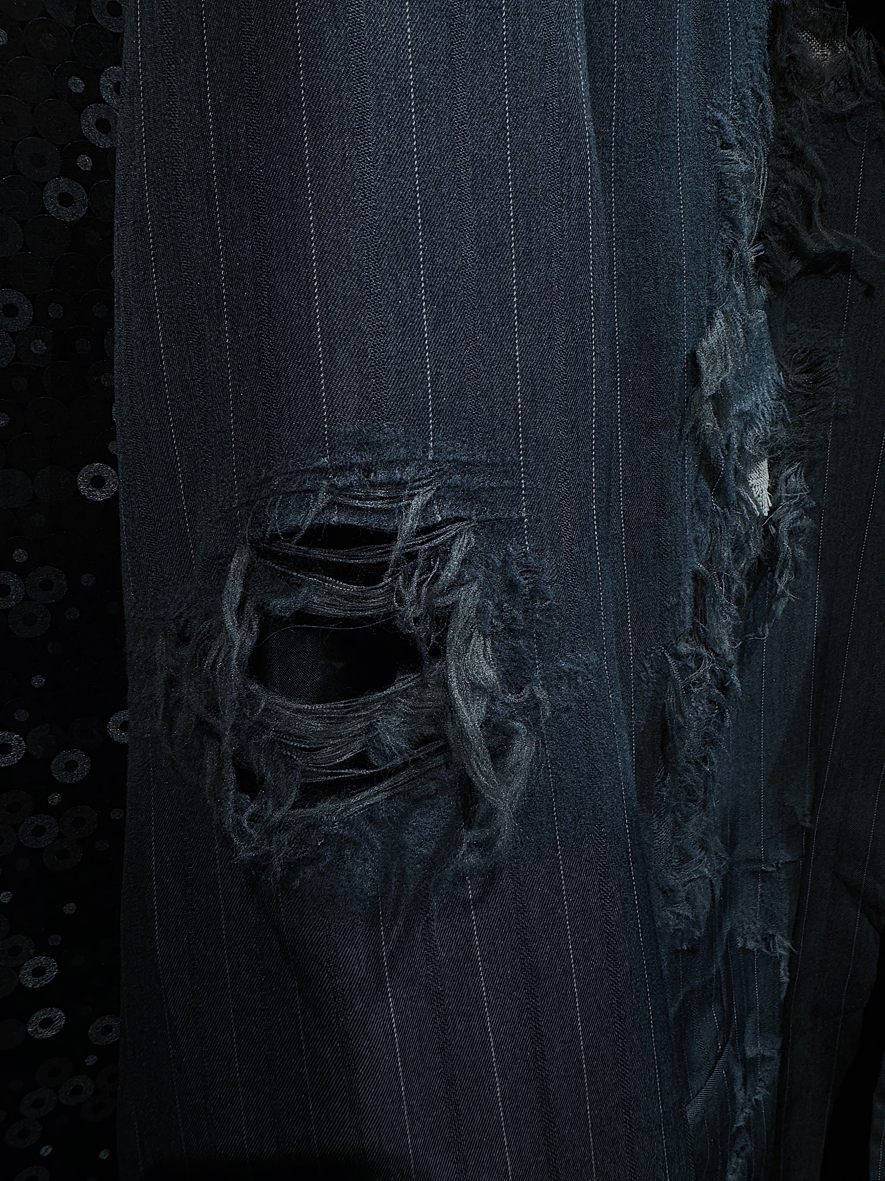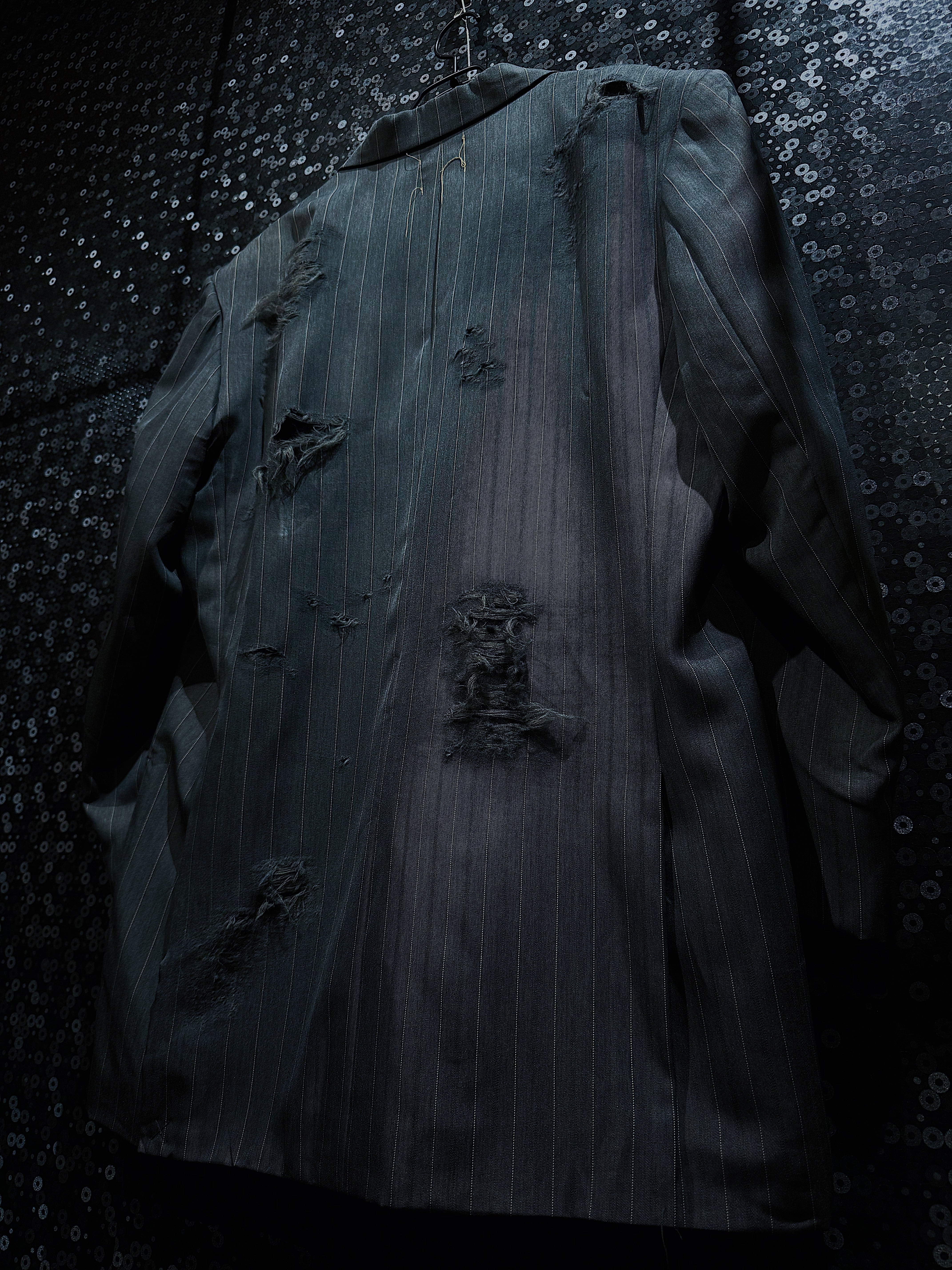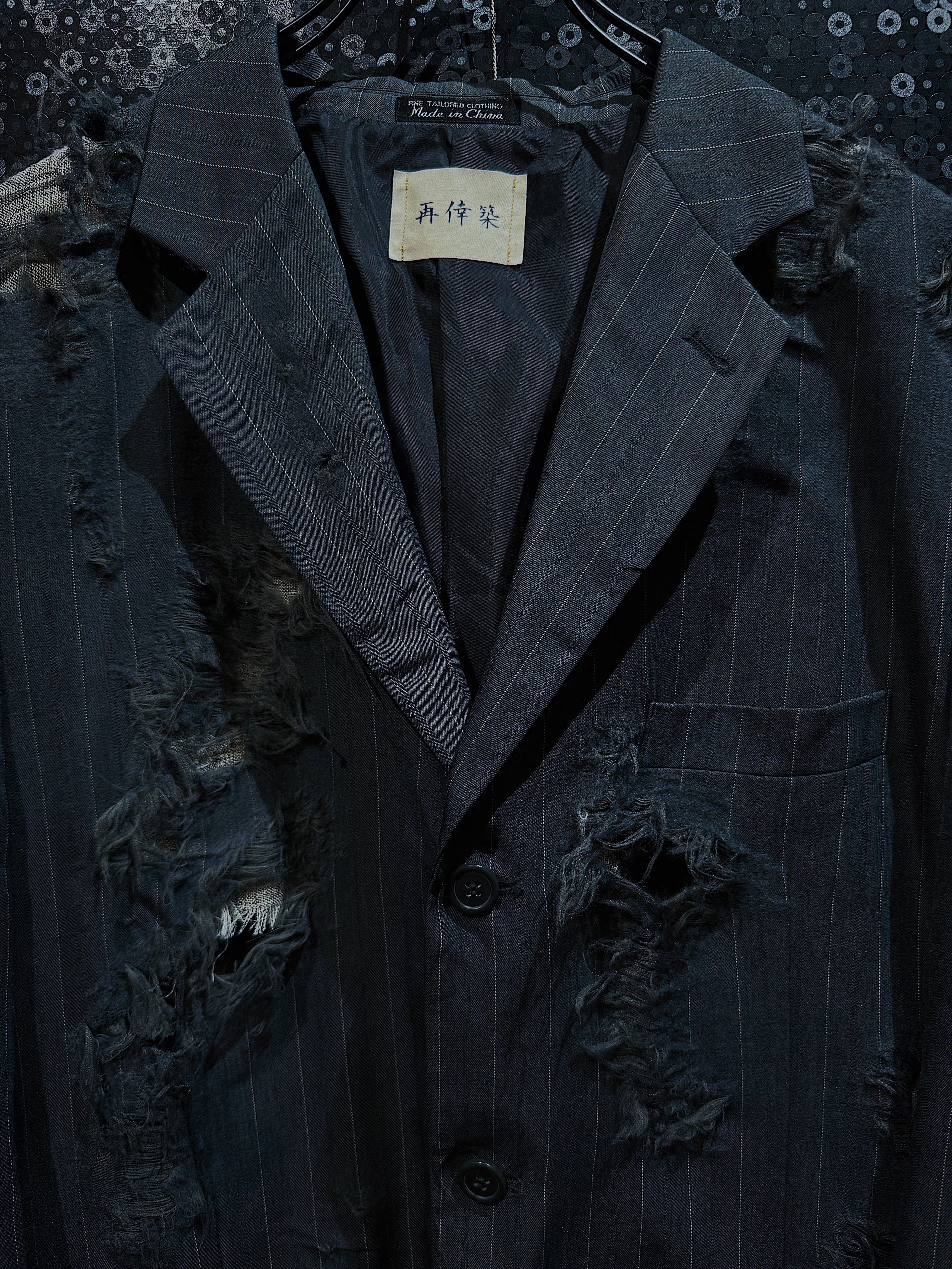 ドッキングやステッチといった技法をあえて使わず、クラシックなテーラードジャケットを大胆に再構築しています。ベースとなるストライプ柄のクラシックなテーラードは、もともと渋みのある印象を与えるデザインですが、そこにボロ加工を施すことで、さらに奥深いヴィンテージ感を演出しています。