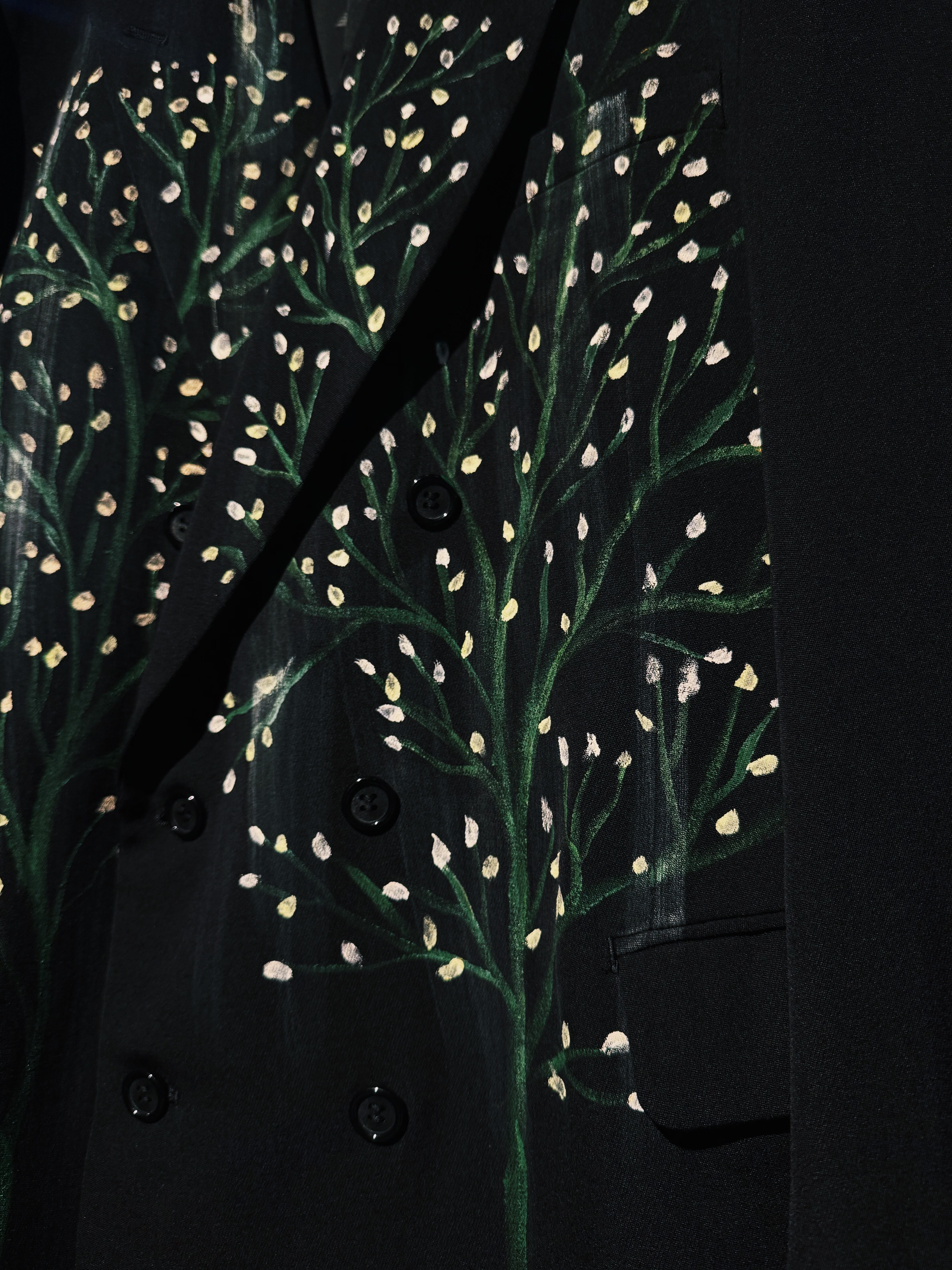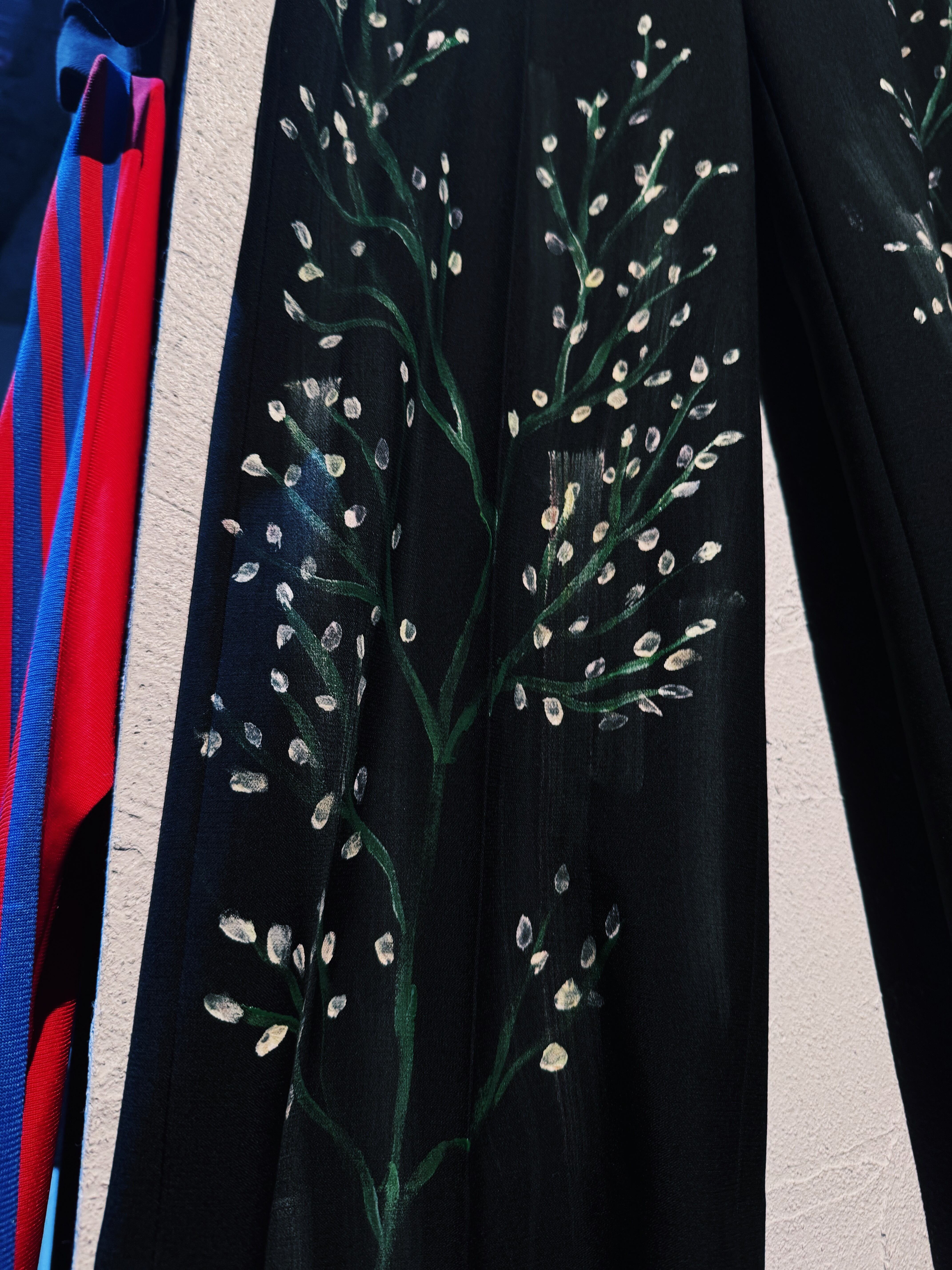 表面には可憐かつ華やか雰囲気を醸し出す鈴蘭が、背面には美しい様々な手が描かれもはや1つの作品として芸術を嗜むことができるかと。ファッションとアートを楽しめる素晴らしい逸品。