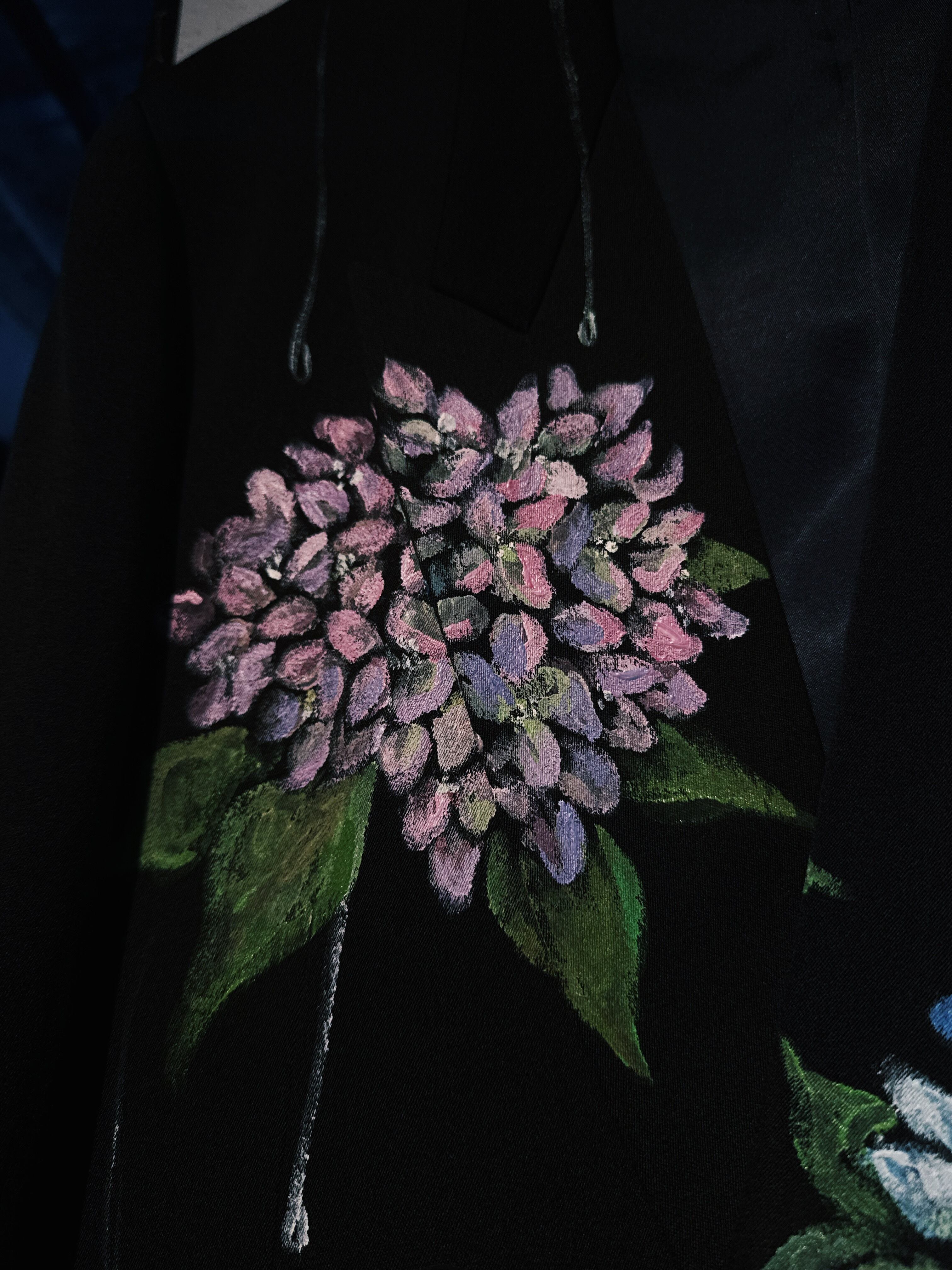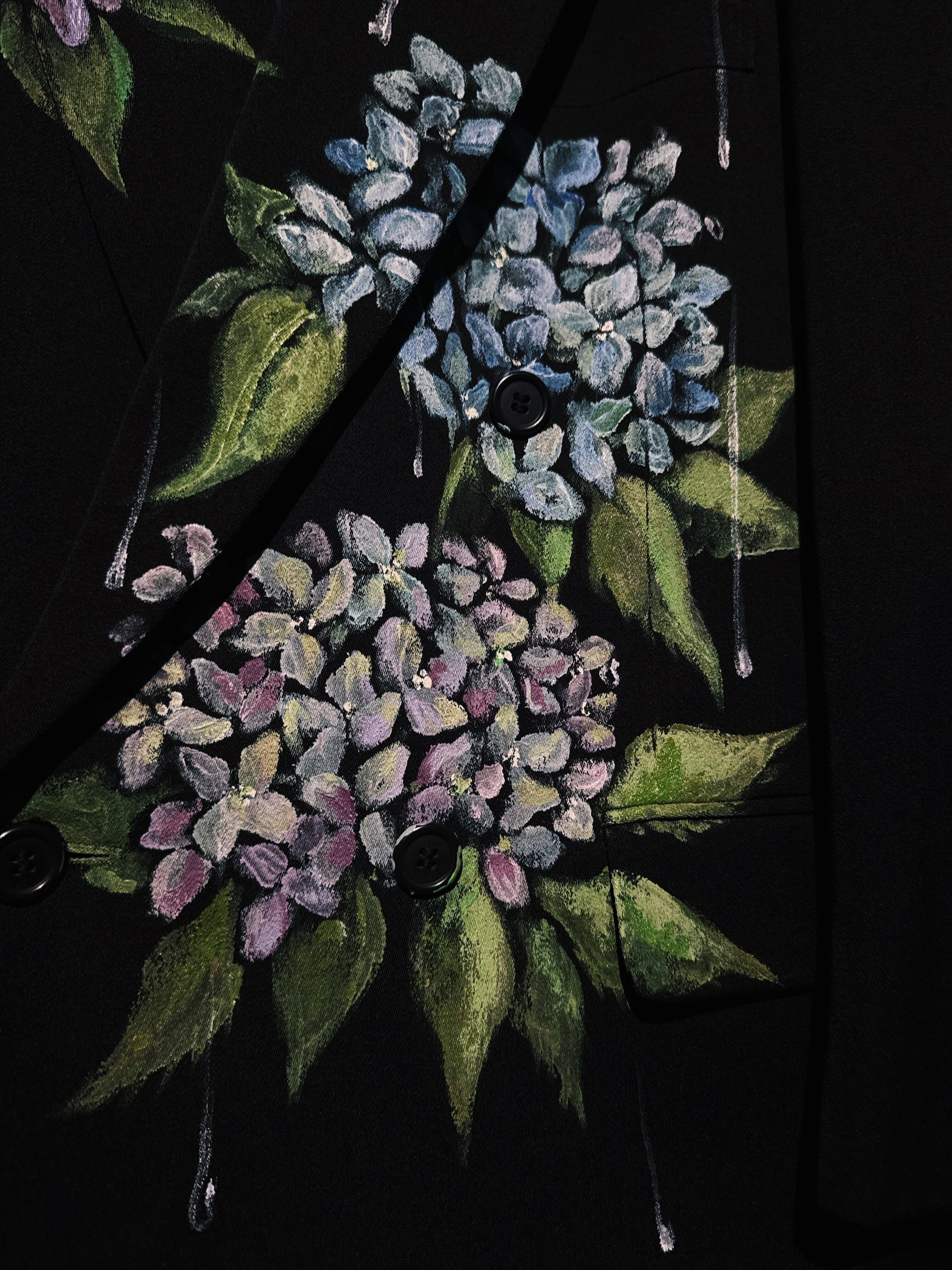 表面には可憐かつ華やか雰囲気を醸し出す紫陽花が、背面には美しい紫陽花と蛙が描かれもはや1つの作品として芸術を嗜むことができるかと。ファッションとアートを楽しめる素晴らしい逸品。