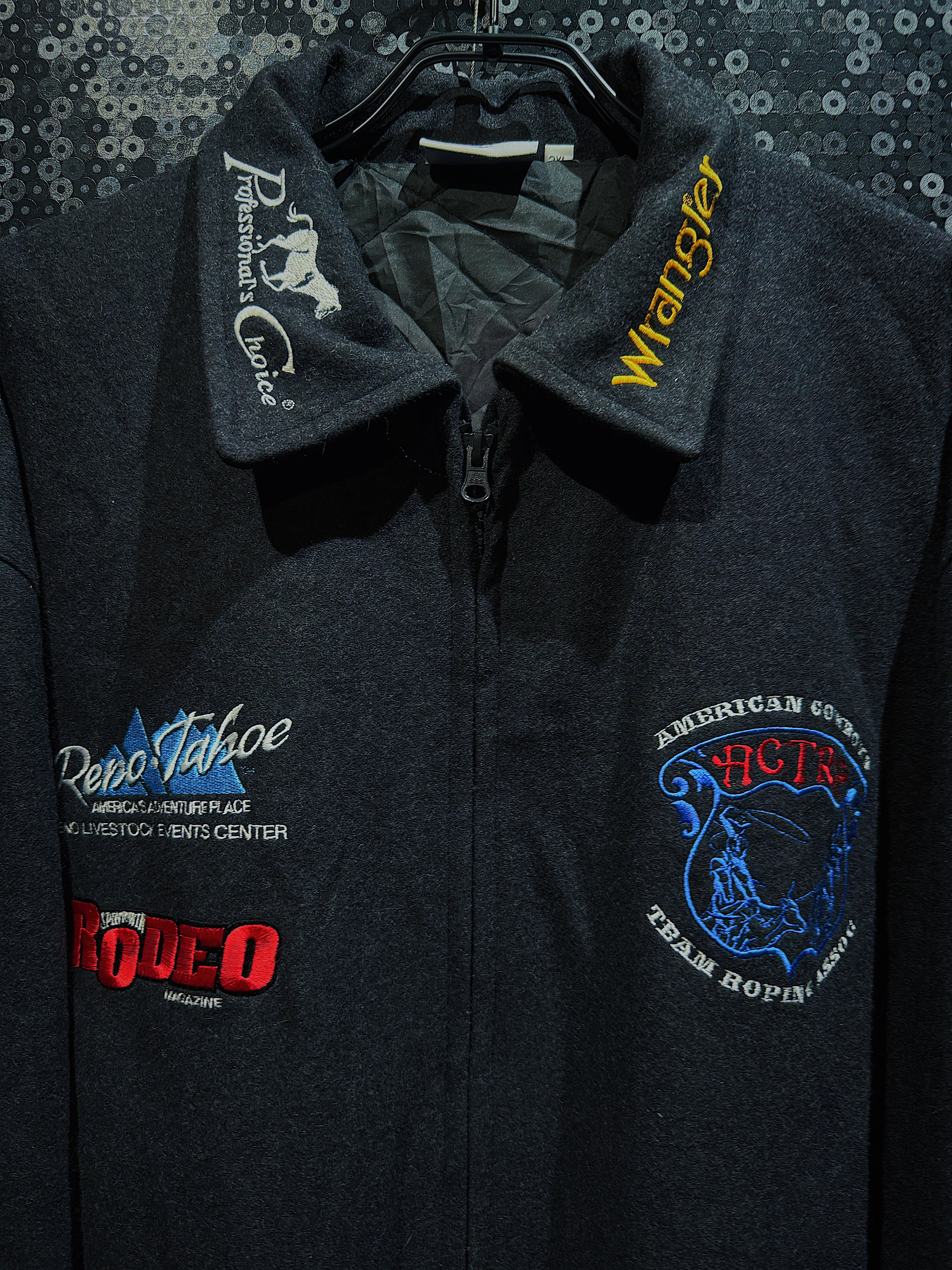 このヴィンテージレーシングジャケットは、WranglerとProfession’s Choiceのコラボ商品で、レーシングやロデオをテーマにしたデザインが魅力です。各ブランドのワッペンには、それぞれのアイデンティティやスポンサーシップの象徴が散りばめられており、ジャケット全体を通じてスポーツやアウトドア文化を感じさせます。