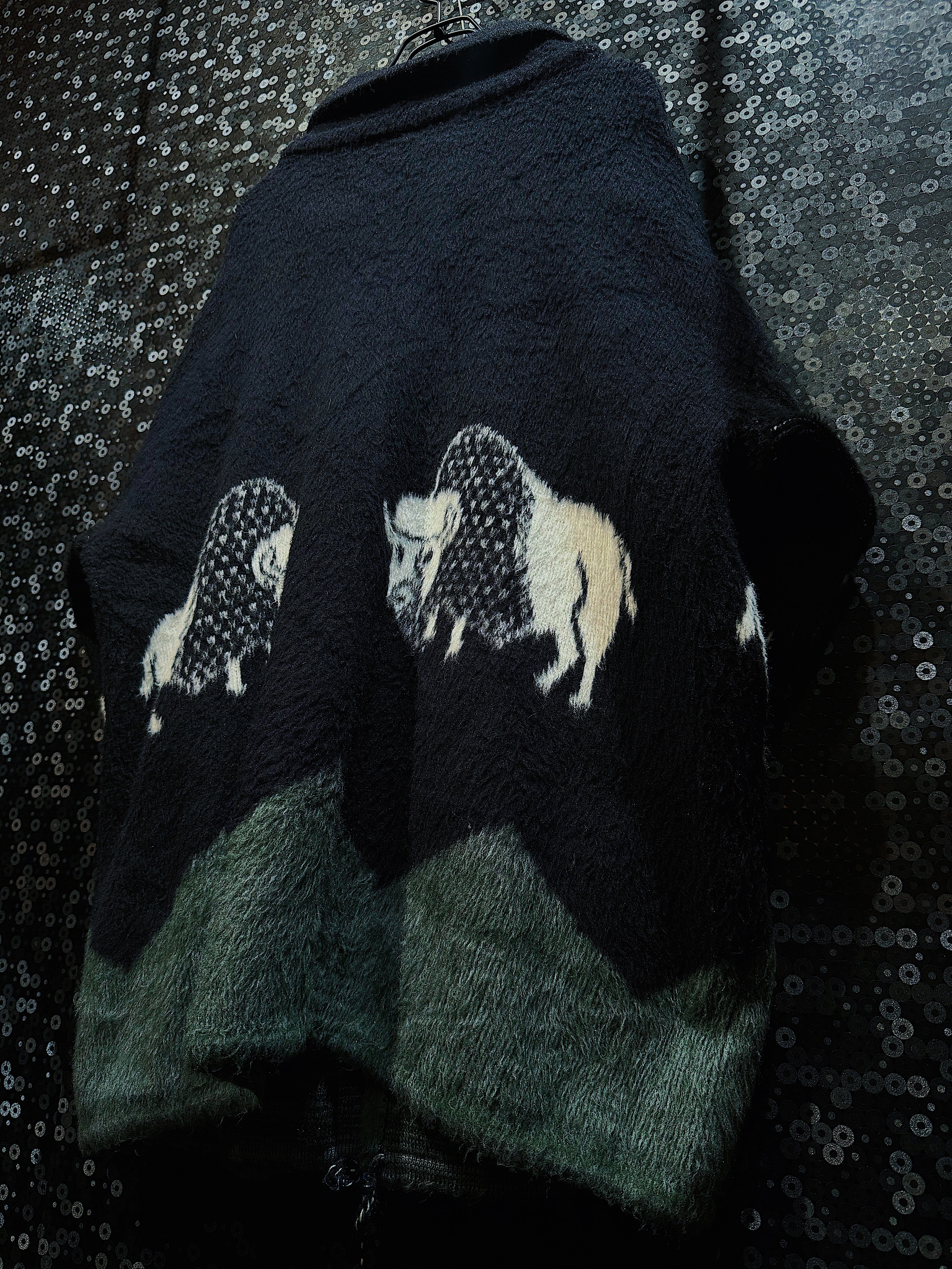 こちらはエクアドル製の「Inca Imports」によるヴィンテージバッファロー刺繍ニットジャケットです。このジャケットは、南米の伝統的なデザインとモチーフを取り入れつつ、現代的なスタイルにも馴染む一着となっています。