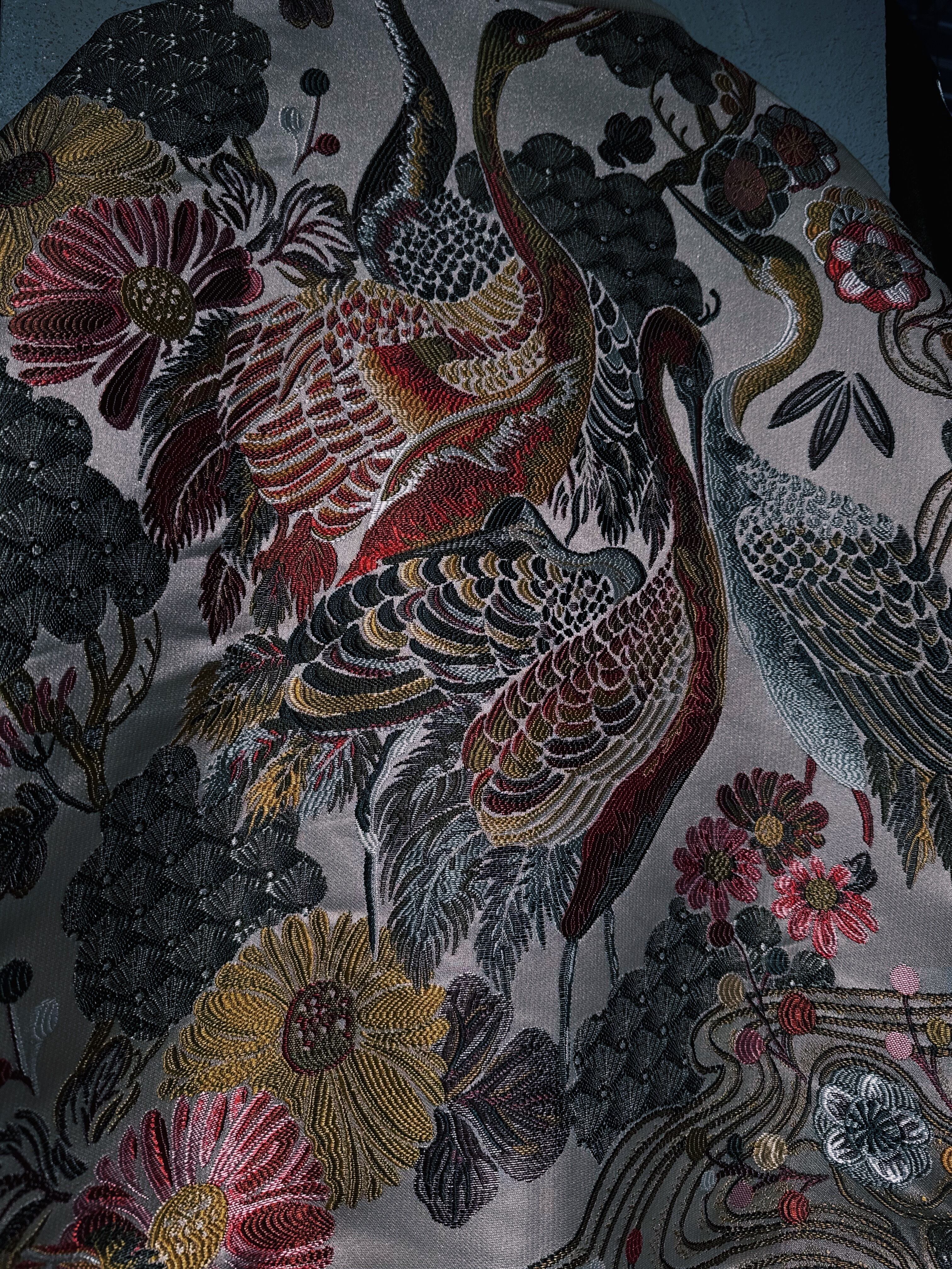 輝くシルバーのボディをベースに、煌々と光る和風な刺繍デザインが魅力的で美しい、1つのアートの様な逸品。