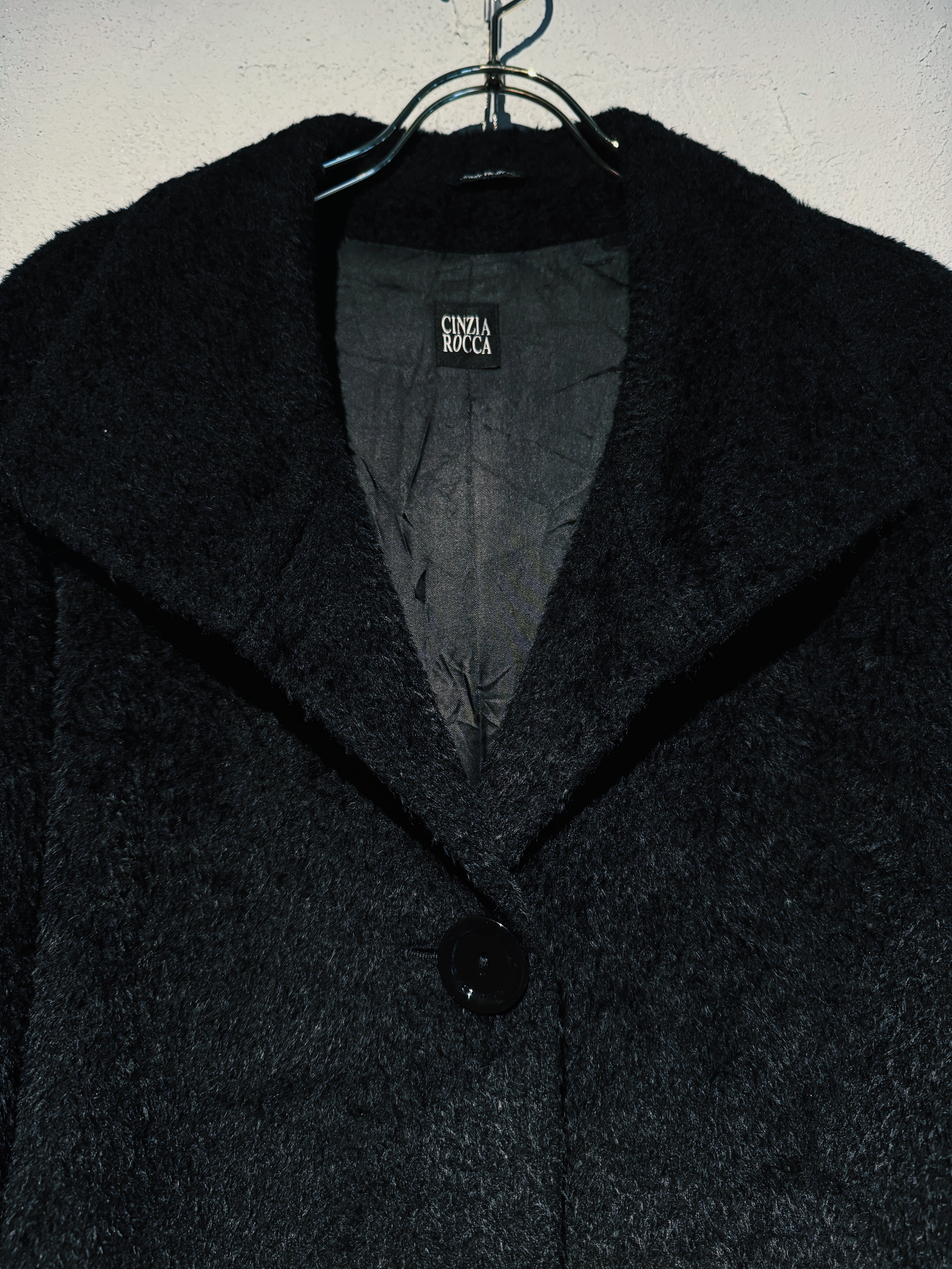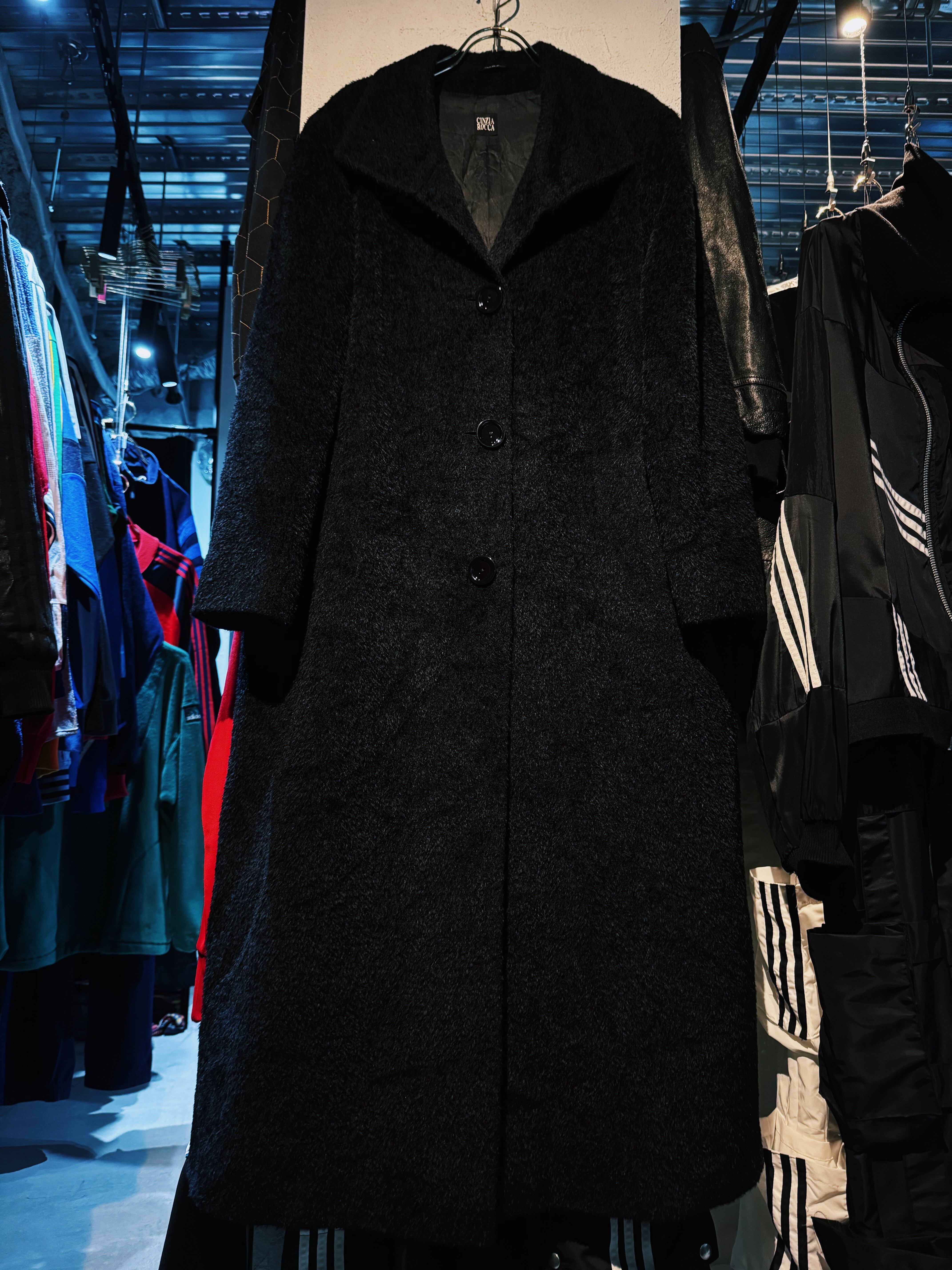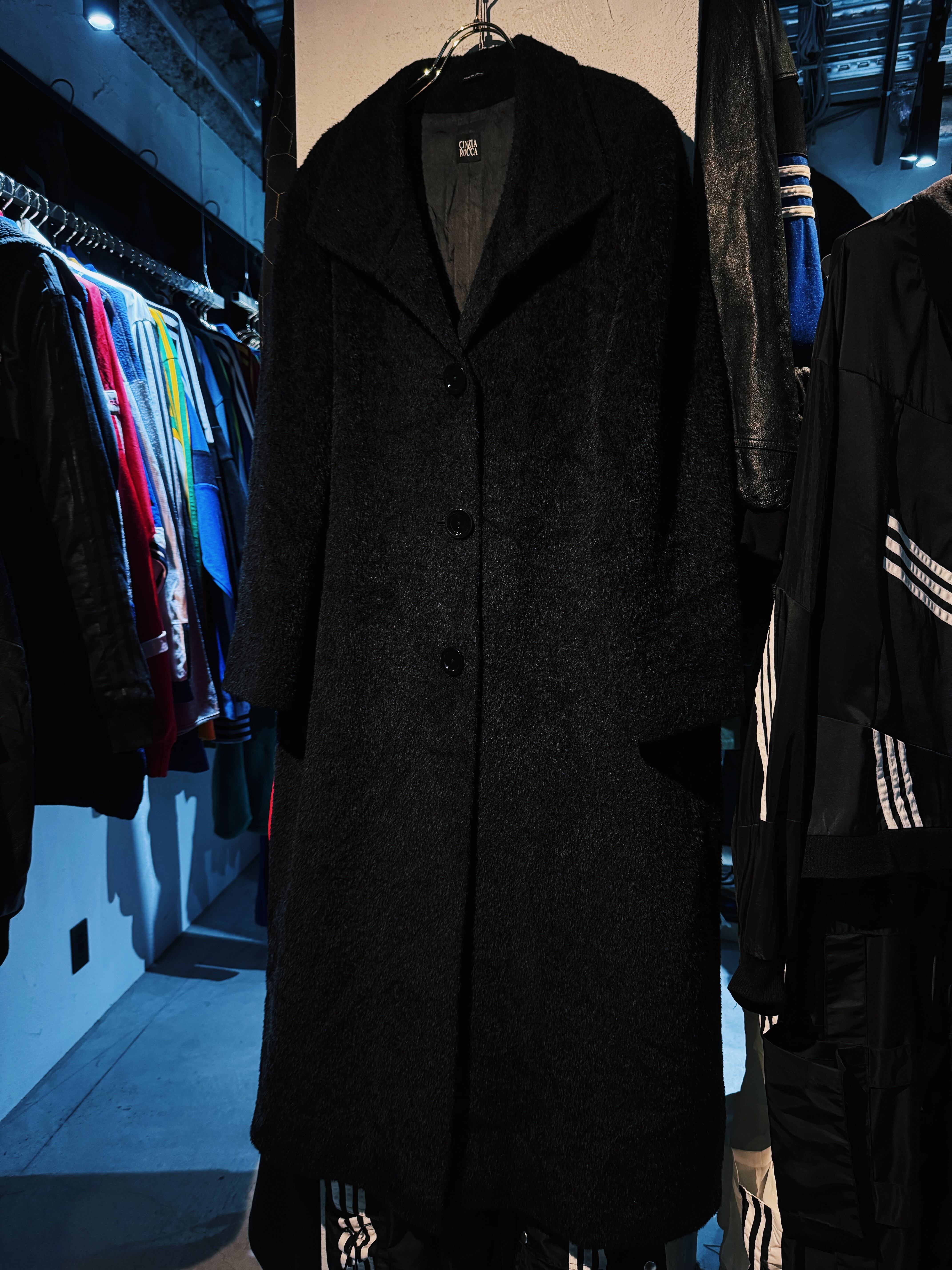 特殊な襟の形にロング丈、比翼仕立てとまるでハイブランドかのような高貴な存在感がありハイモードな仕上がりに。