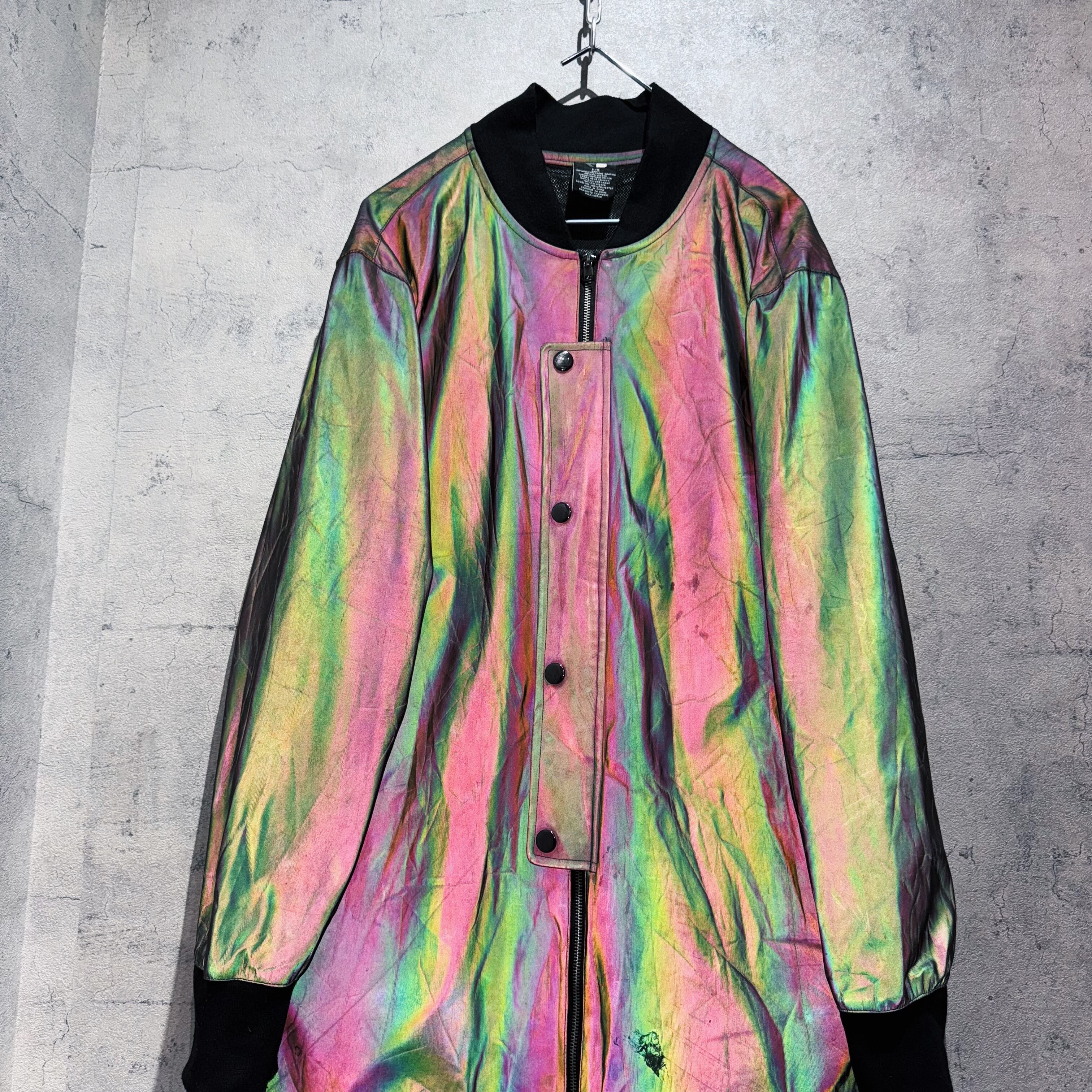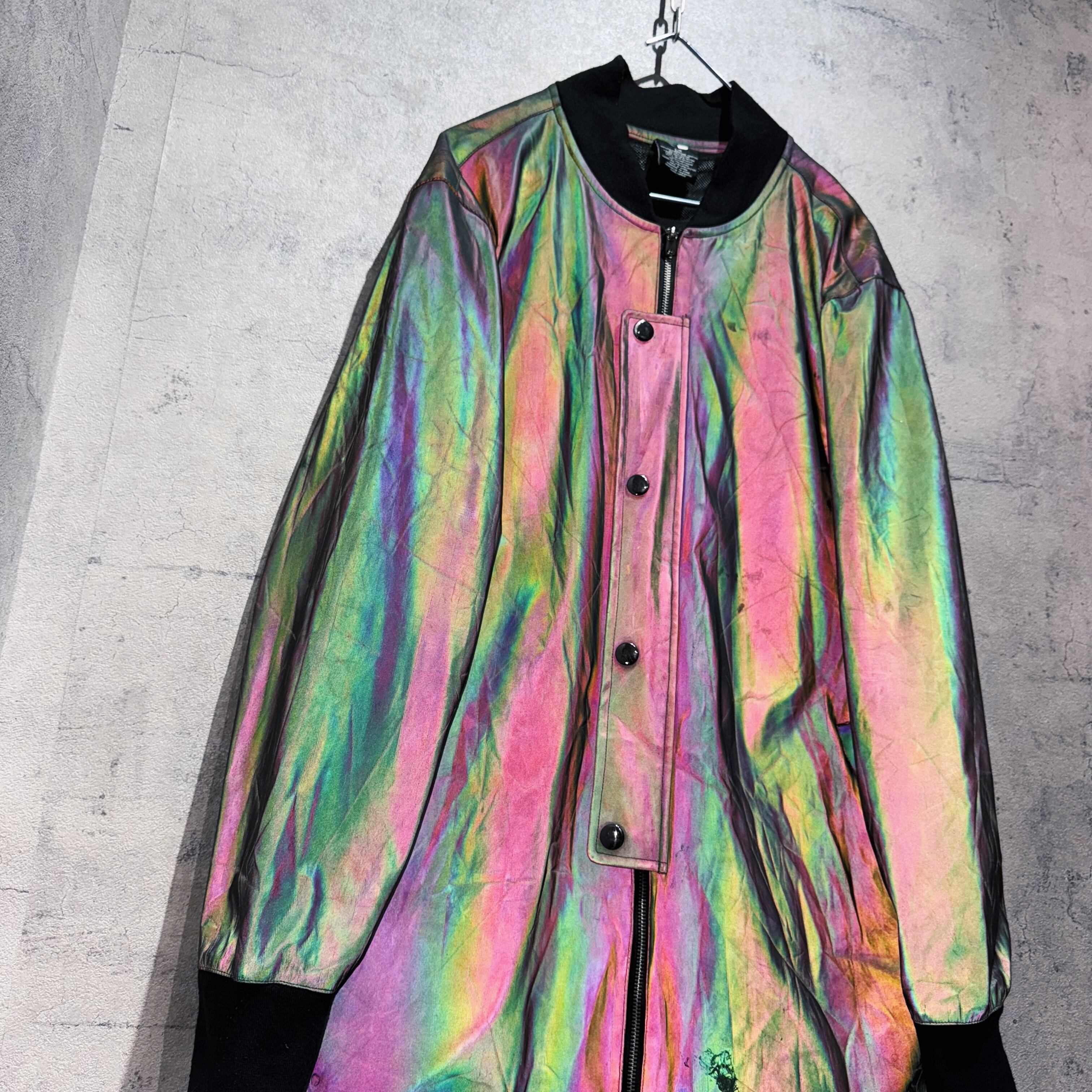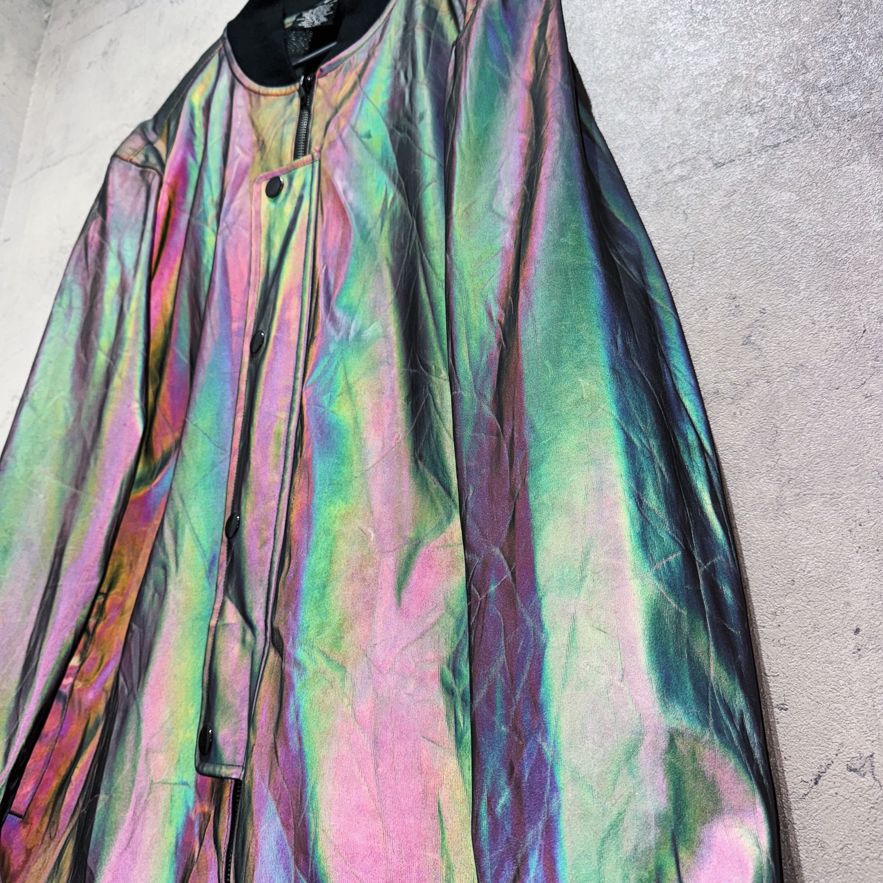 光の当たり方によって色合いが変化する煌びやかな玉蟲色を身に纏ったアバンギャルドなMA-1ジャケット。(写真はフラッシュにより強く発光しています)