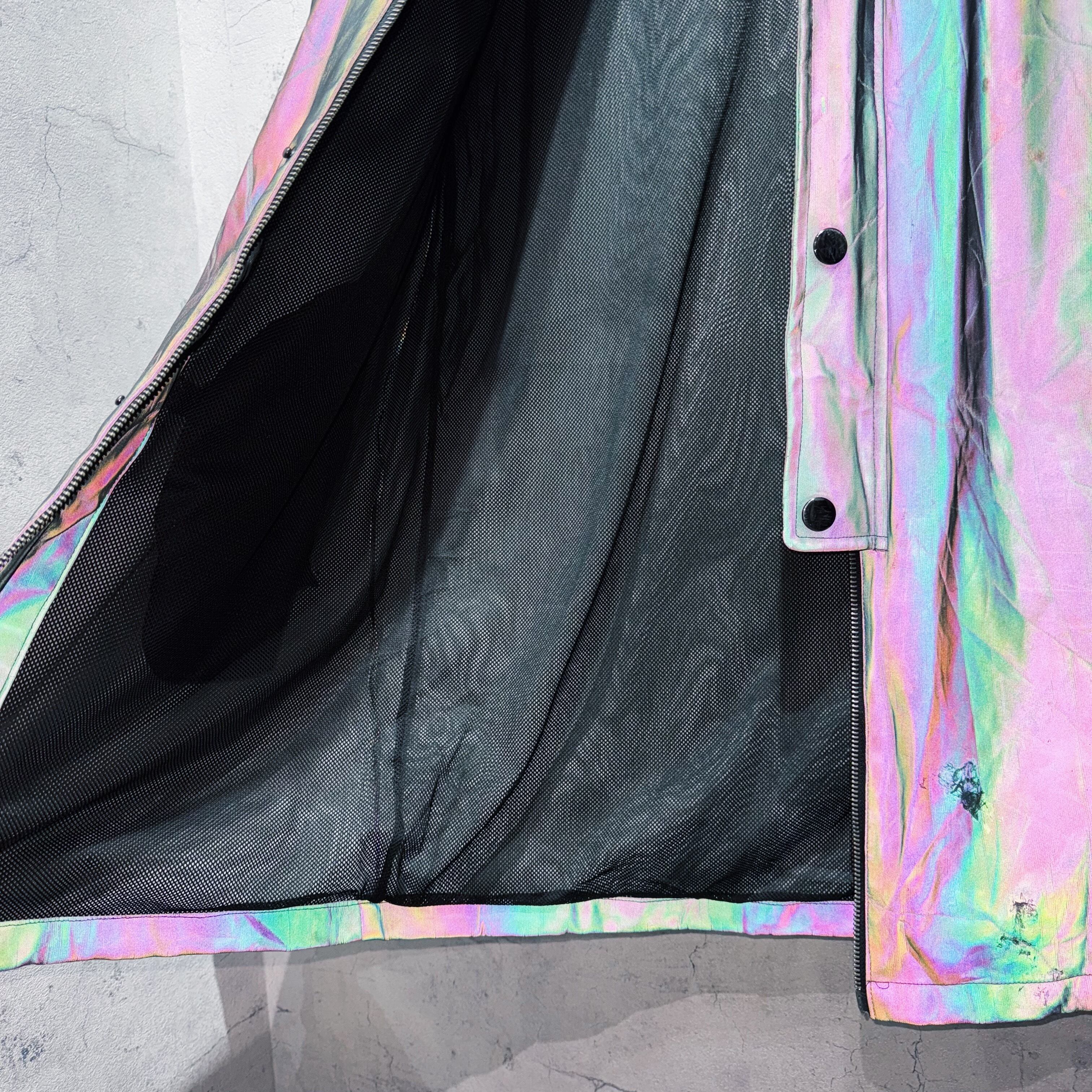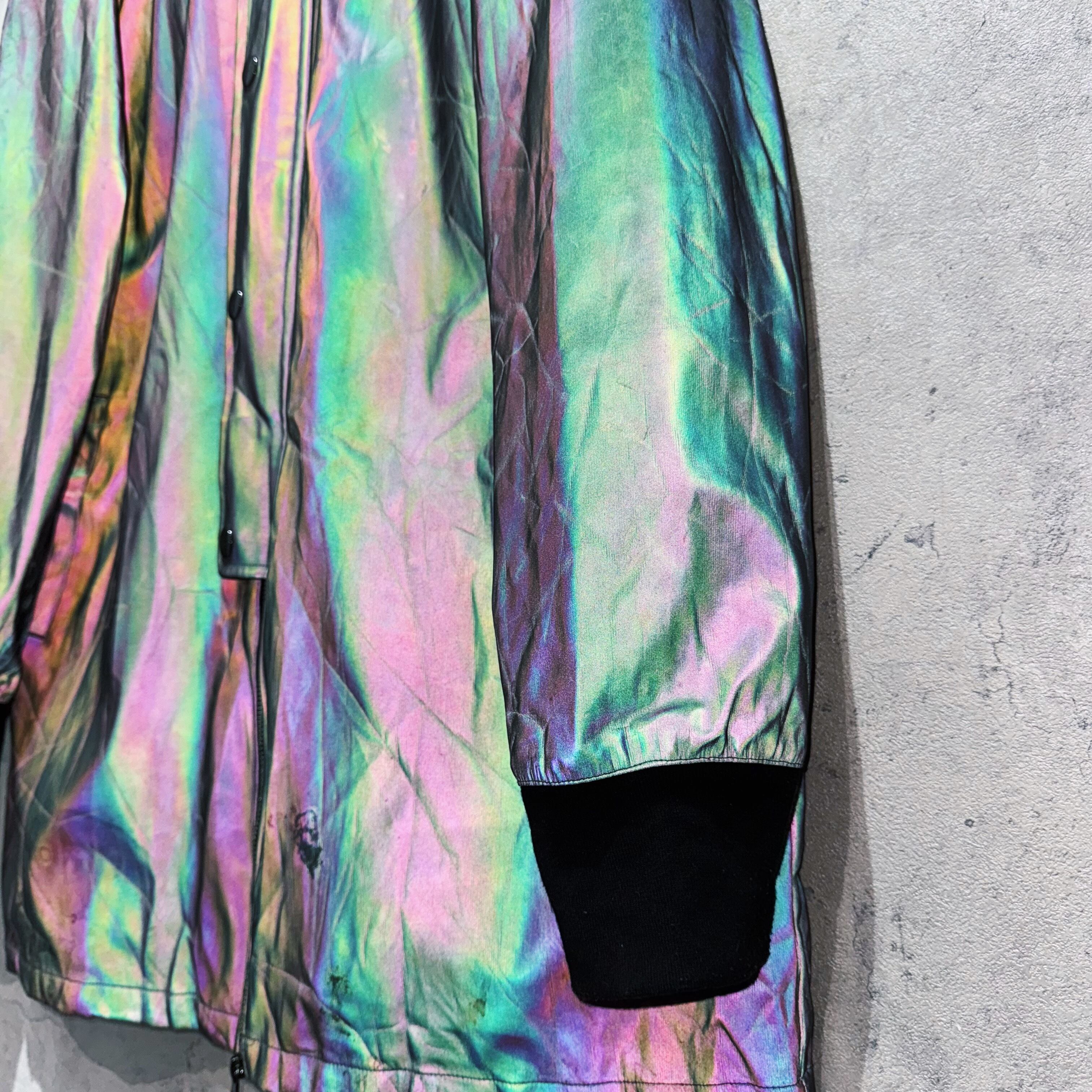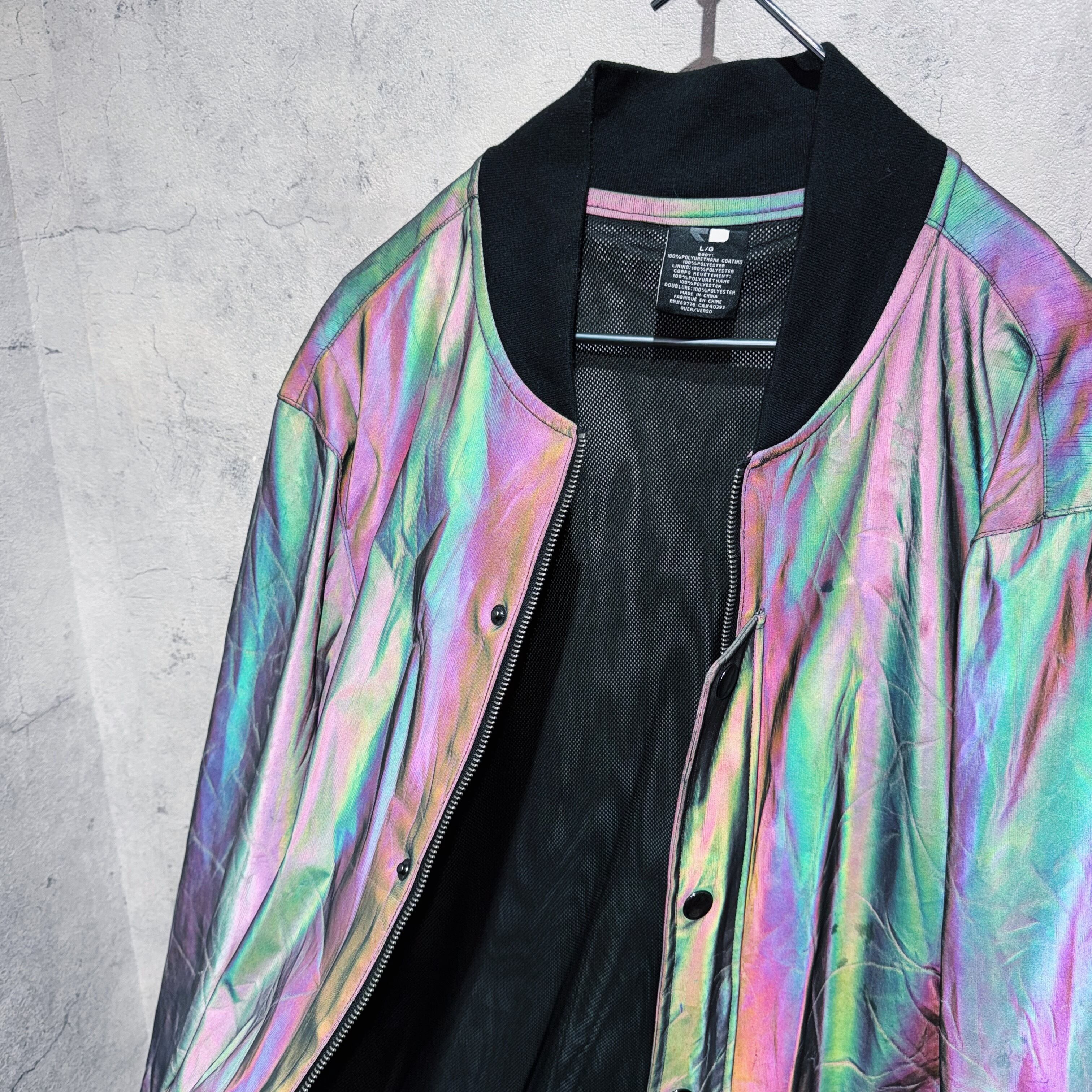 光の当たり方によって色合いが変化する煌びやかな玉蟲色を身に纏ったアバンギャルドなMA-1ジャケット。(写真はフラッシュにより強く発光しています)