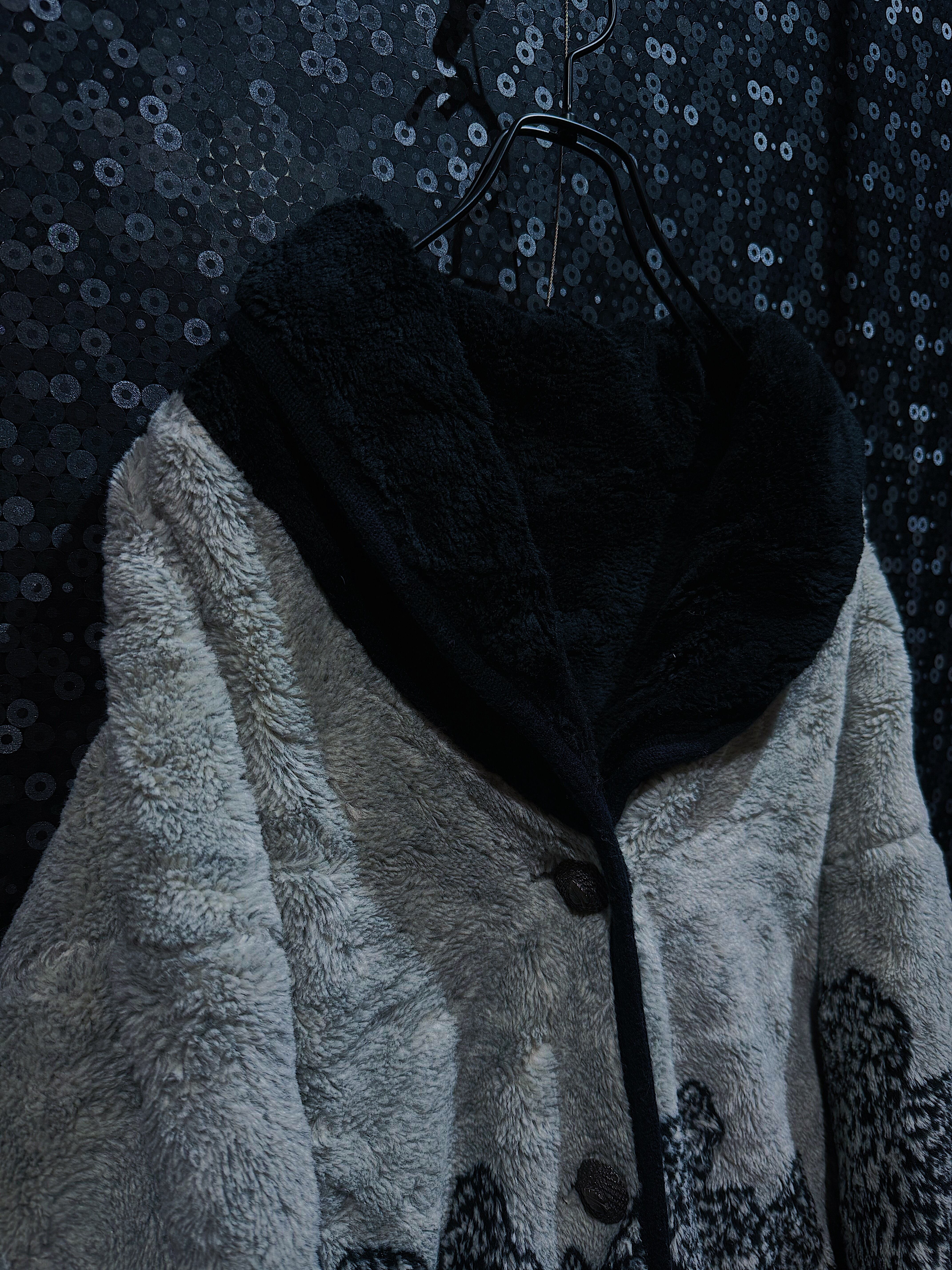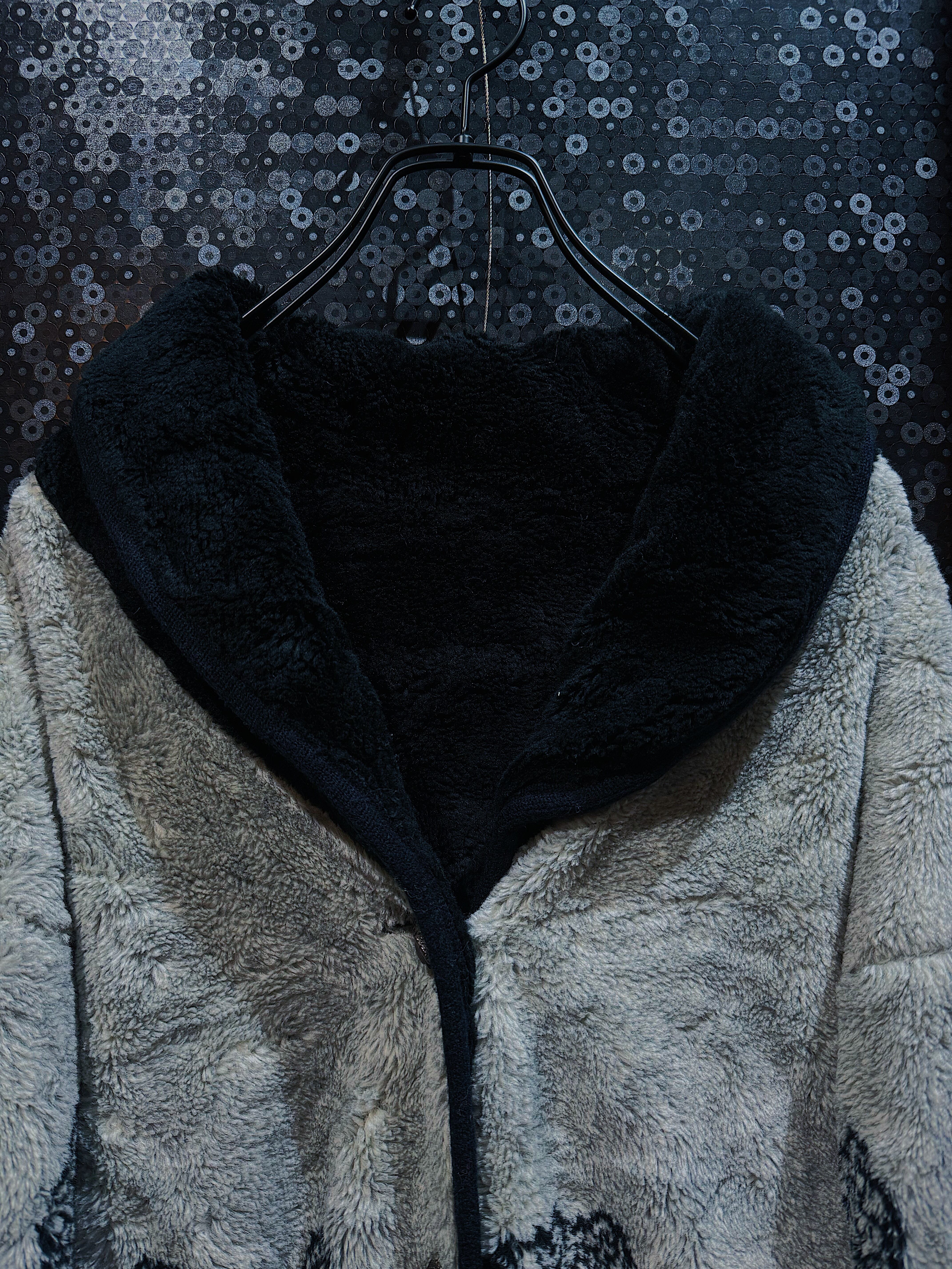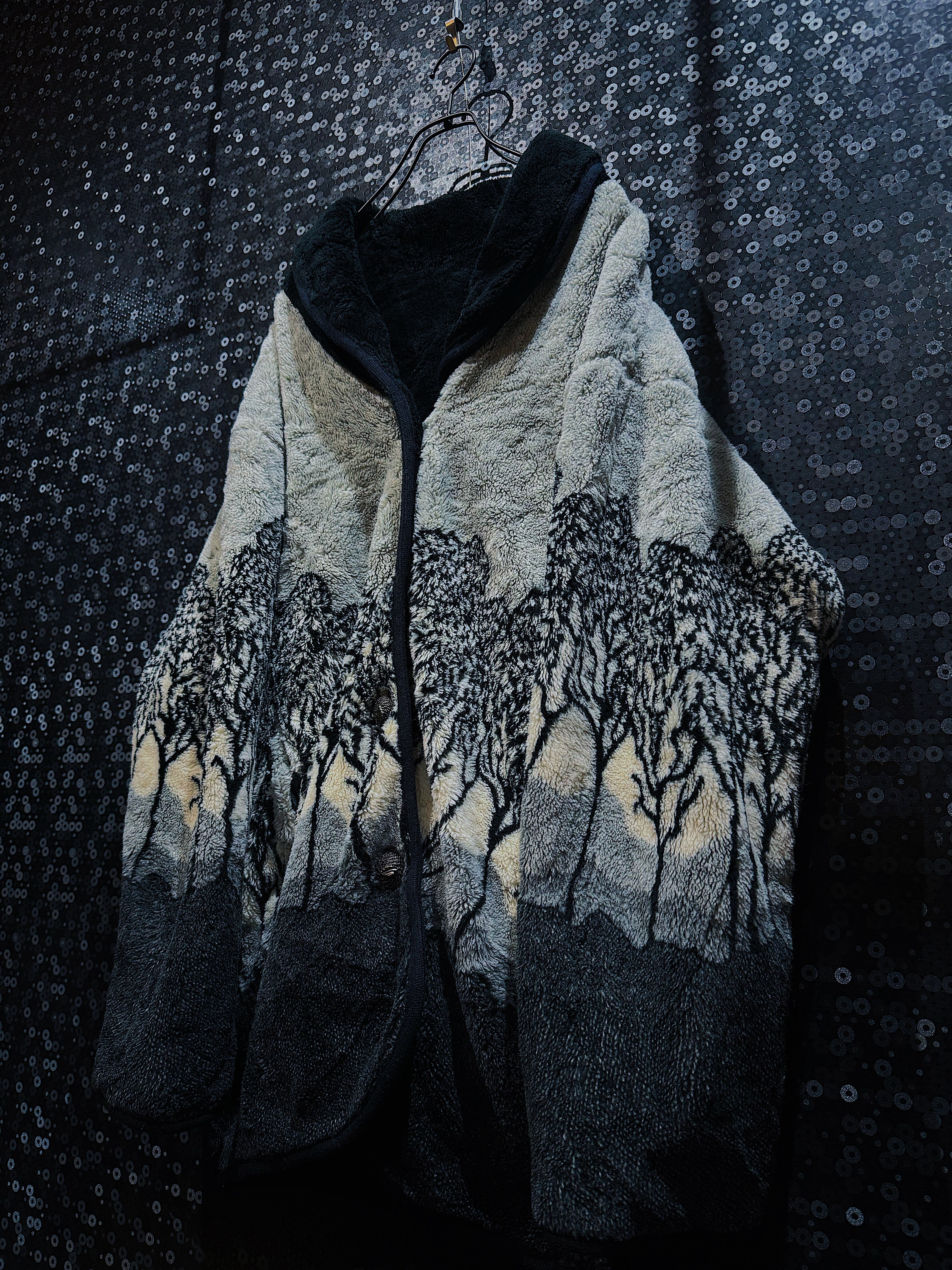 「ツリーデザイン」が特徴のヴィンテージリバーシブルファージャケットです。全体に描かれた木々のモチーフが目を引く、アート性の高い一着です。