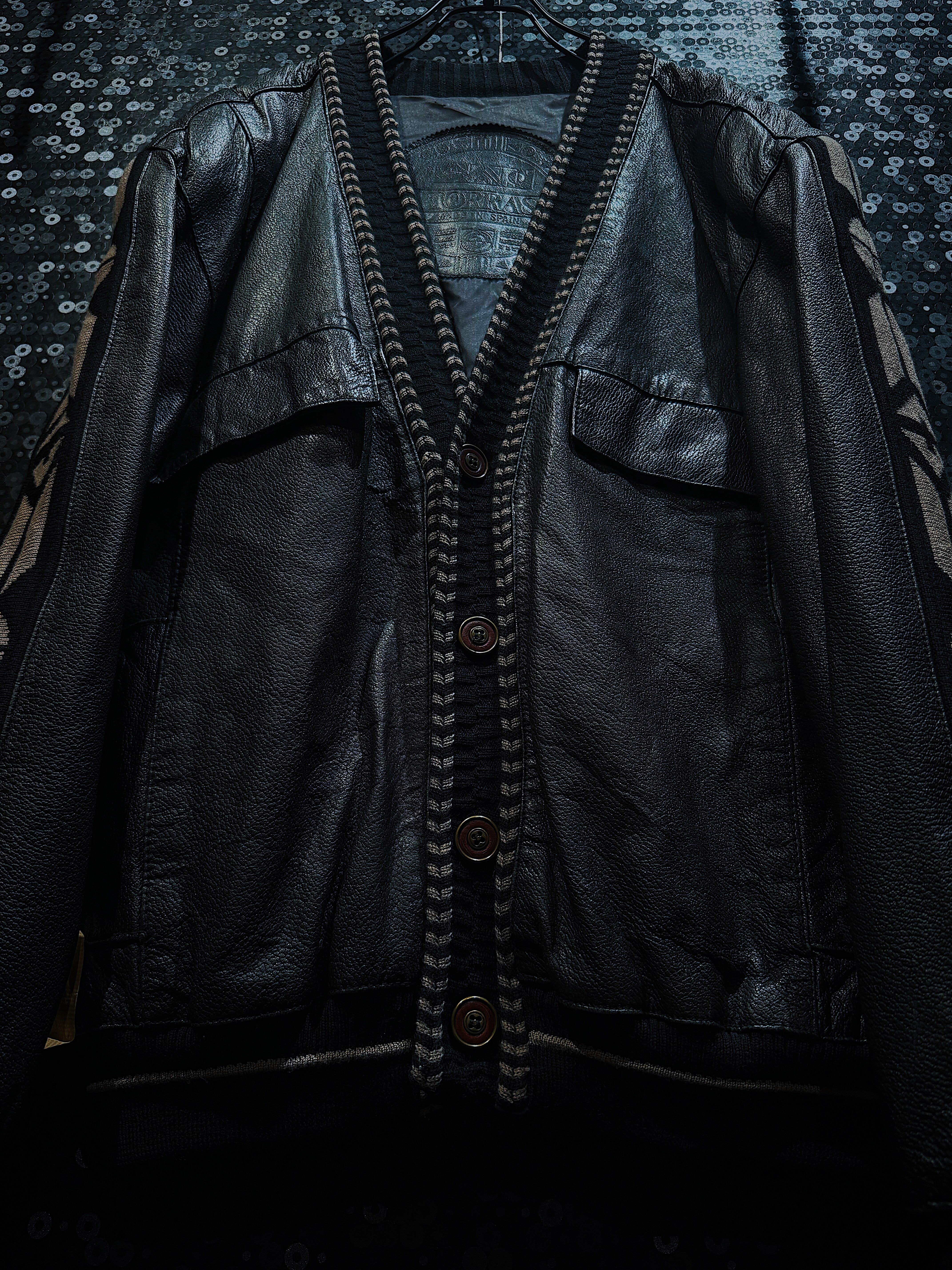 こちらは、レザーとニットを組み合わせたカーディガンジャケットスタイルのアイテムです。主体は上質なレザーで構成され、袖や襟、縁部分にニット素材を使用したデザインが特徴です。
