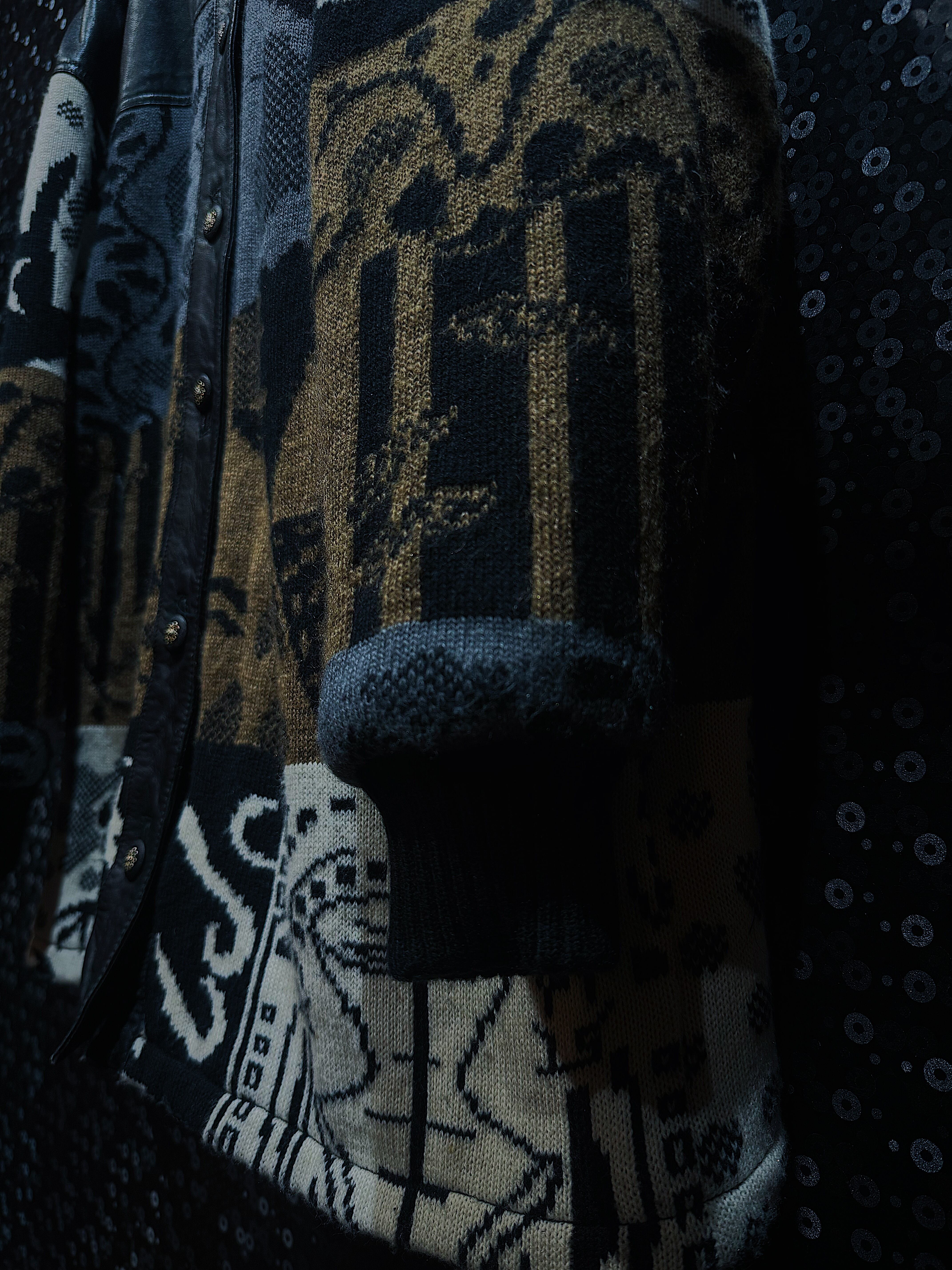 こちらのアイテムは、ニットとレザーを組み合わせたデザインが特徴のヴィンテージジャケットです。ブラックとグレーを基調としつつ、ブラウンやホワイトを取り入れた複雑なパターンが全体に施され、視覚的なインパクトがあります。