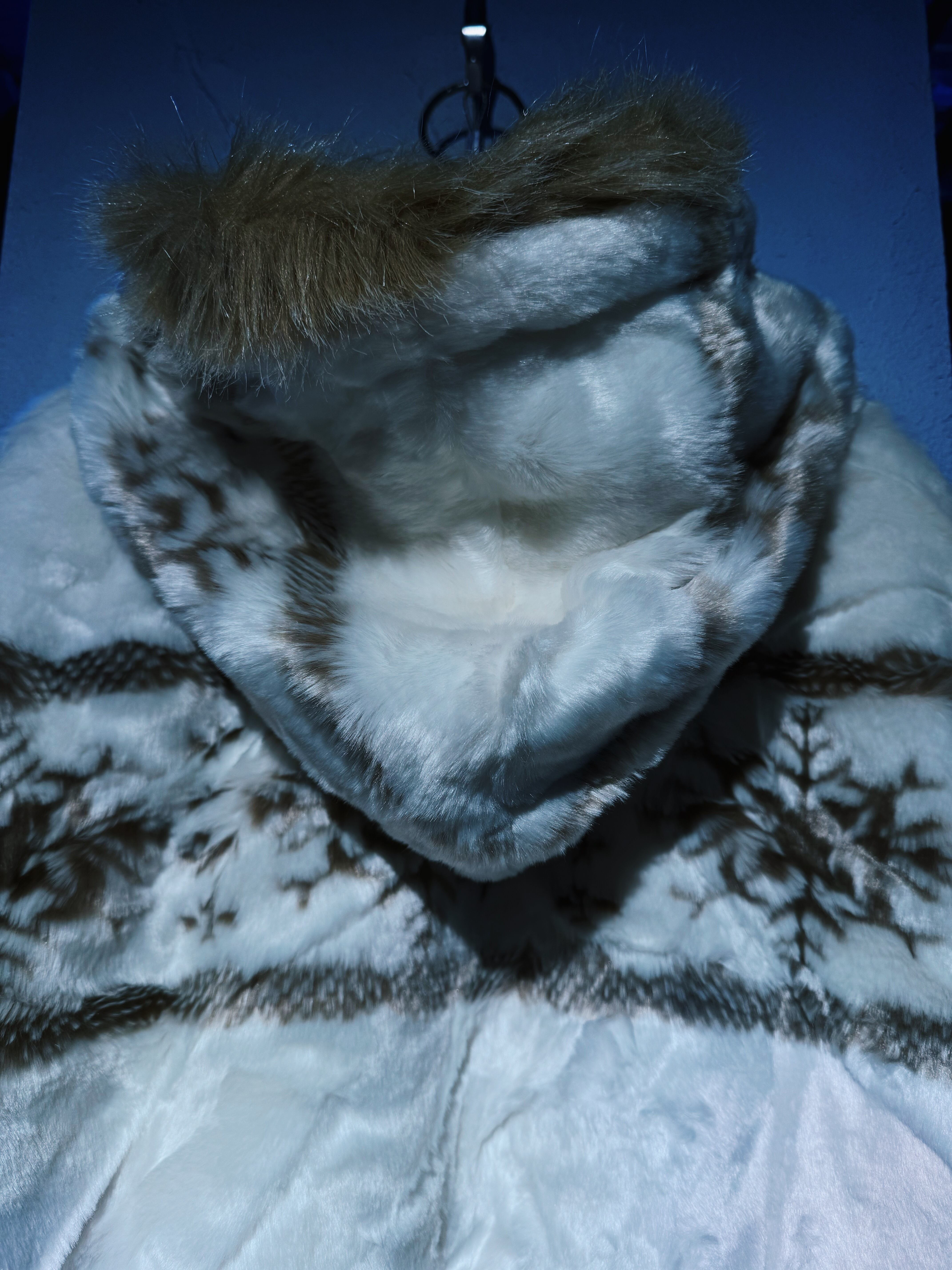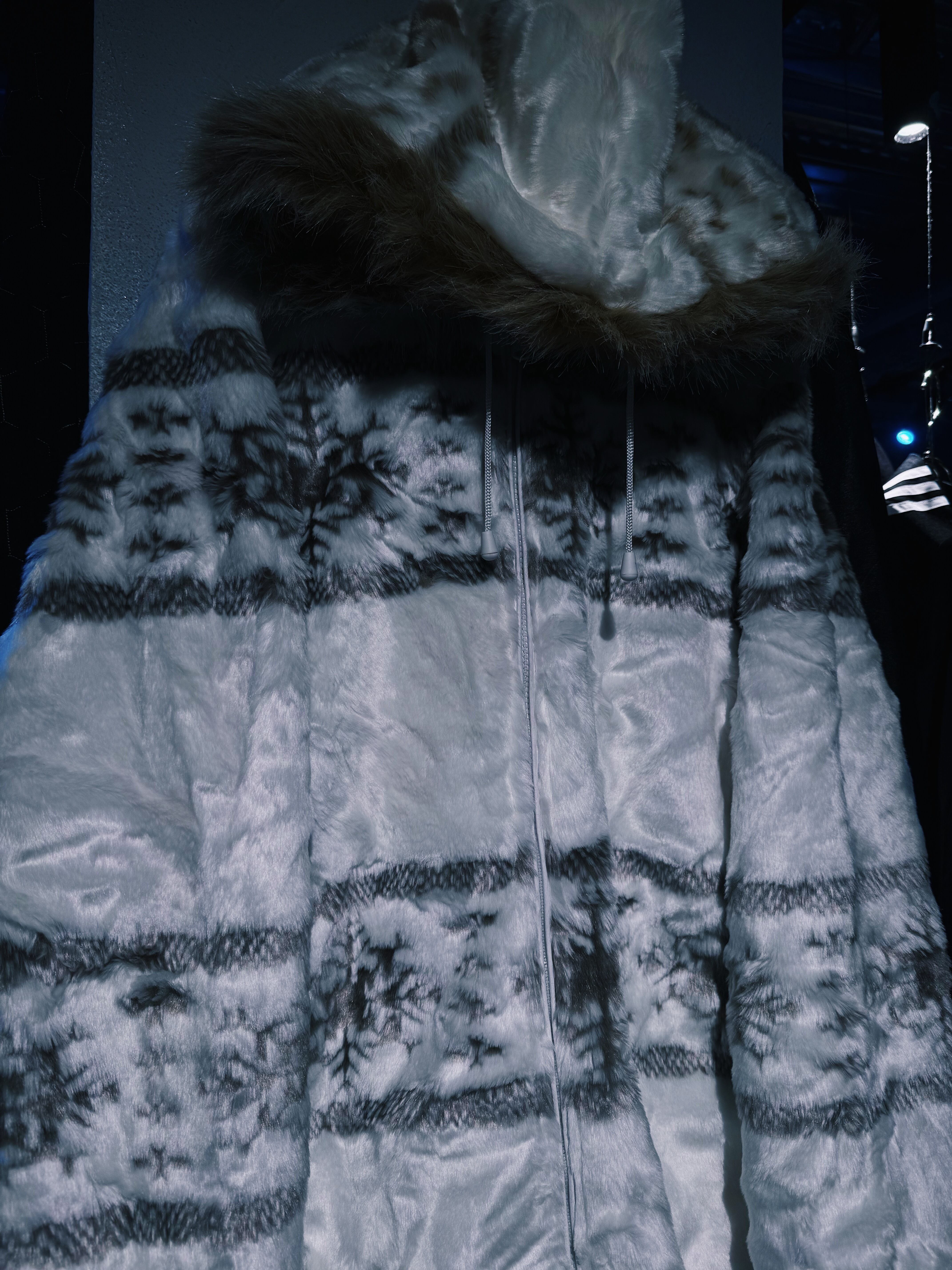 Special vintage white color full Fur pattern snowflakes design reversible hoodie jacket