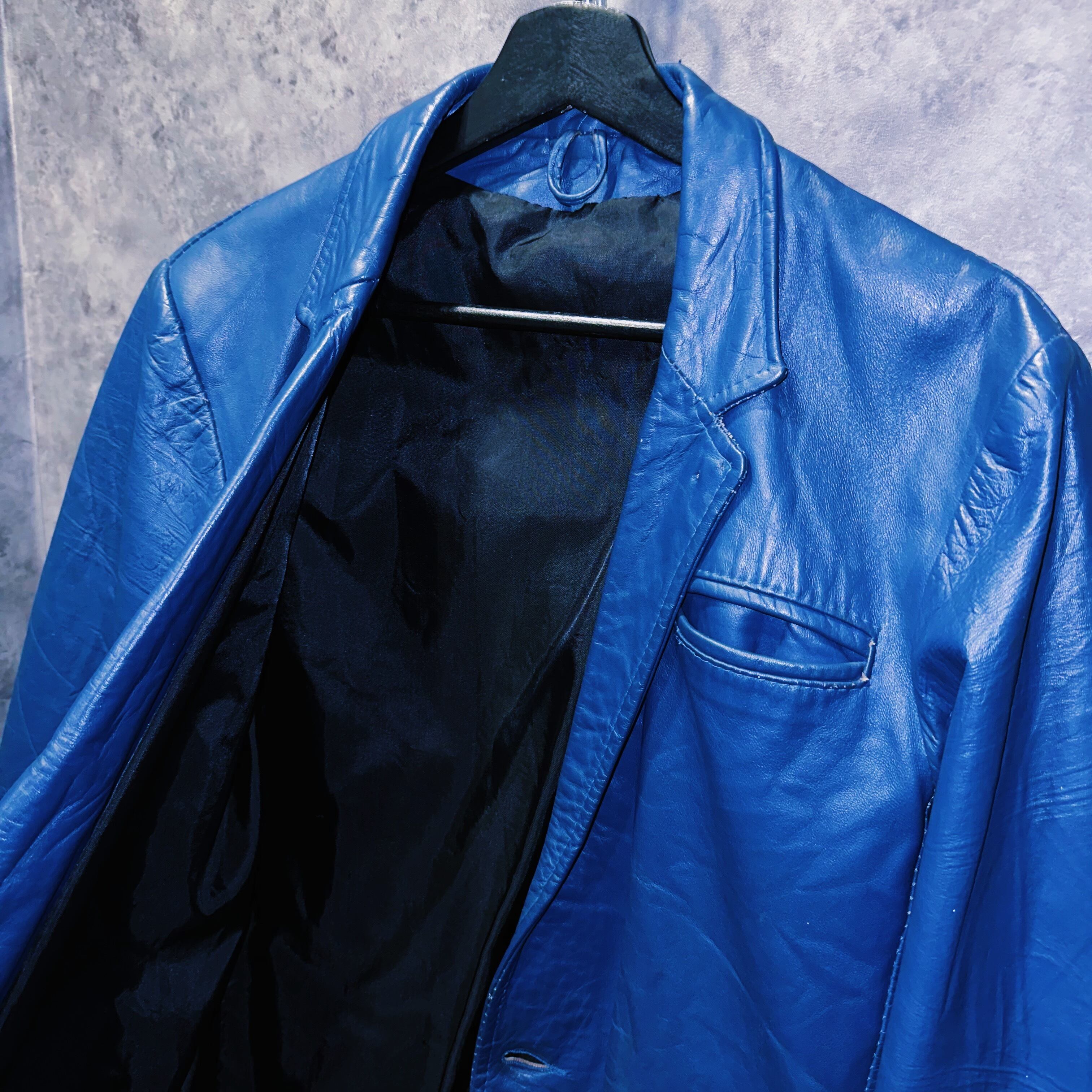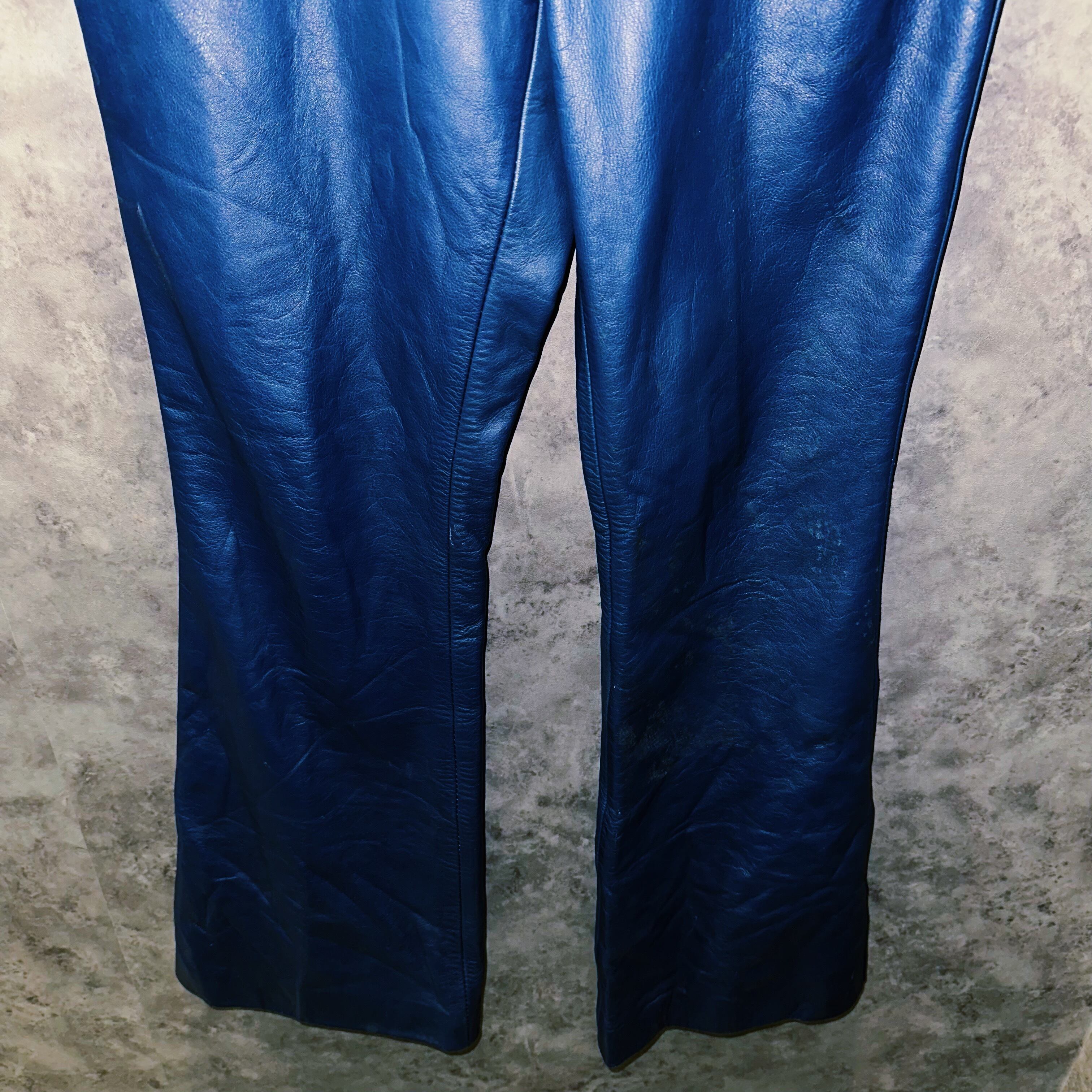 圧倒的な存在感を放つ色鮮やかなブルーレザー。さらにはパンツはフレアタイプでしかもベルシルエットで最高のシルエットで、70'sらしいタイトで外に広がった圧巻のレザーパンツ。