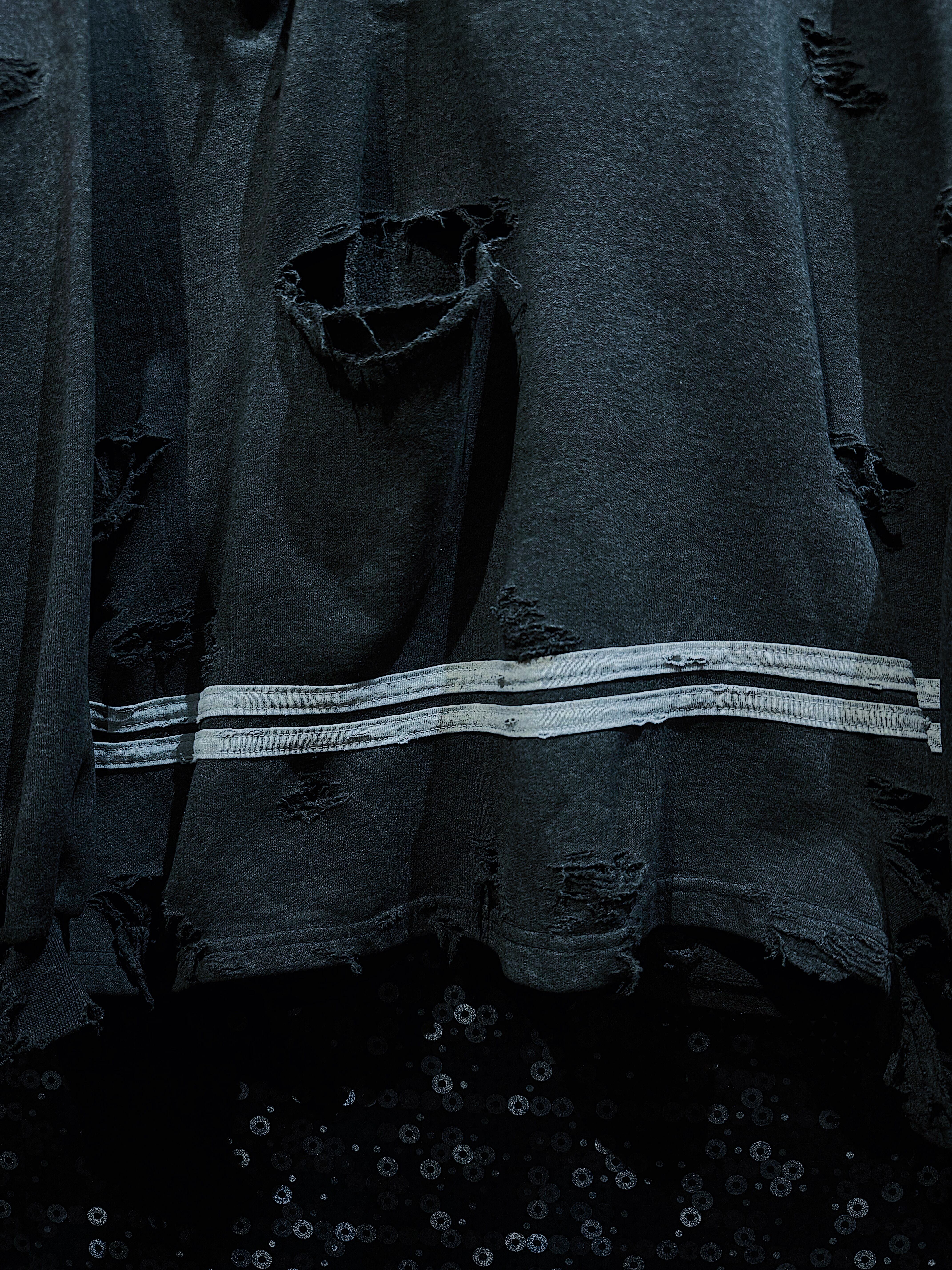 ダメージ加工が施されており、近年人気の高いボロスタイルに仕上げられています。この時代感のあるロゴとストライプが組み合わさることで、シンプルながらも個性的な雰囲気を演出。