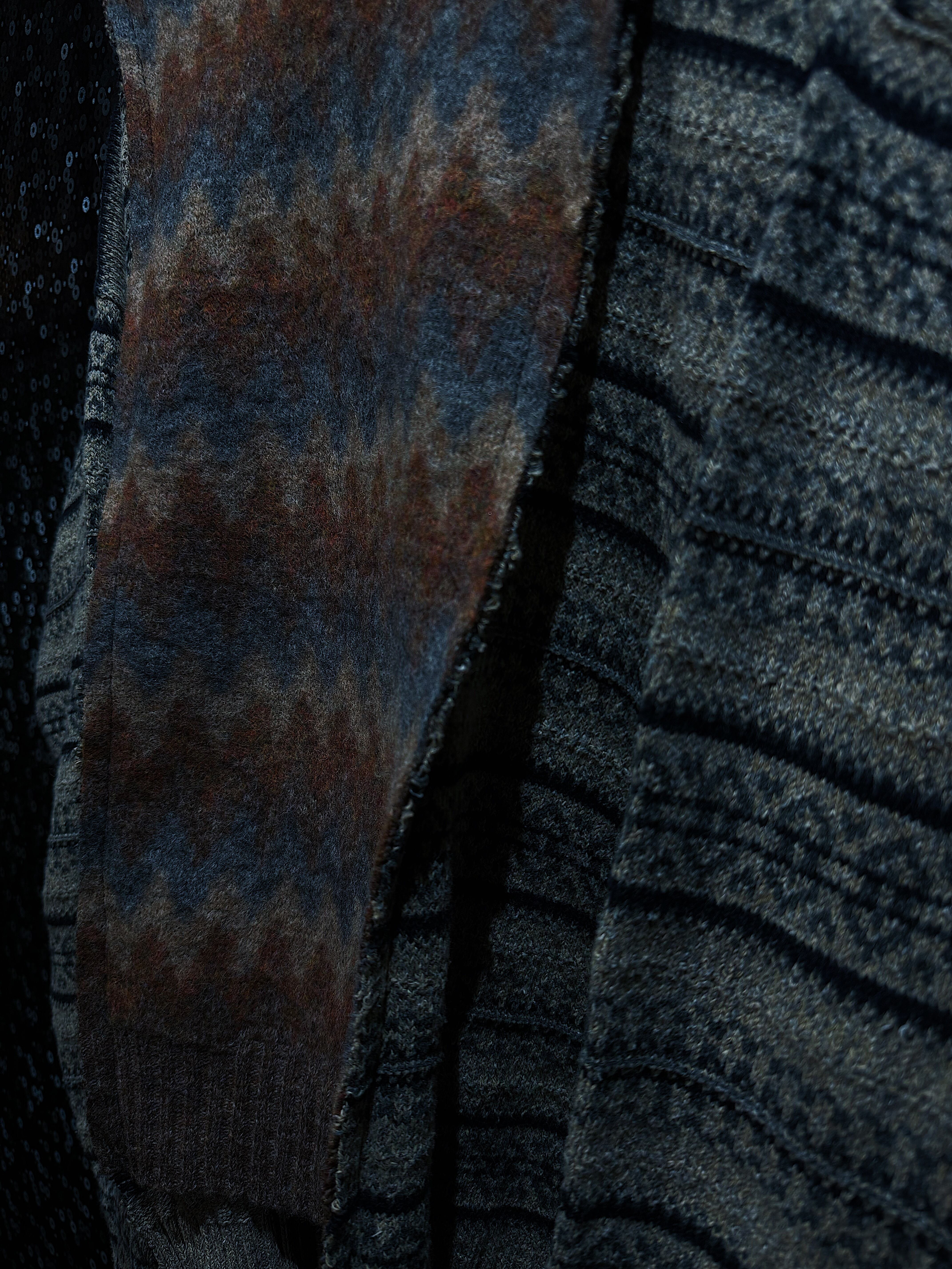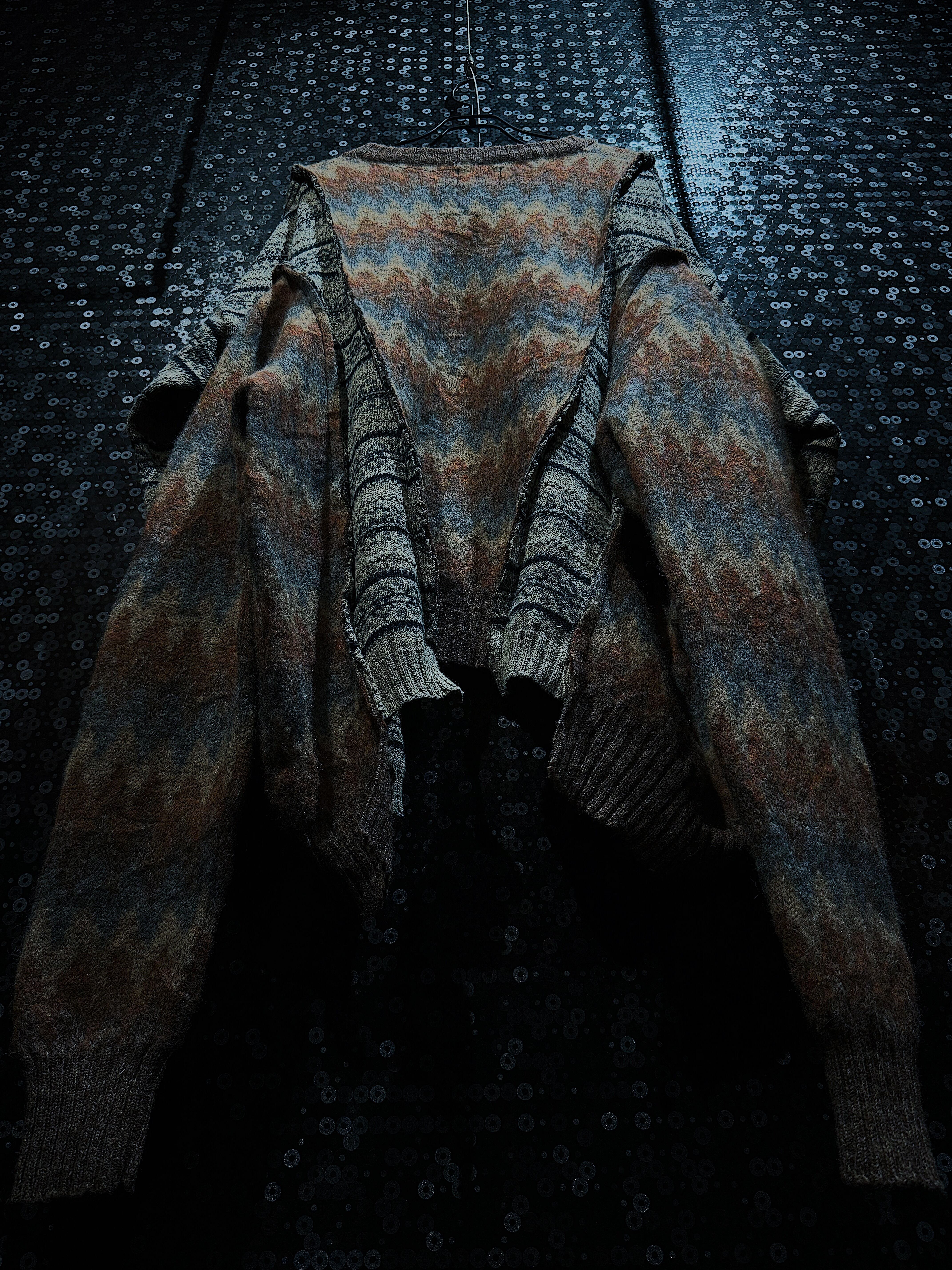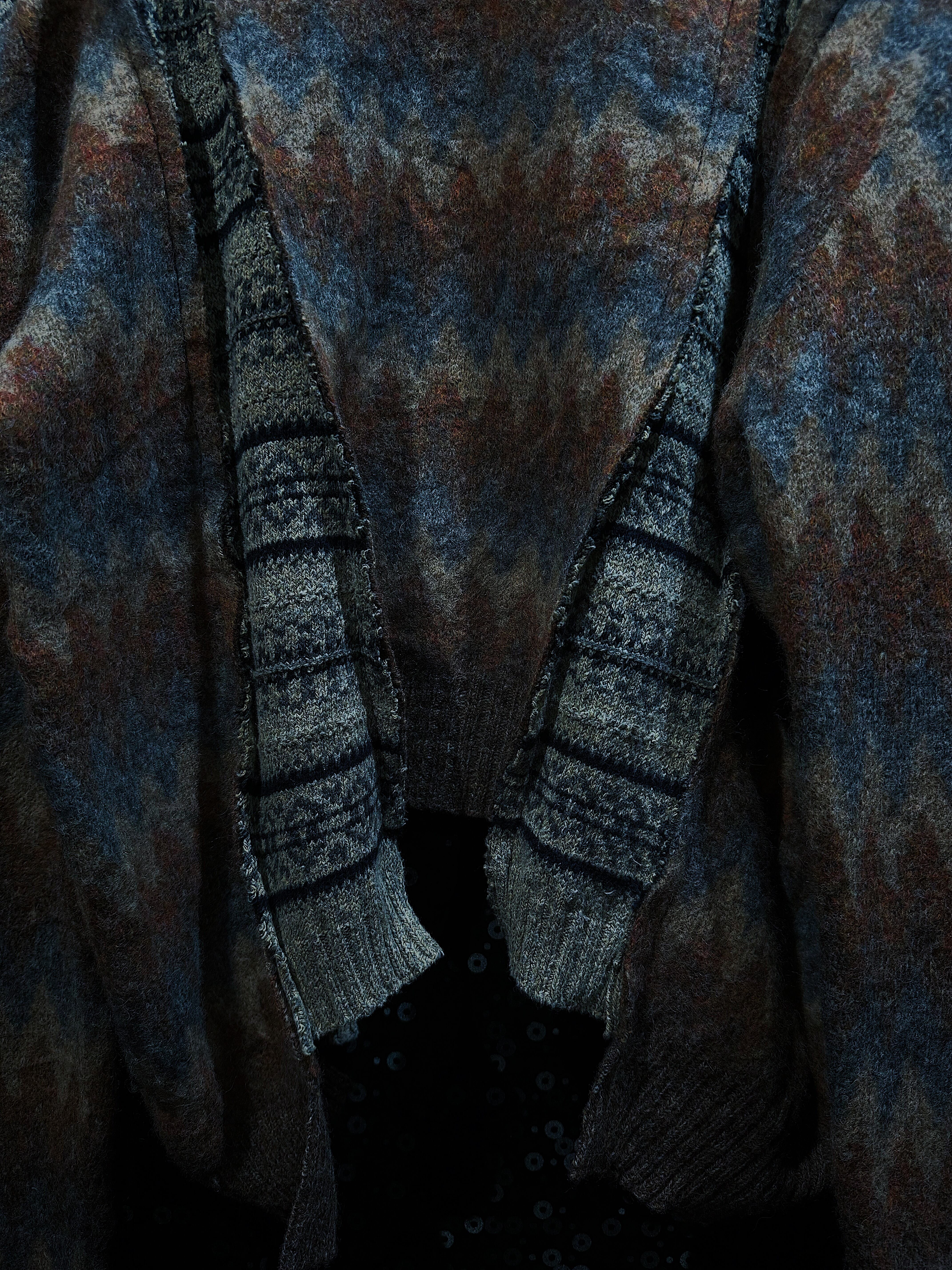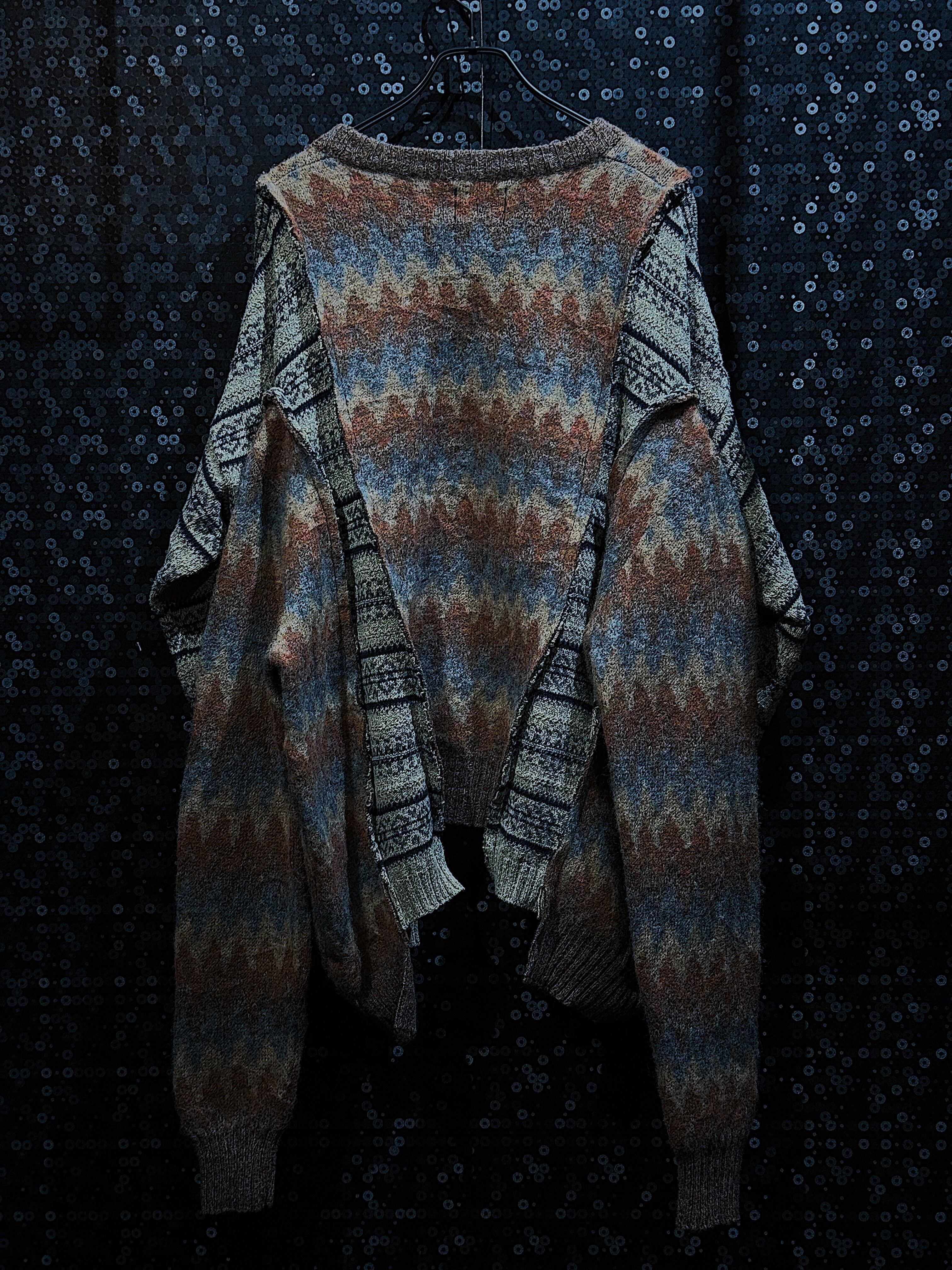 こちらの「再倖築 Vintage Four Arm Double Docking Knit」は、ヴィンテージニットを再構築した唯一無二のデザインが魅力の一着です。伝統的なノルディック柄とジグザグパターンの異なるニットを組み合わせることで、新しい表情を生み出しています。