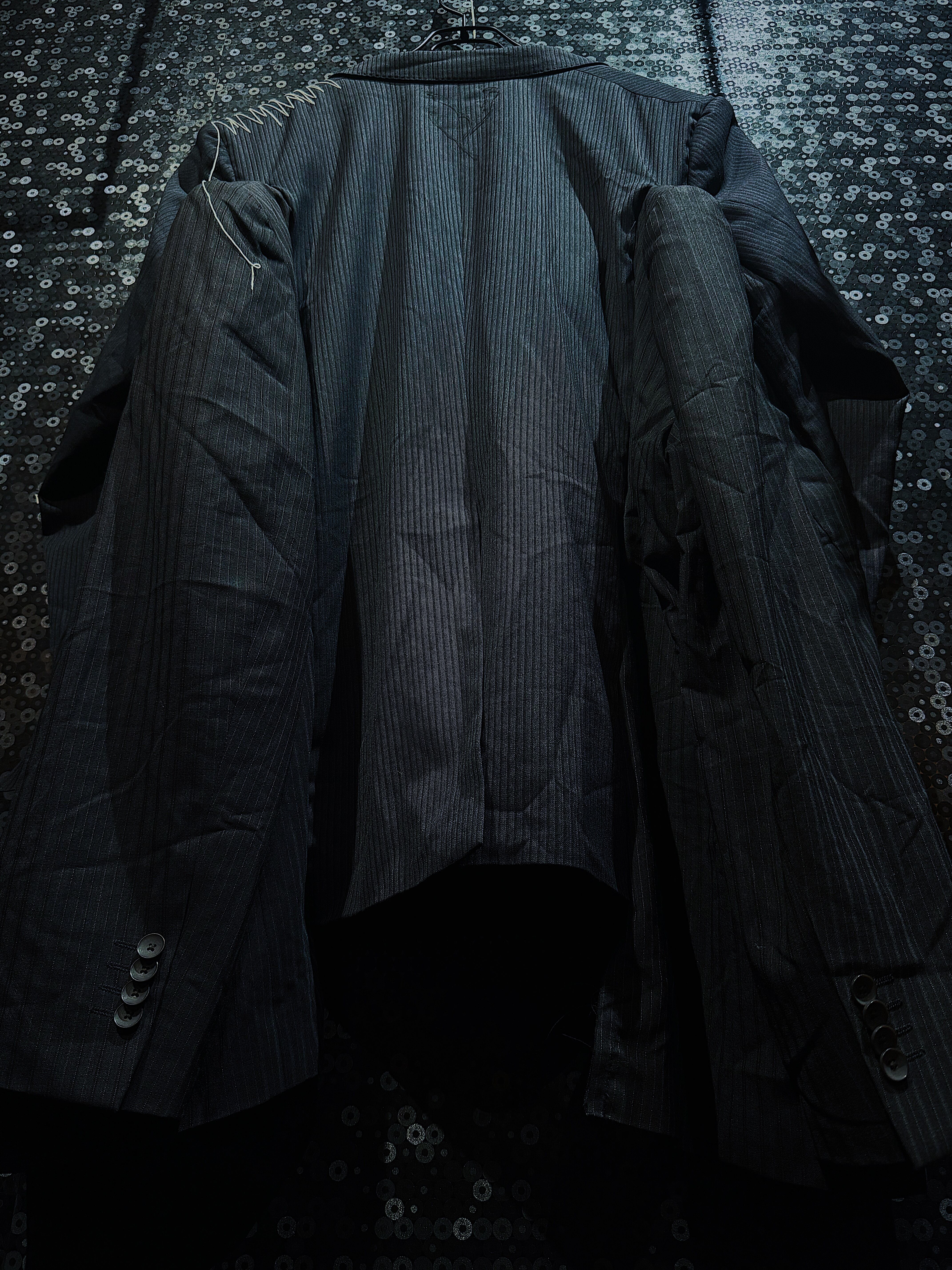 ジャケットの随所に施された大胆なステッチや装飾的なリボンがアクセントになっており、フォーマルな印象のストライプ柄と絶妙なコントラストを生み出しています。特にフロントにあしらわれたリボンが可愛らしさを加え、エッジの効いたデザインの中にも柔らかさを演出。左右非対称のディテールが、まるで別のジャケットを融合させたような再構築デザインの魅力を際立たせています。