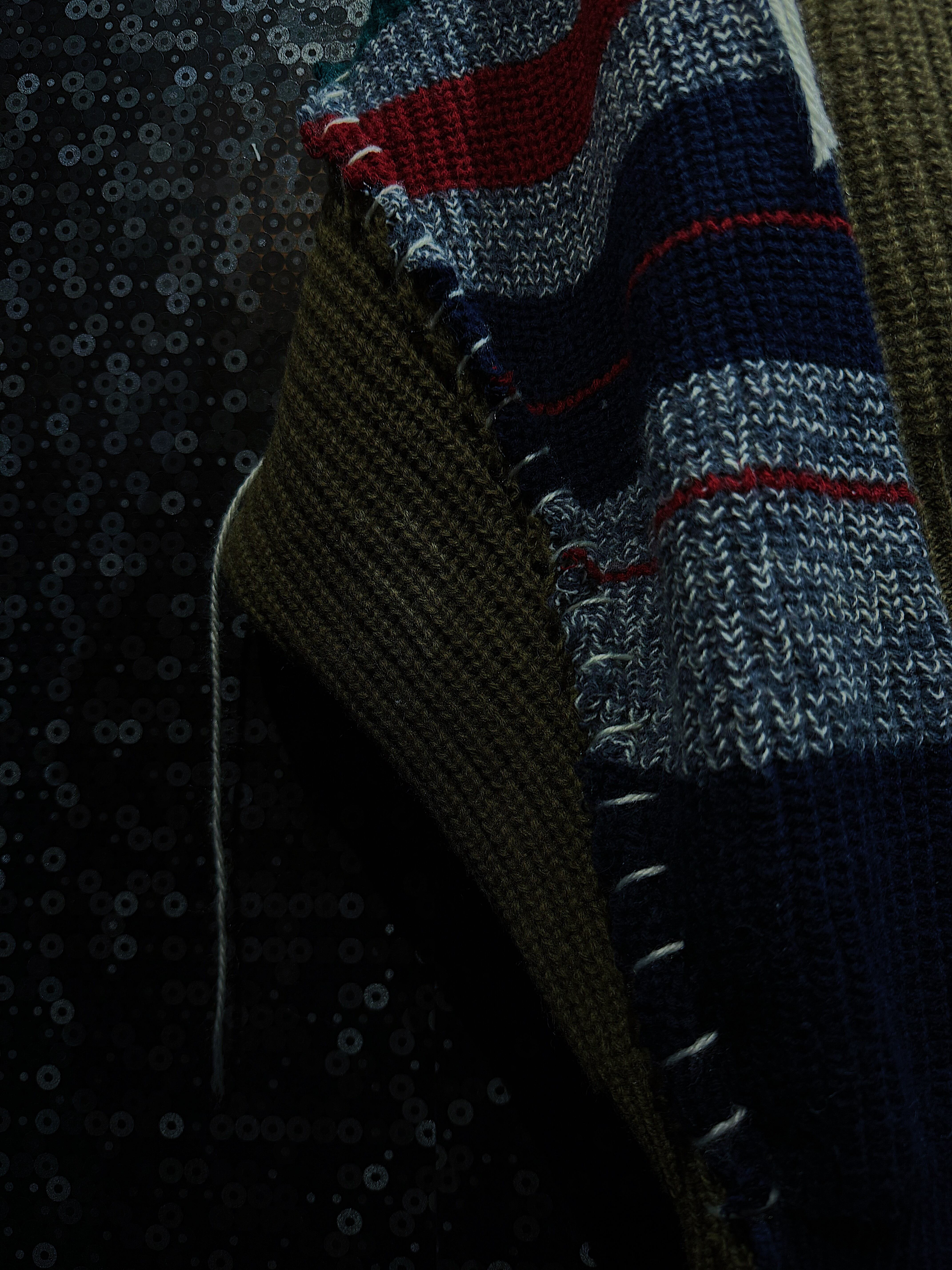 「再倖築」とは、既存のアイテムを再構築して新たな価値を生み出す手法で、サステナブルなファッションの一環として注目されています。このニットも複数の色や素材を組み合わせて大胆なデザインに仕上げられており、唯一無二の存在感を放つ一着です。