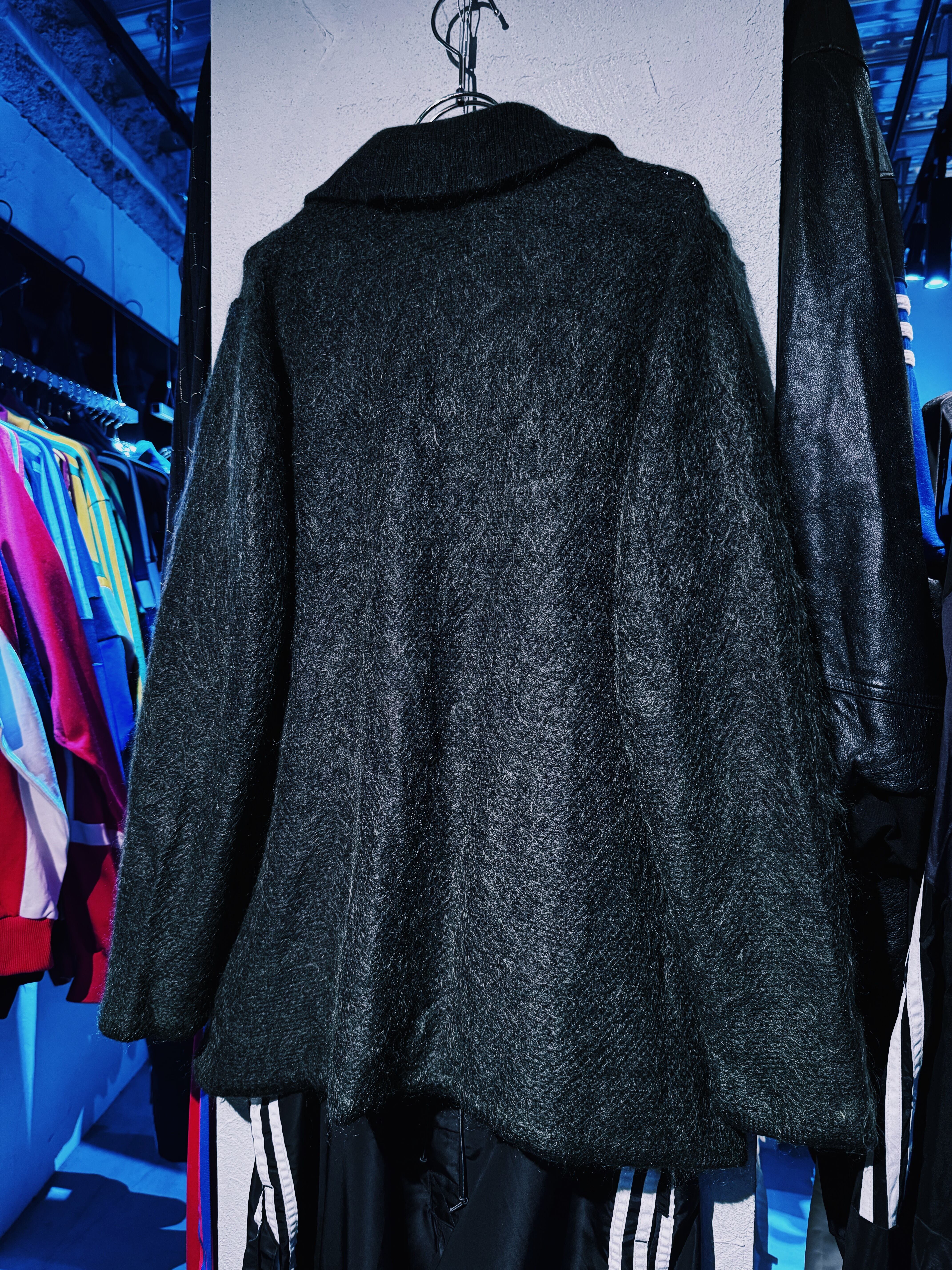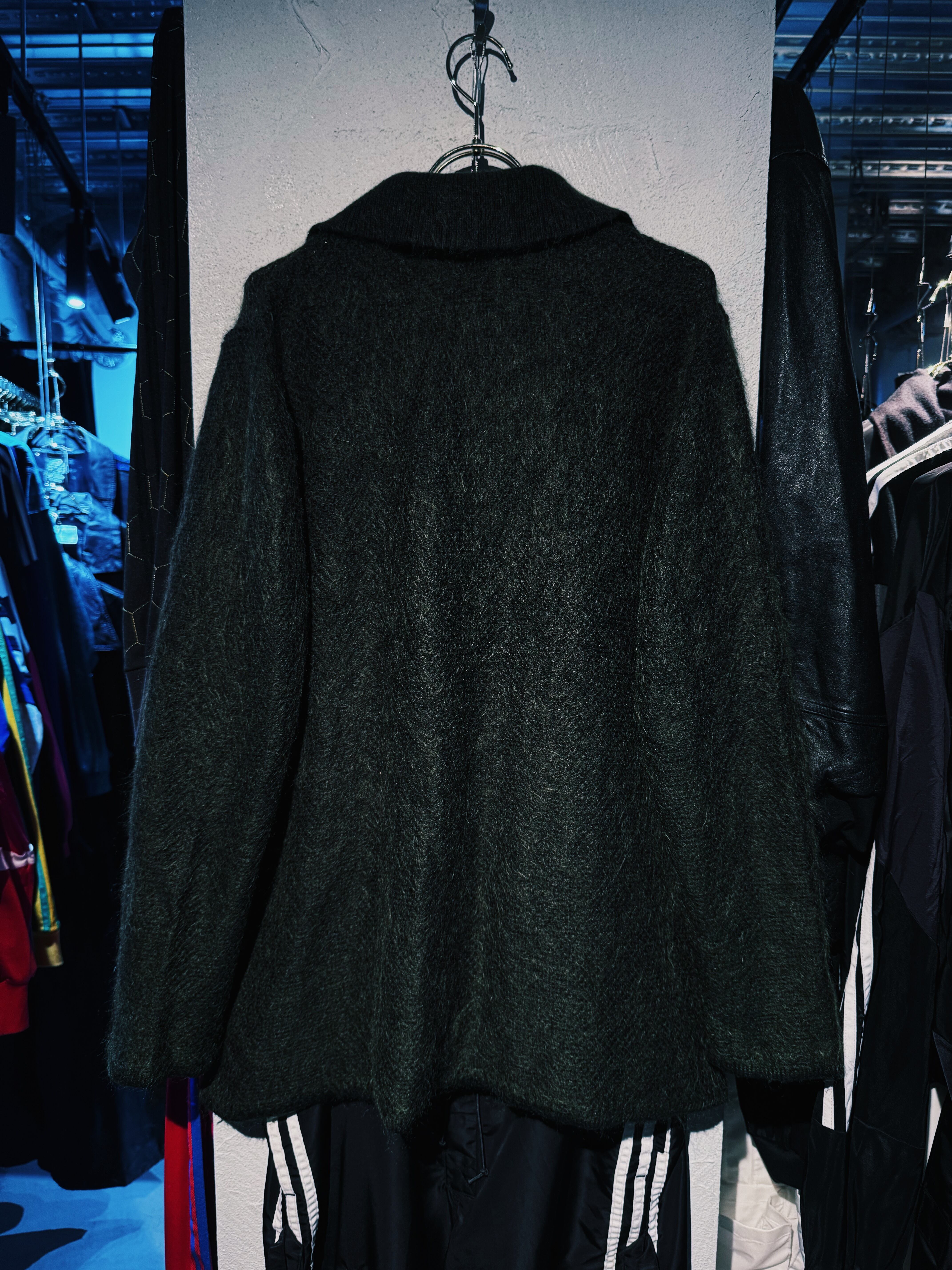 クラシックなシャツ襟デザインとカーディガンの快適さを兼ね備えたアイテム。深みのあるダークグリーンのカラーが特徴で、モヘア特有のふんわりとした質感が高級感を演出しています。