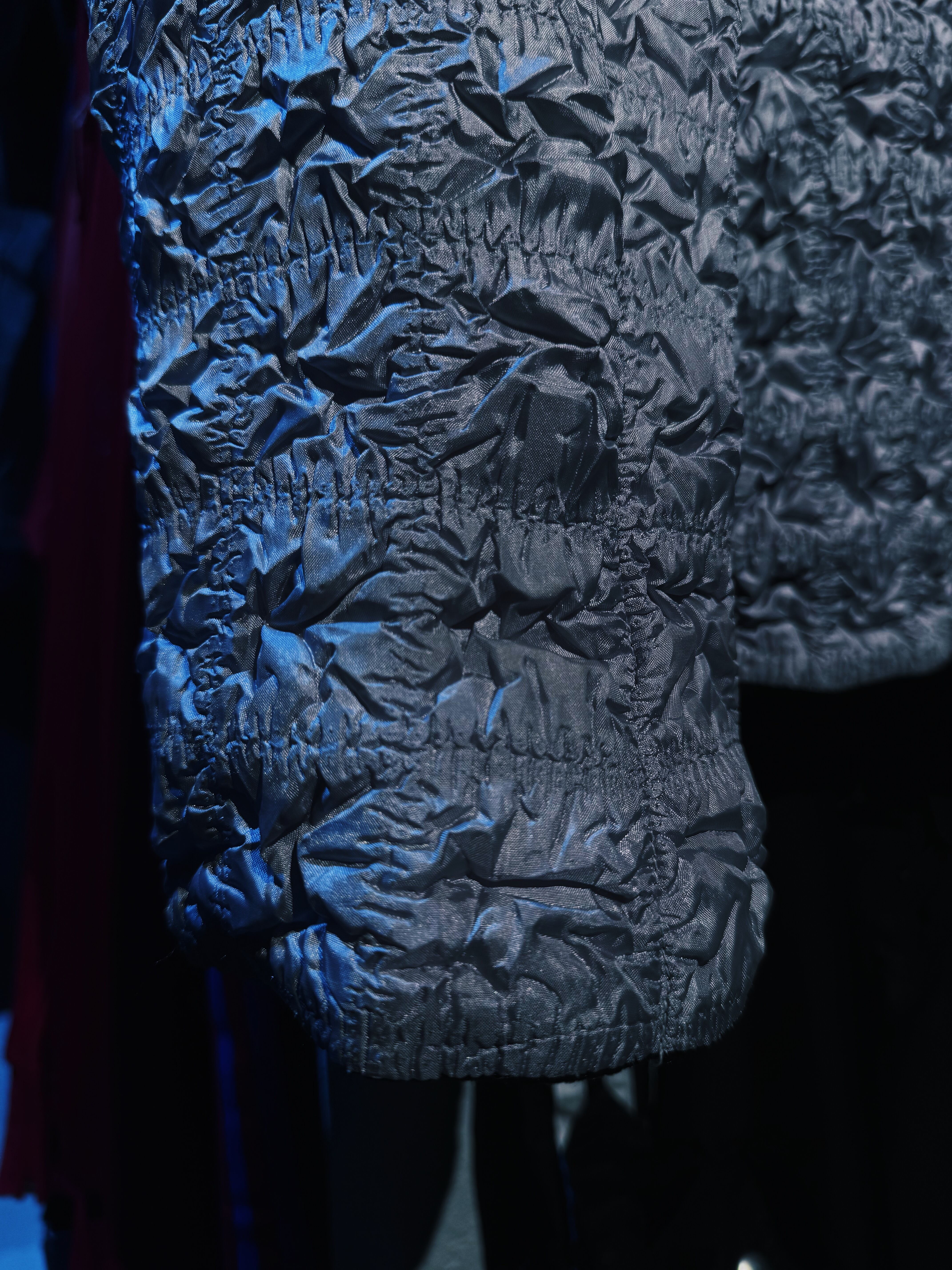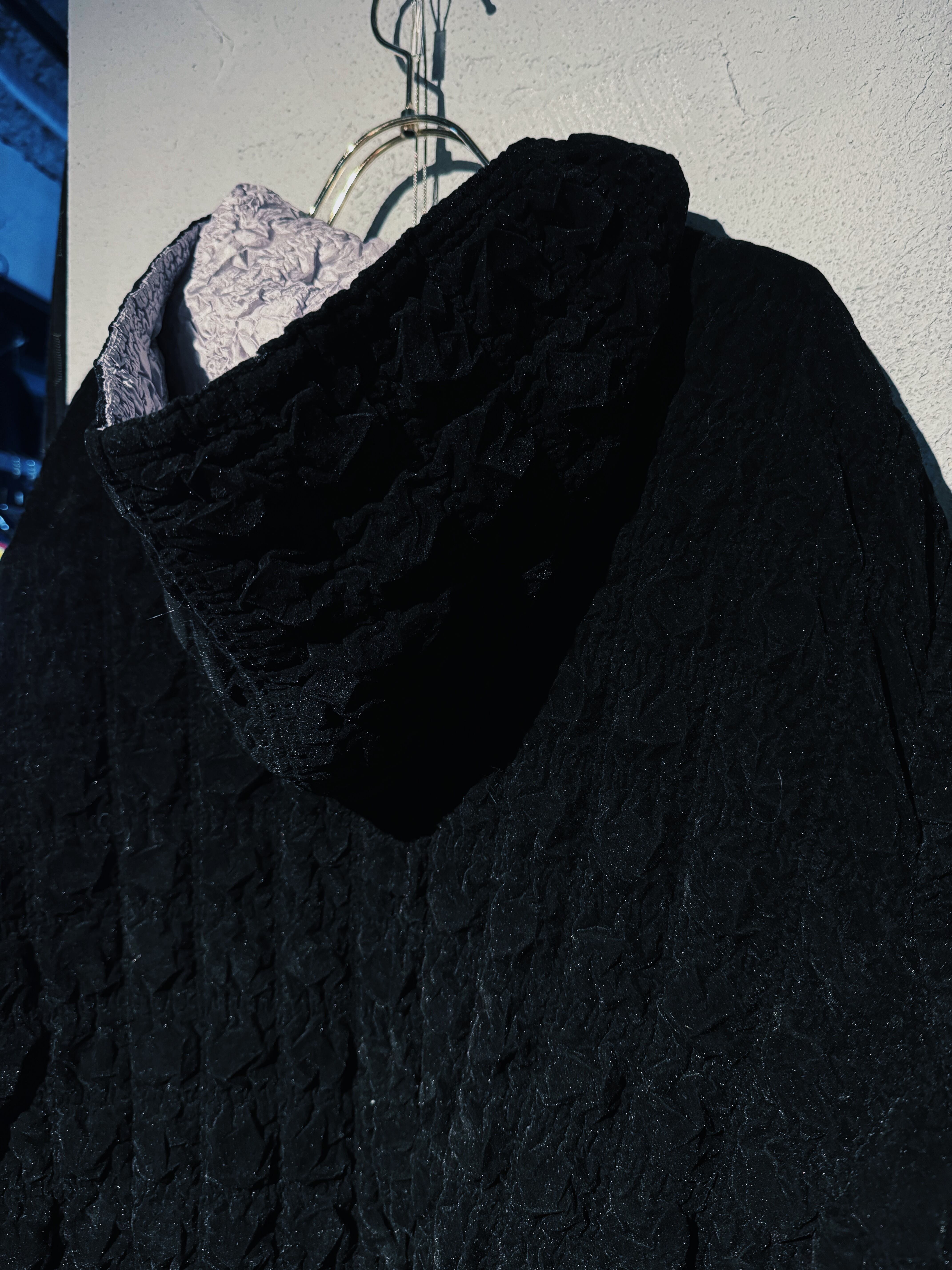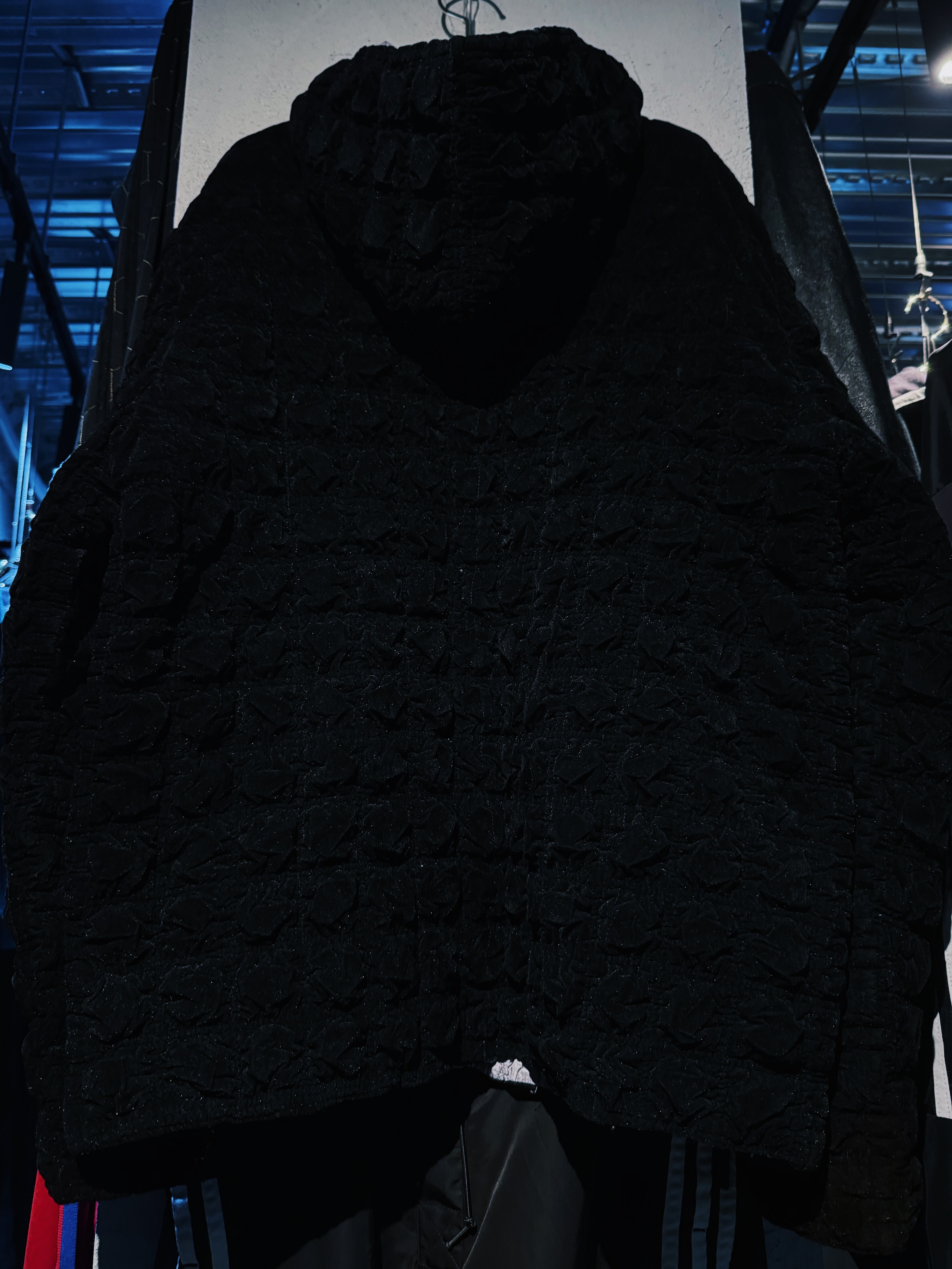 ユニークなテクスチャーと実用性を兼ね備えた一着。ポップコーンのような立体的なシワ加工が施された生地が特徴で、シンプルながらも存在感のあるデザインに仕上がっています。