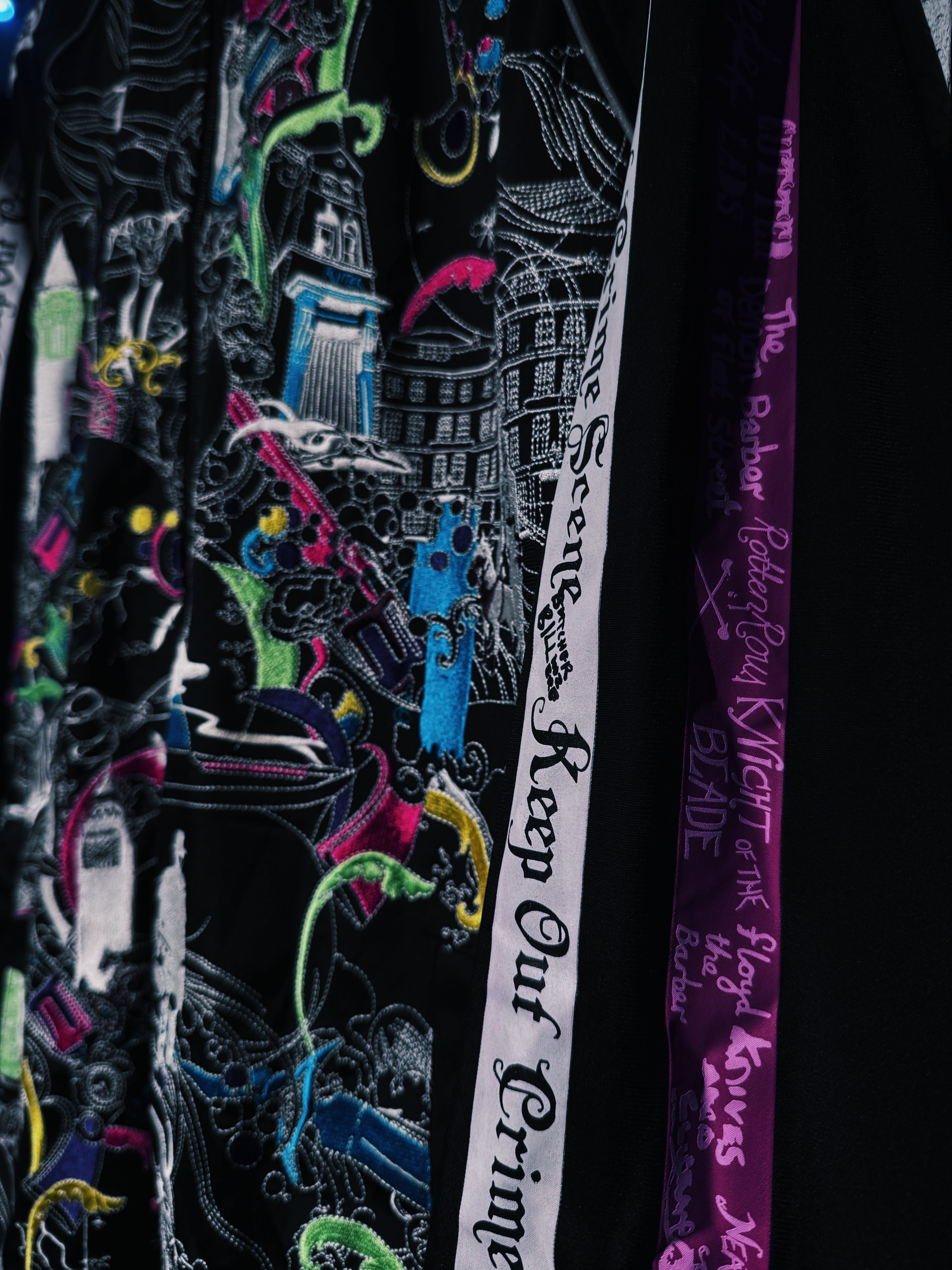 全面にわたって精巧な刺繍が施されたデザインが特徴的でブラックを基調にしつつ、ピンクのカラーアクセントが加えられ、サイドラインには「Keep Out」「Crime Scene」などのテキストがデザインされておりストリート感あふれる仕上がりとなっています。
